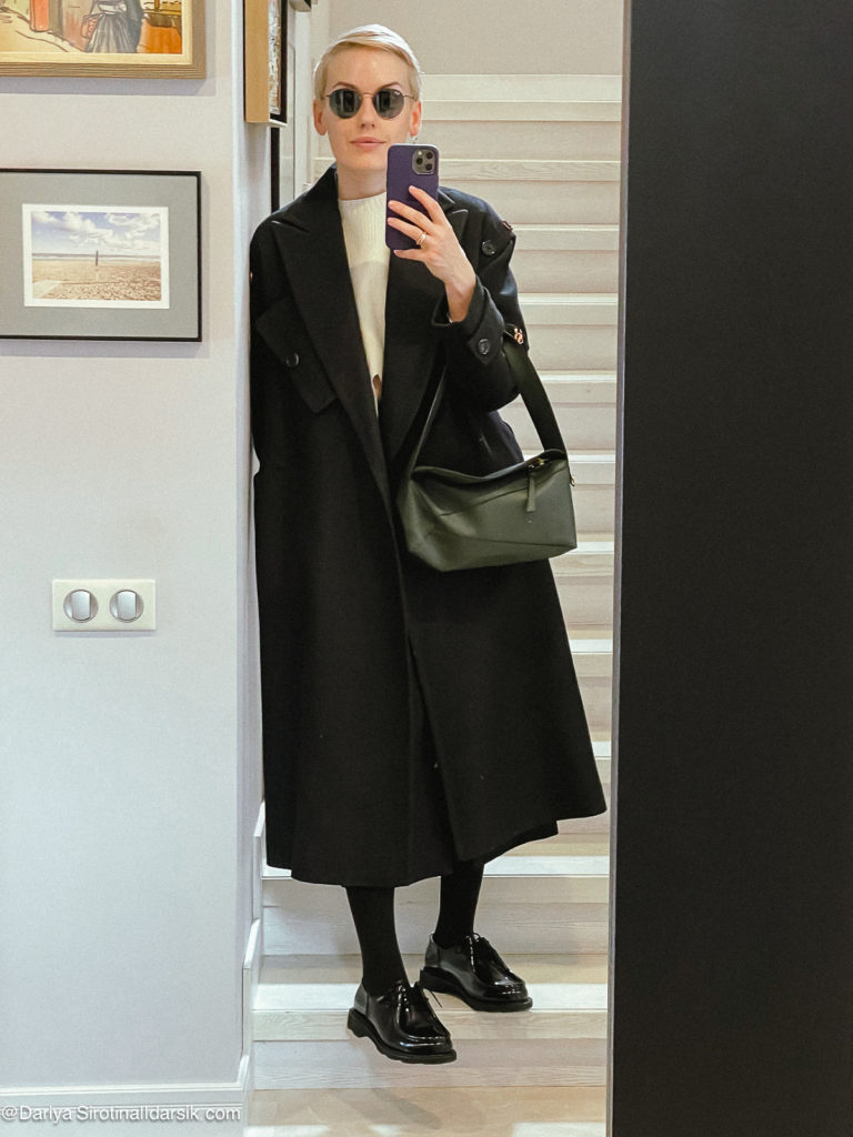 Пальто Proenza Schouler, ботинки Paraboot, сумка Loewe, очки RayBan