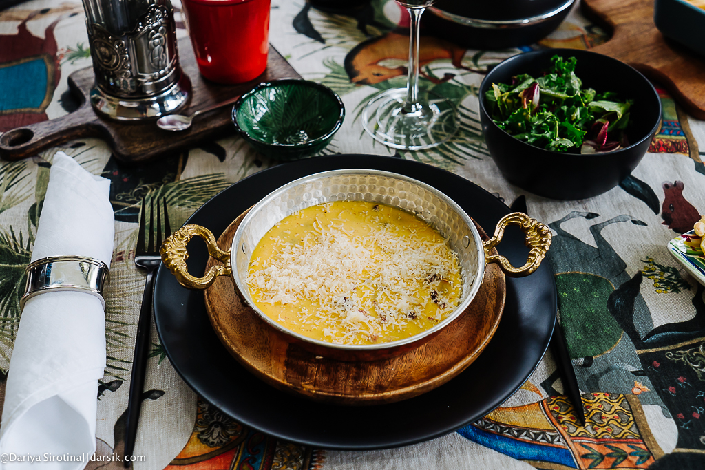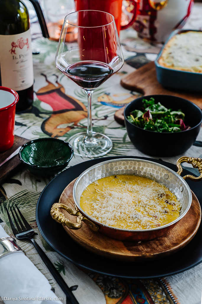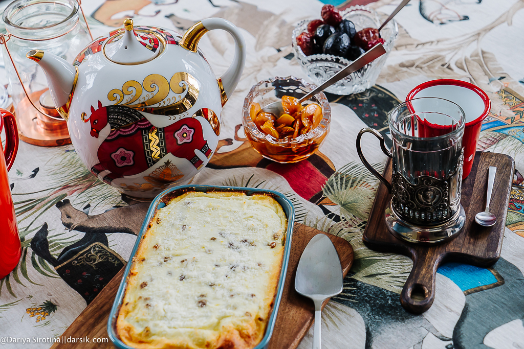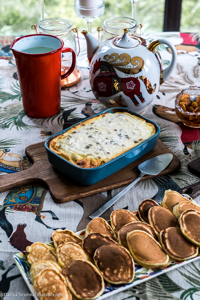 Основным блюдом (есть ли у бранча основное блюдо, кстати?) был омлет с армянской бастурмой, поданный в турецких сковородках. Еда, знаете ли, объединяет. В голубой керамической форме IKEA — нежная и диетическая творожная запеканка. На длинном прямоугольном блюде марки Gien — горячие оладушки. Ну и в последний момент решили открыть не игристое, а сразу бутылку красного и разложить салат по темным керамическим мискам из H&M. Котикам не досталось ни красного, ни бастурмы — они пожевали свою кочашью еду и легли спать. А мы сидели допоздна, смотрели на футбол и снег и говорили о том, что за непогодой всегда бывает солнце. Вместе мы его обязательно дождемся!