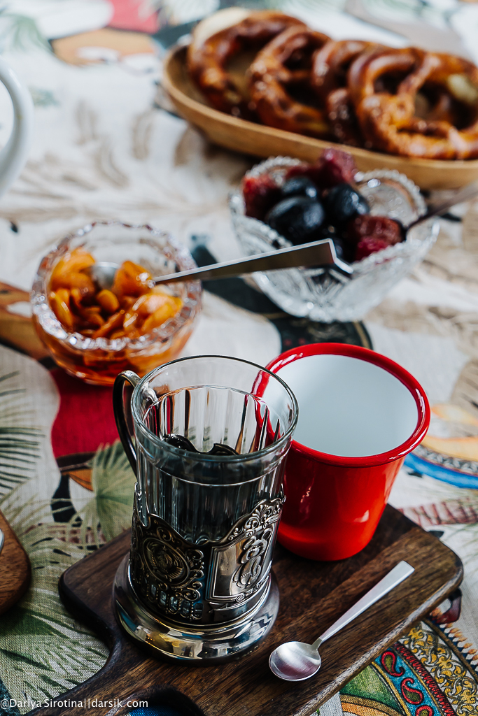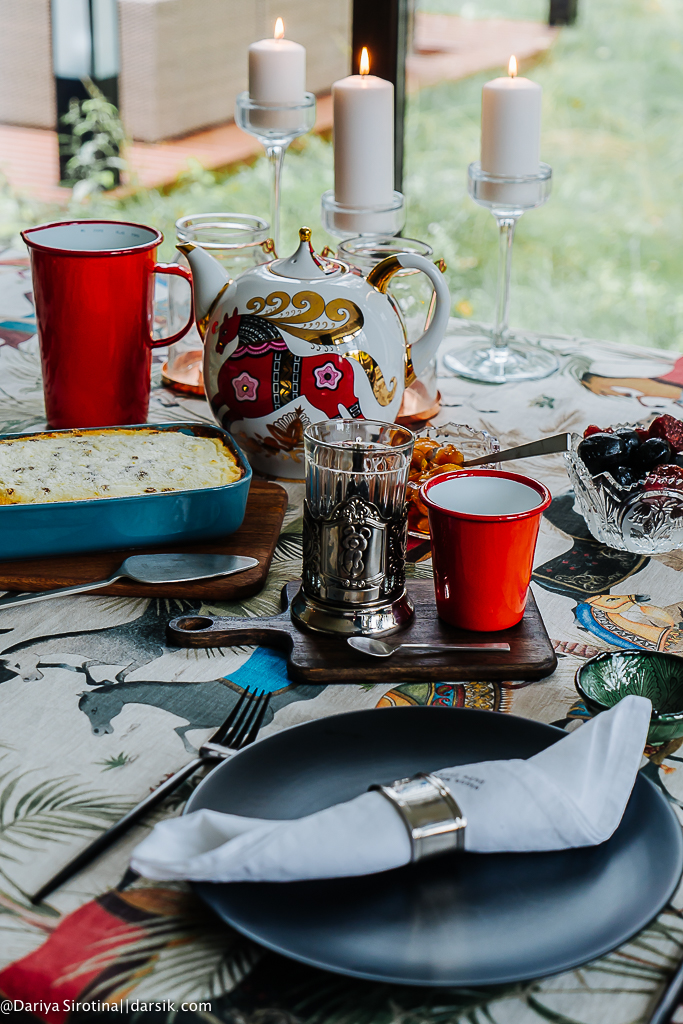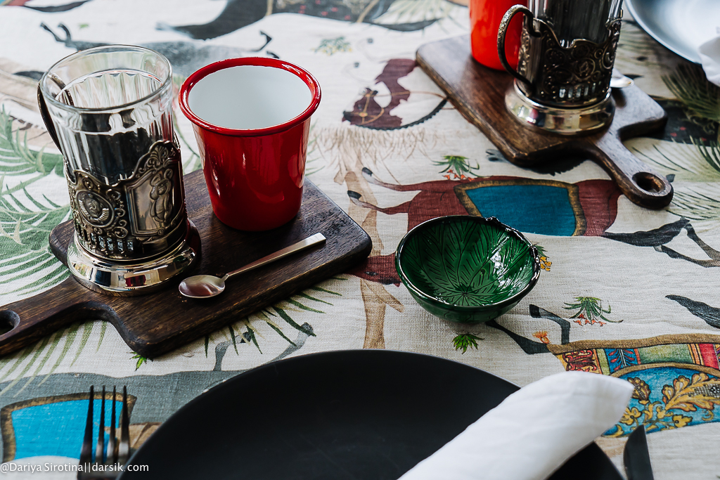 Скатерть яркая, тарелки нужны контрастные! Так решила я и достала самые простые черные тарелки H&M Home и черные же приборы, купленные по случаю на Aliexpress. Под чай достала граненые стаканы с подстаканниками, под воду — эмалированные стаканы британской марки Falcon. Мне очень нравится эта посуда — у нее ностальгическое, дачное, очаровательное настроение.