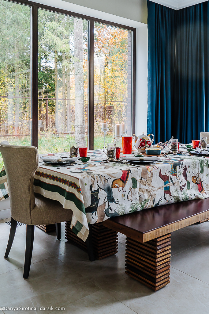 Для бранча я достала новую скатерть — совсем про нее забыла! Купила я ее в Италии, в Болонье, на самой большой в мире гастрономической ярмарке FICO, о которой рассказывала здесь. Льняная, с лошадками — и чайник Императорского фарфорового завода с красным новгородским конем к ней очень подошел. Чайник я достаю по самым праздничным поводам, это подарок близкого человека на новоселье.