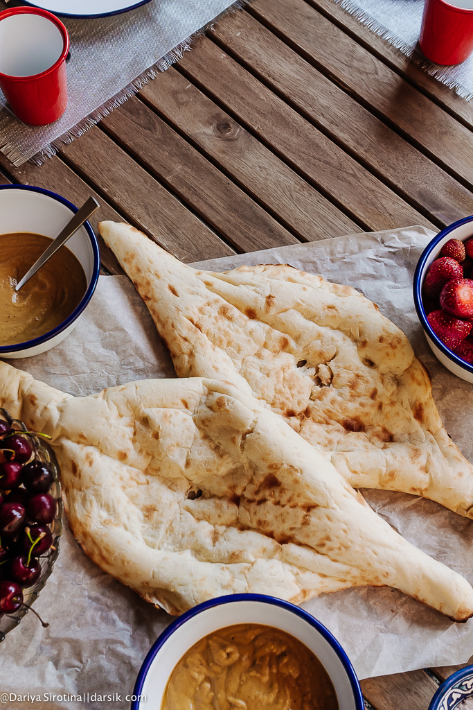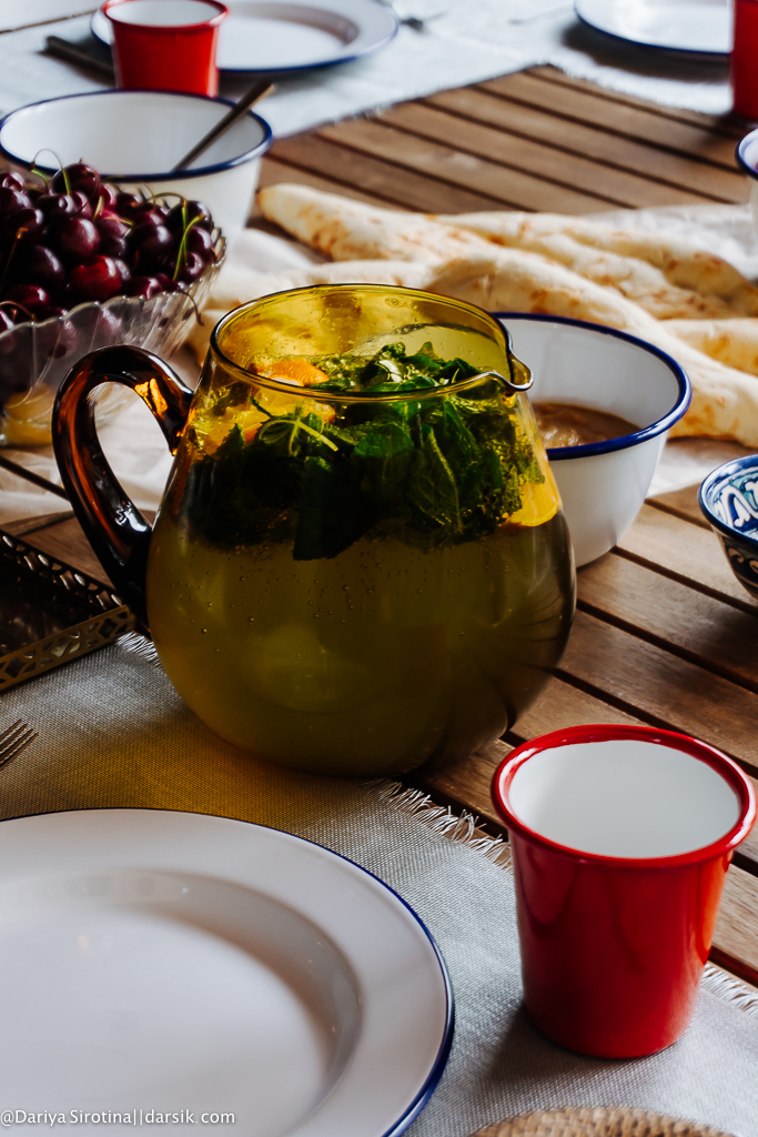 Накануне, в субботу вечером, мы готовили паэлью. Поэтому, пока разжигали в гриль, пока он разгорался, решено было имеющиеся овощи обжечь и сделать на следующий день овощную икру, хоровац. А свеклу пустить на холодный суп. Так что в воскресенье оставалось овощи почистить и измельчить блендером. Съездили в ближайший магазин — он у нас представляет собой грузинскую лавку, где традиционный грузинский хлеб печет в тонире дядька из Самарканда. Всюду наши! 😉 Черешня, клубника, абрикосы плюс варенье из белой черешни, тоже грузинское. Ароматный чай — я завариваю зеленый с лимоном, как в Узбекистане. И вода с лимоном и мятой, причем мята с моего, так сказать, огорода: у меня на террасе стоит несколько винных ящиков, в которых растут помидоры, мята, розмарин, фиолетовый базилик, душица. Сказали бы вы мне в прошлом году, что у меня будет огород, ха-ха.
