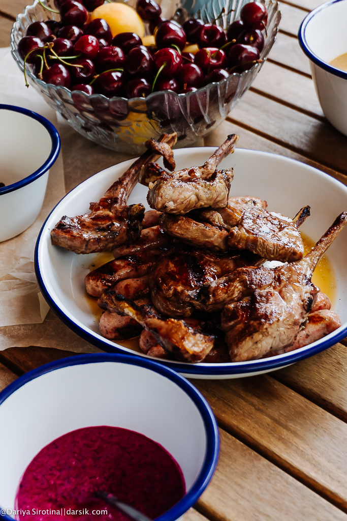 Баранина на гриле: Паша мариновал баранину в смеси оливкового масла и хереса, держал в холодильнике около 4 часов. Без соли и перца. Вышло идеально! Колбаски просто пожарили. О наших грилях я писала тут.