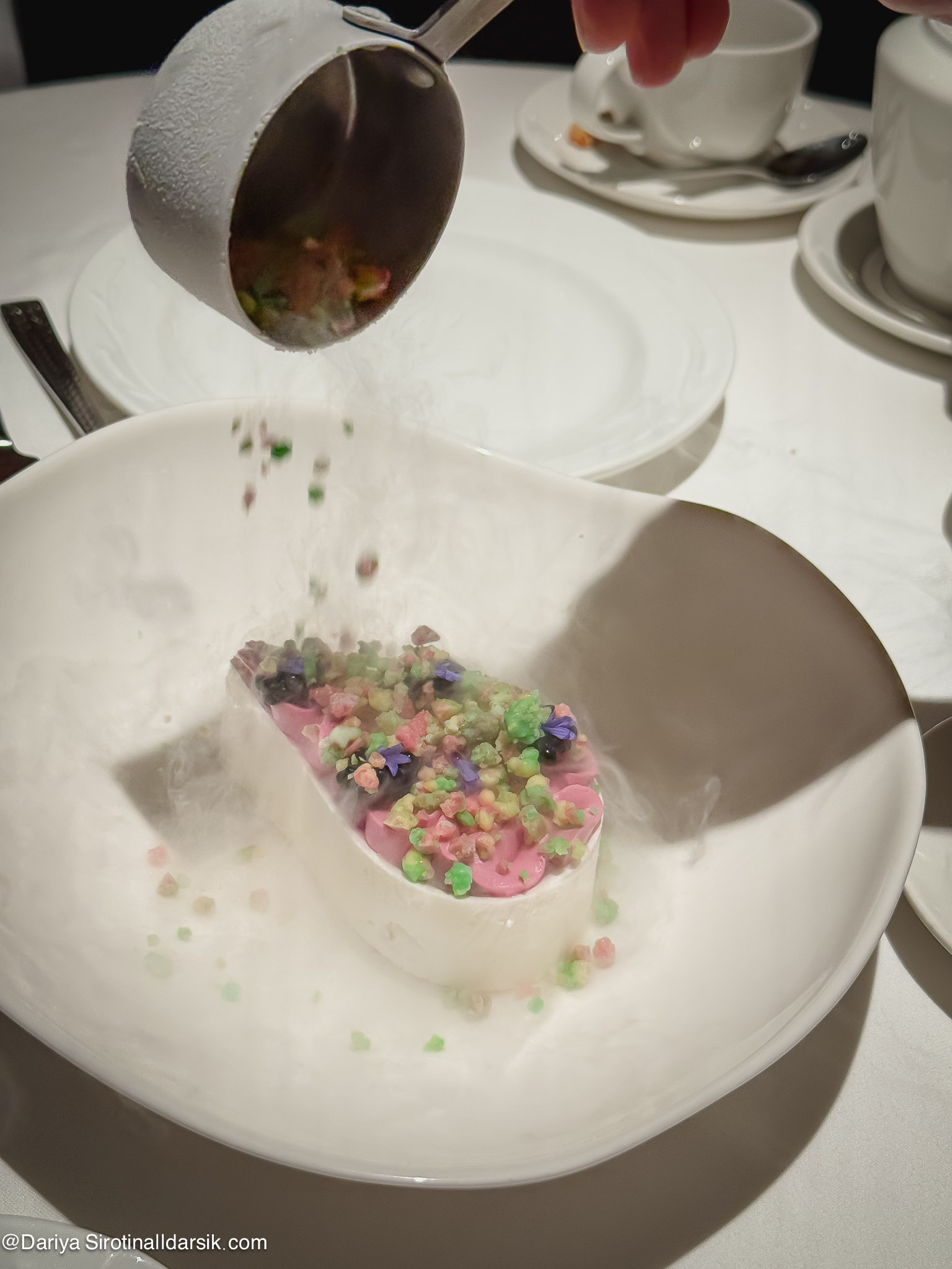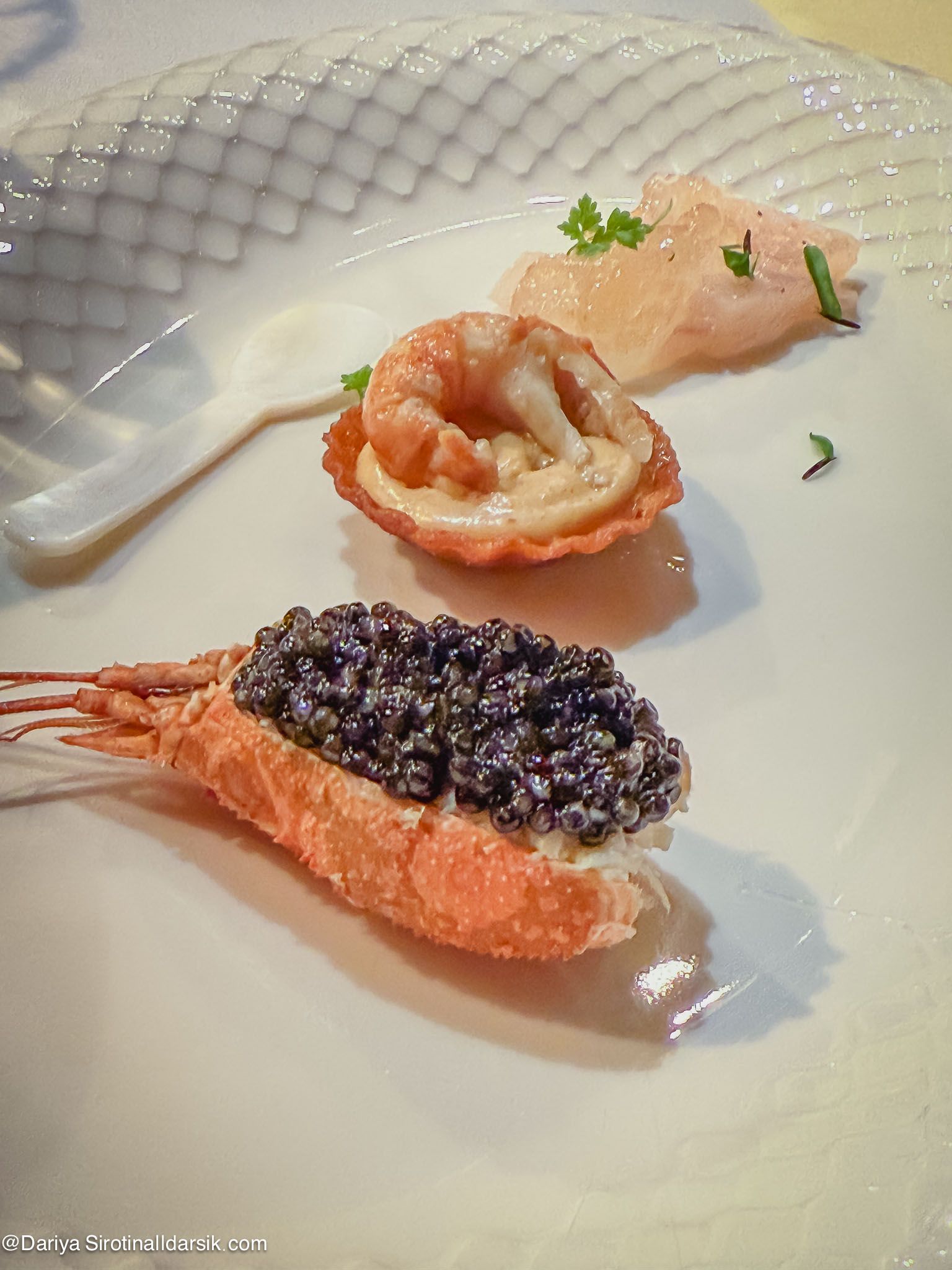 - Chef’s table в «Матрешке», для которого шеф Влад Пискунов постоянно придумывает и блестяще реализует новые идеи. Последний сет, на котором я была, — «Коронация» (на фото), вдохновленный коронационным обедом Александра III.