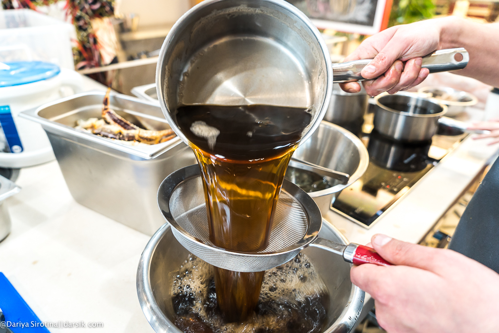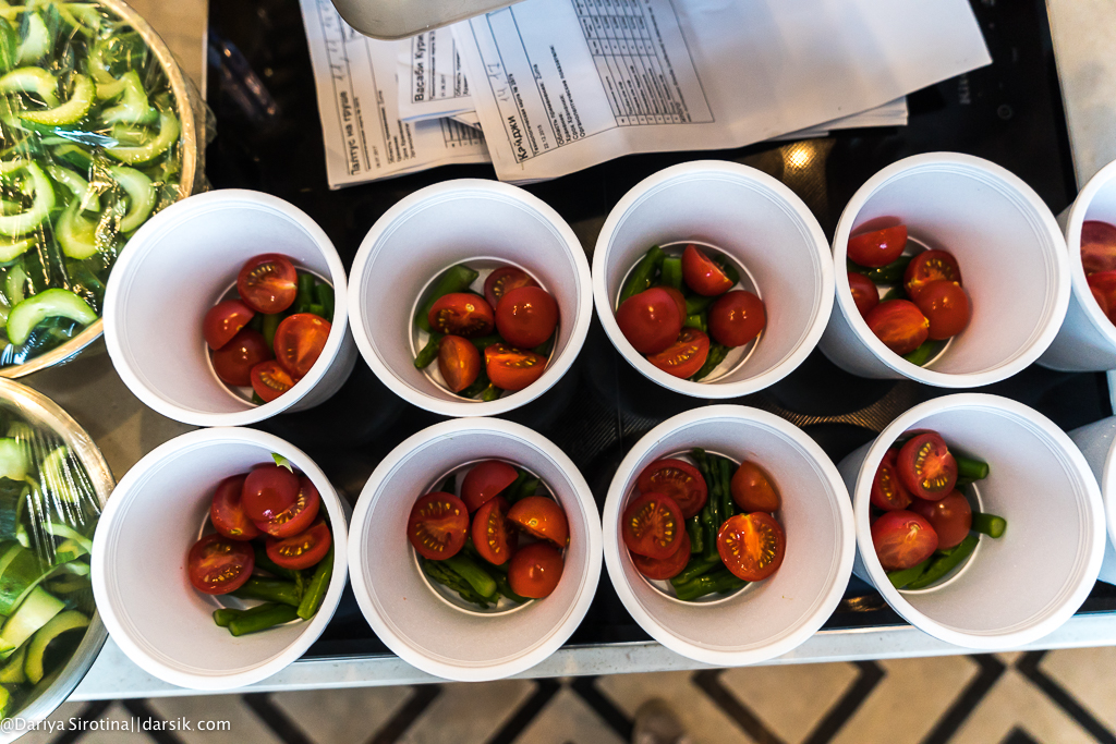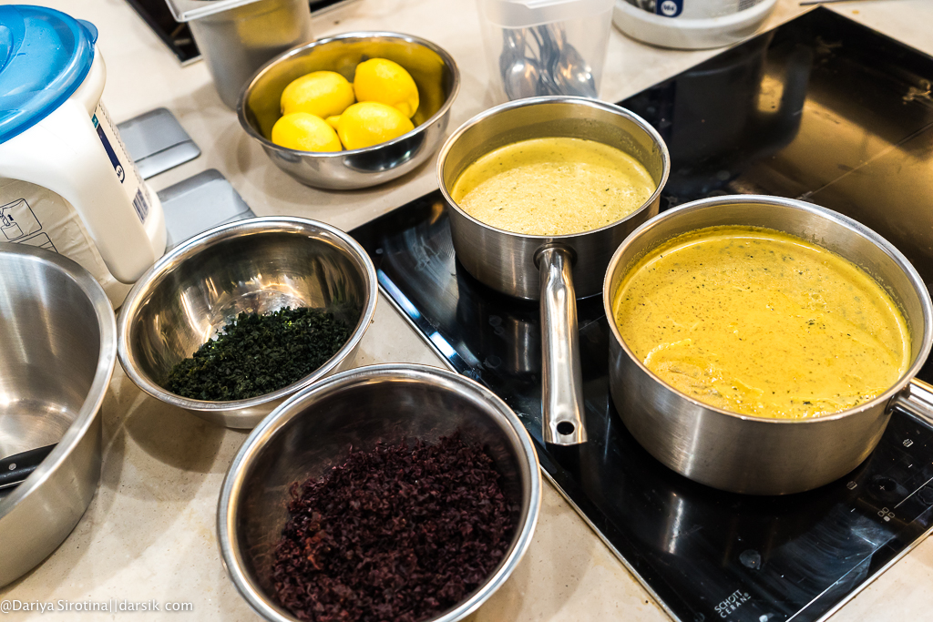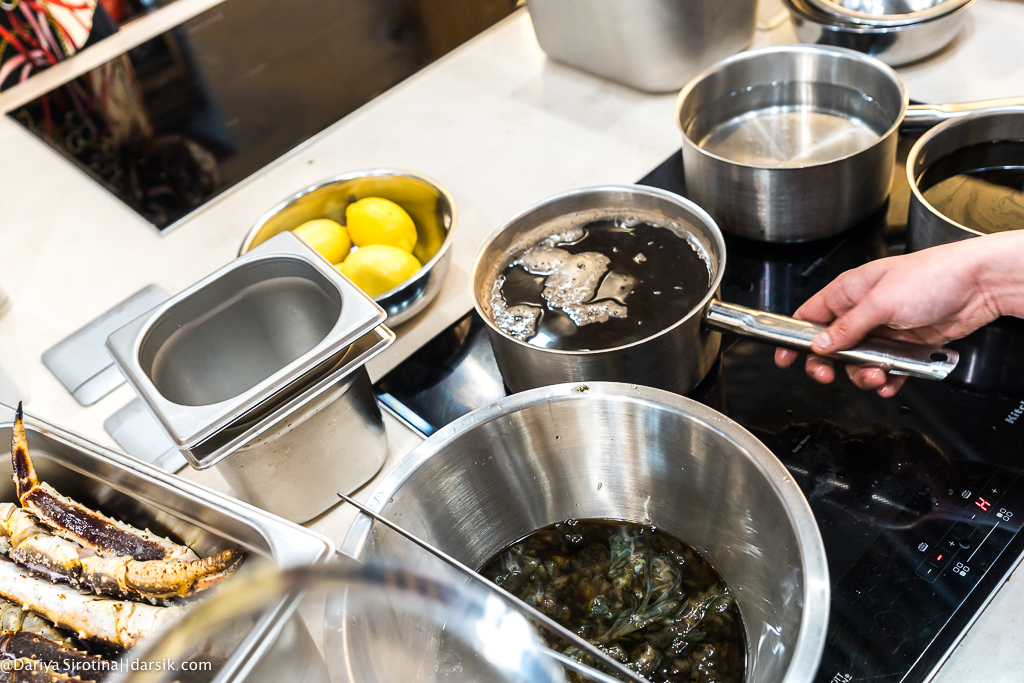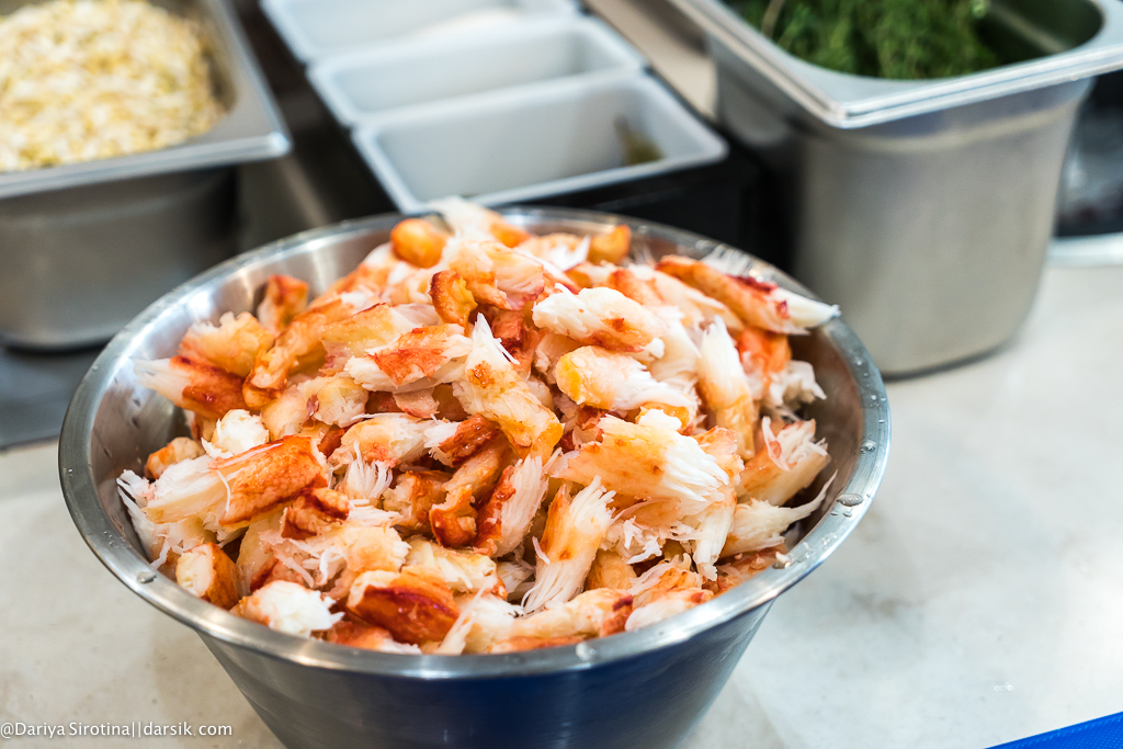 К счастью, первая половина дня была довольно расслабленной и можно было успеть выпить кофе, что-то сфотографировать, десять раз спросить, точно ли не сварятся яйца в массе, которая должна стать мороженым, посчитать для верности на калькуляторе все пропорции (лично я технологическую карту увидела в первый раз в жизни), пересчитать, забыть результат, посчитать снова, не отморозить руки, деля на части крабовое мясо, отмерить воображаемой линеечкой стебельки листиков кинзы нужной длины, смешать ингредиенты для пары соусов и даже ничего не перепутать.