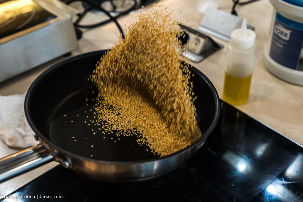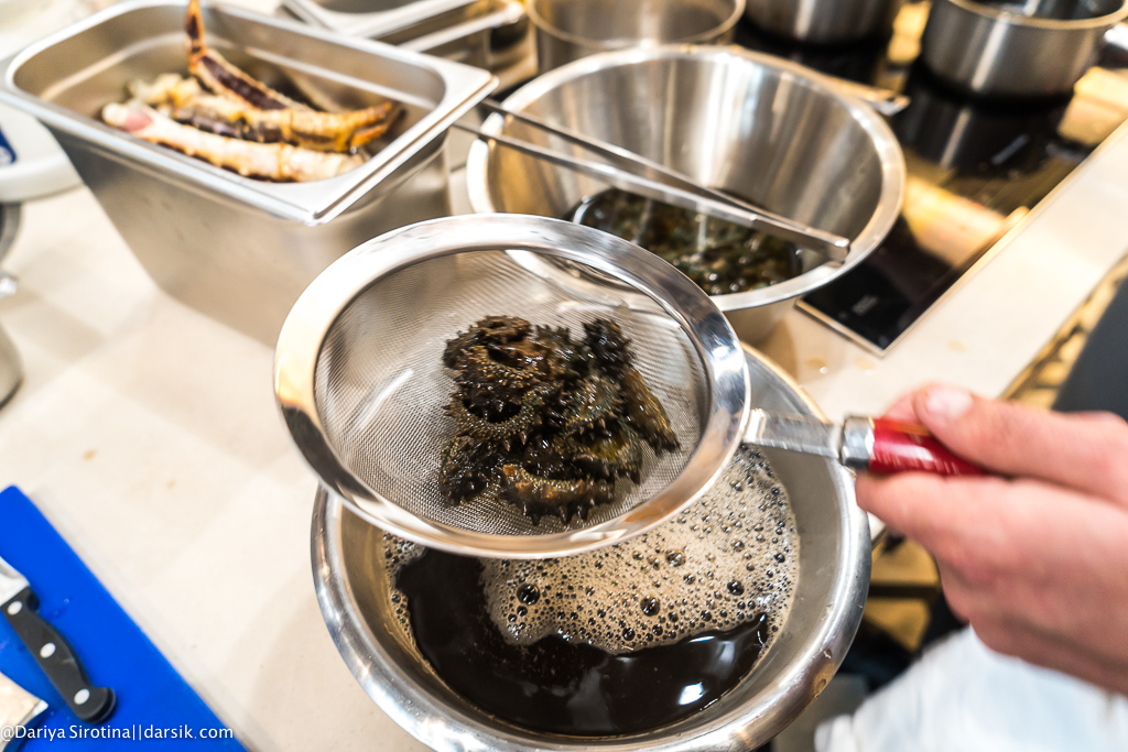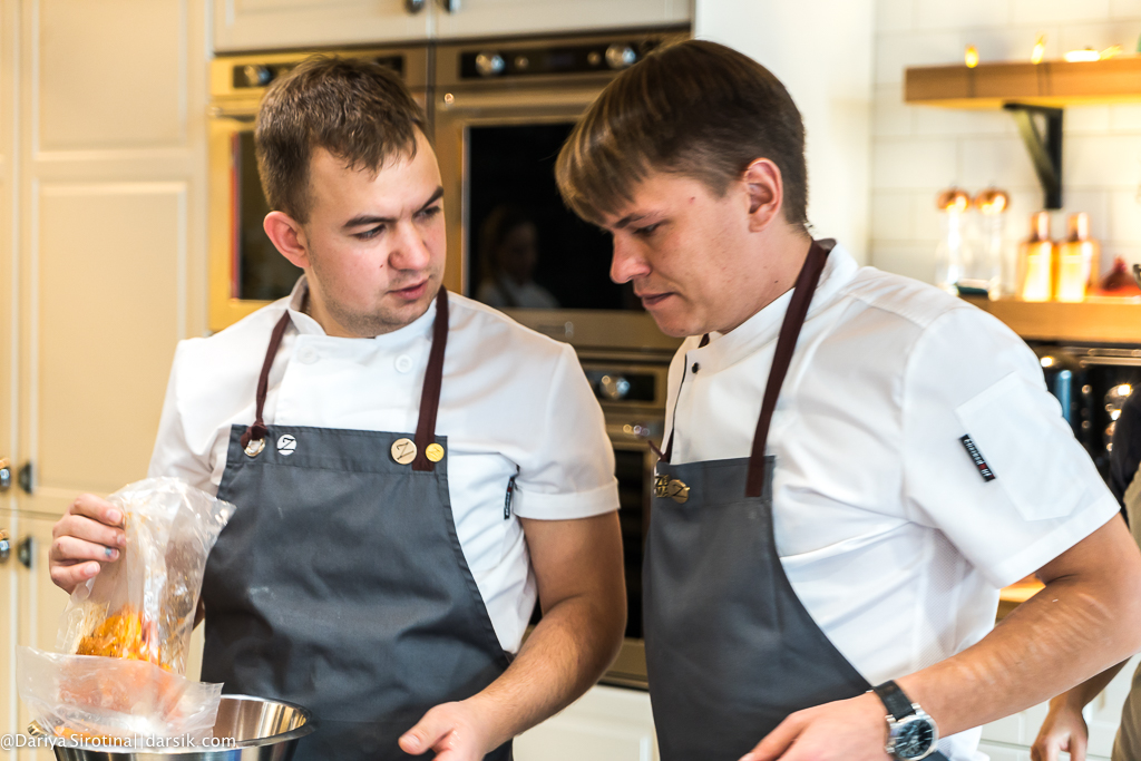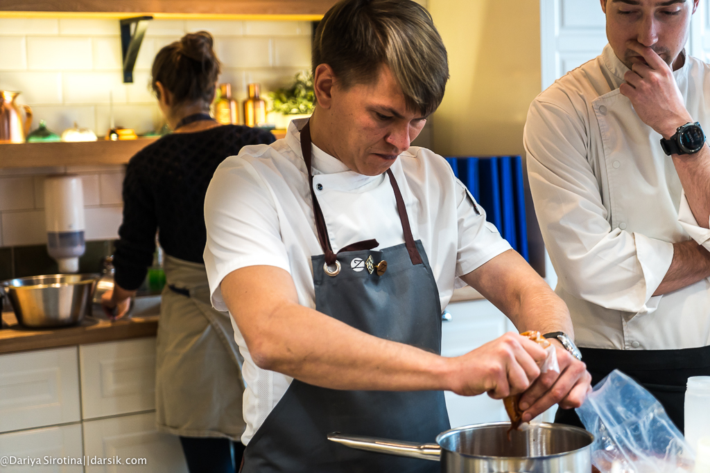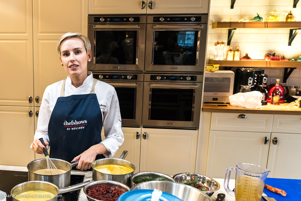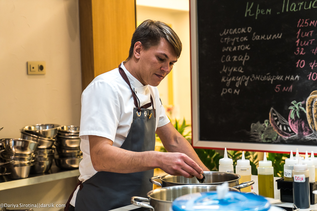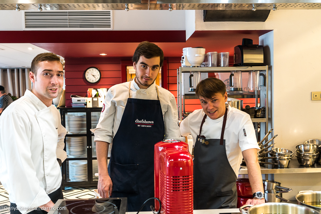 Представьте, что люди, которые собрались на мастер-класс, все в целом неплохие и даже хорошие ребята, но они не знают, как резать, где сковородки (вы тоже не знаете, где тут сковородки!), у них миллион вопросов у каждого, они все спрашивают по двадцать раз и все одновременно, им непонятно, насколько короткими должны быть стебельки у листиков кинзы, как резать гребешок — вдоль или поперек, как не оттяпать себе руку по локоть, разделывая краба. И представьте себе, что вы не орете как Гордон Рамзи, не кидаетесь посудой и даже покурить выходите всего раз в несколько часов, а объясняете, правите, объясняете, правите и так все время. Представили? Вот такая выдержка у Егора Анисимова, фантастическая просто. Я бы уже командовала миром, если бы у меня была такая.