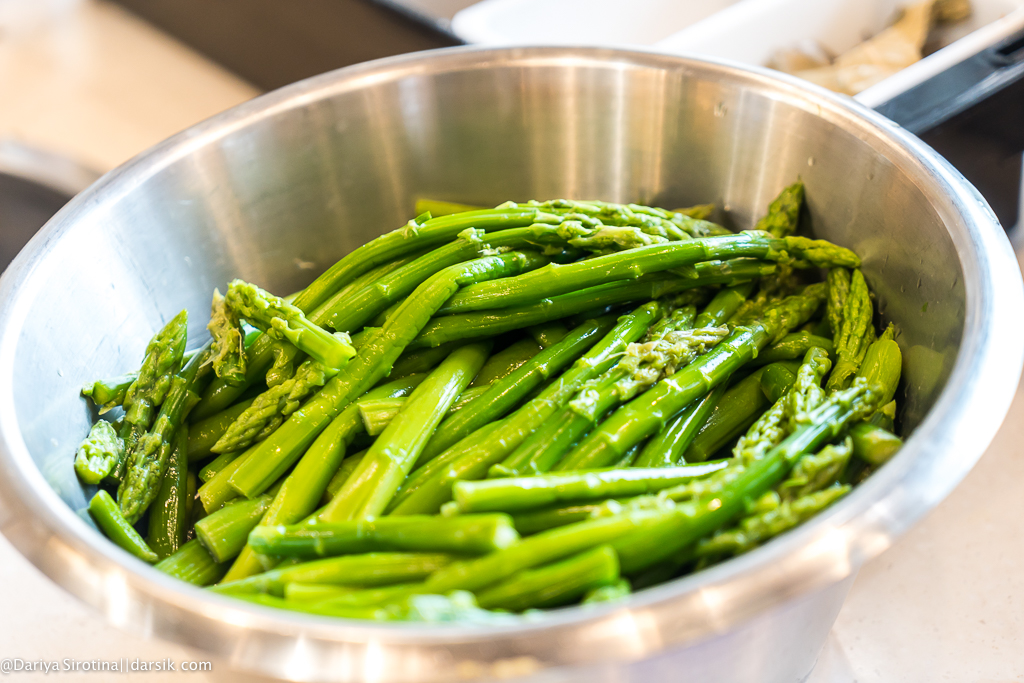 - приморский трубач «Кайджи», быстро обжаренный на сильном огне, со спаржей, помидорами-черри и соусом Соми;