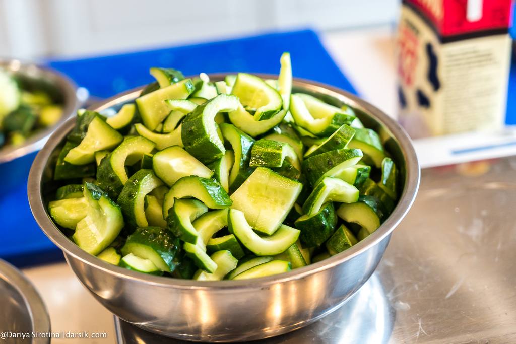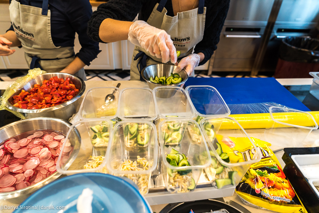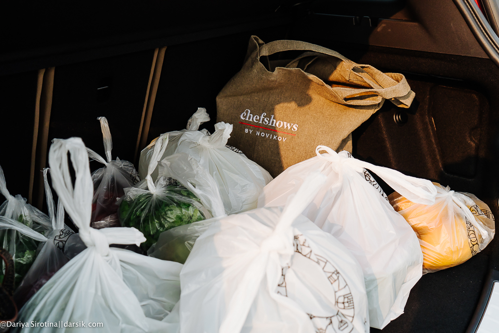 За полтора часа мы успели познакомиться, купить недостающее, загрузить покупки в мою машину и отправиться в Chefshows. Ощущения пока странные — я не очень люблю себя обнаруживать в компании незнакомых людей, не совсем понимаю, как будут развиваться дальше события, немного боюсь испортить продукты, которые мне, наверное, доверят, переживаю, что вдруг придется чистить ведро картошки, но стараюсь быть полезной — например, отвезти Егора и Алексея вместе со всеми покупками в школу. Оцените, какая классная у меня фирменная сумка, доставшаяся мне еще после курса «Школа Степфордских жен«.