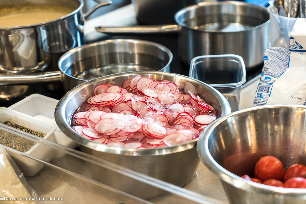К шести вечера, когда мы свою еду уже приготовили и даже успели съесть, время начало неприлично ускоряться. В восемь начинался ужин для гостей Chefshows, в 8.15 нужно было отдать первую подачу, успеть всех накормить хотя бы к десяти вечера, нигде не облажаться, не перебить тарелки, не наляпать на них соуса, сделать не только красиво, но и вкусно, не заставлять гостей долго ждать и не пасть с копыт. Четверо из семерых участников мастер-класса от приготовления ужина для гостей отстранились, в итоге нас на кухне осталось куда меньше, чем было в начале. Главное, как я могу подтвердить, будучи и клиентом, и условным поваром — это вовремя отдать первую подачу, потому что никто не хочет голодным долго сидеть за пустым столом. В целом, конечно, не надо еще и заставлять гостей слишком долго ждать между блюдами, но первая подача — это святое. А в ней, как назло, куча тоненьких слайсов редиски, которые нужно выложить аккуратно на десятки тарелок…