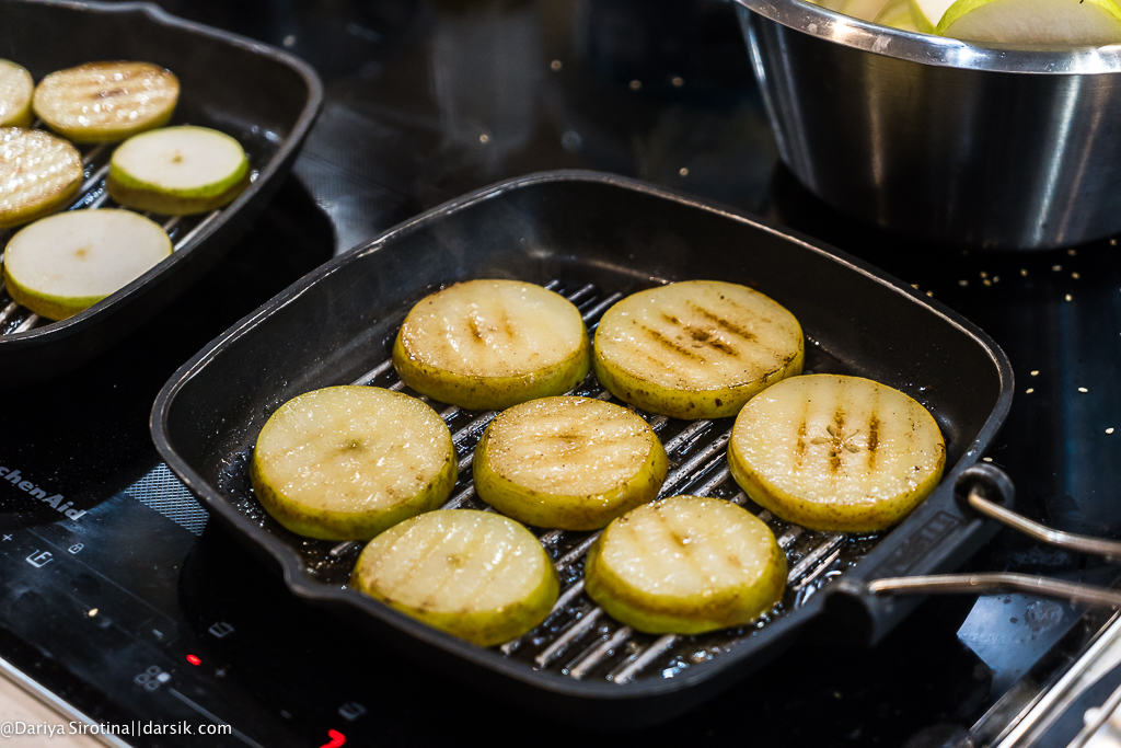 Шестая подача: мороженое с васаби и нори в карамели. Очень вкусный десерт! Сливочное сладкое мороженое с острым вкусом васаби и хрустящие водоросли-нори в карамели на подушке из припущенной в сливочном масле сладкой груши. Вряд ли кто-то будет варить мороженое с васаби дома, но вот просто подавая мороженое, почему бы не обжарить грушу и не выложить потом на нее холодный шарик?