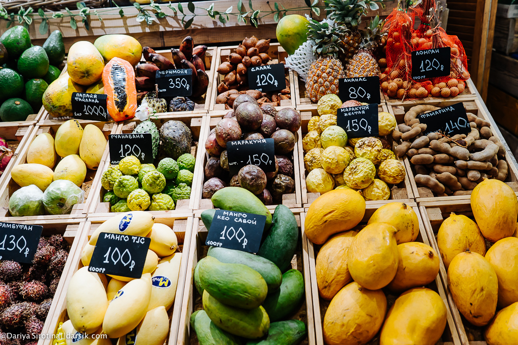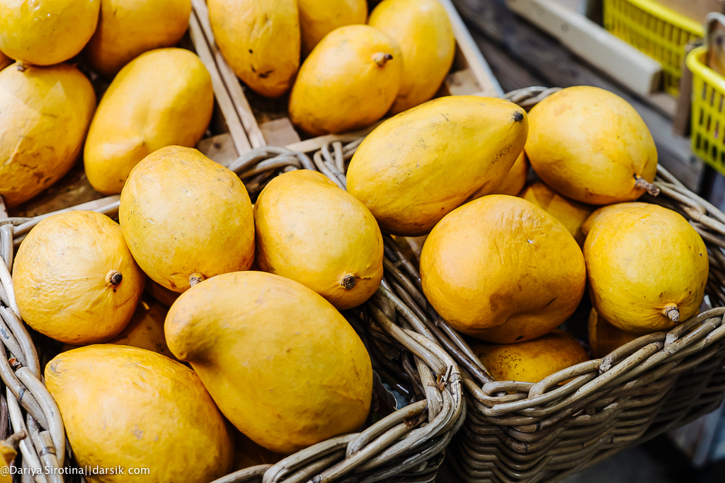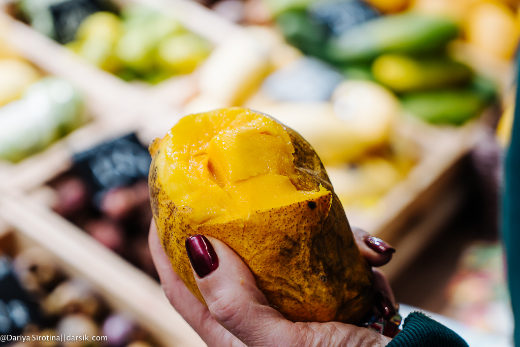 Даниловский рынок наконец окончательно преобразился! Один из прилавков, на который и я, и Егор с Алексеем советуем вам обратить пристальное внимание, — это прилавок с экзотическими фруктами. Вот эти желтые манго — самые сладкие, которые я в своей жизни ела. Если будете (а я уверена, что будете!) готовить салат с крабом, рецептом которого я с вами поделюсь ниже, старайтесь брать манго именно такие.