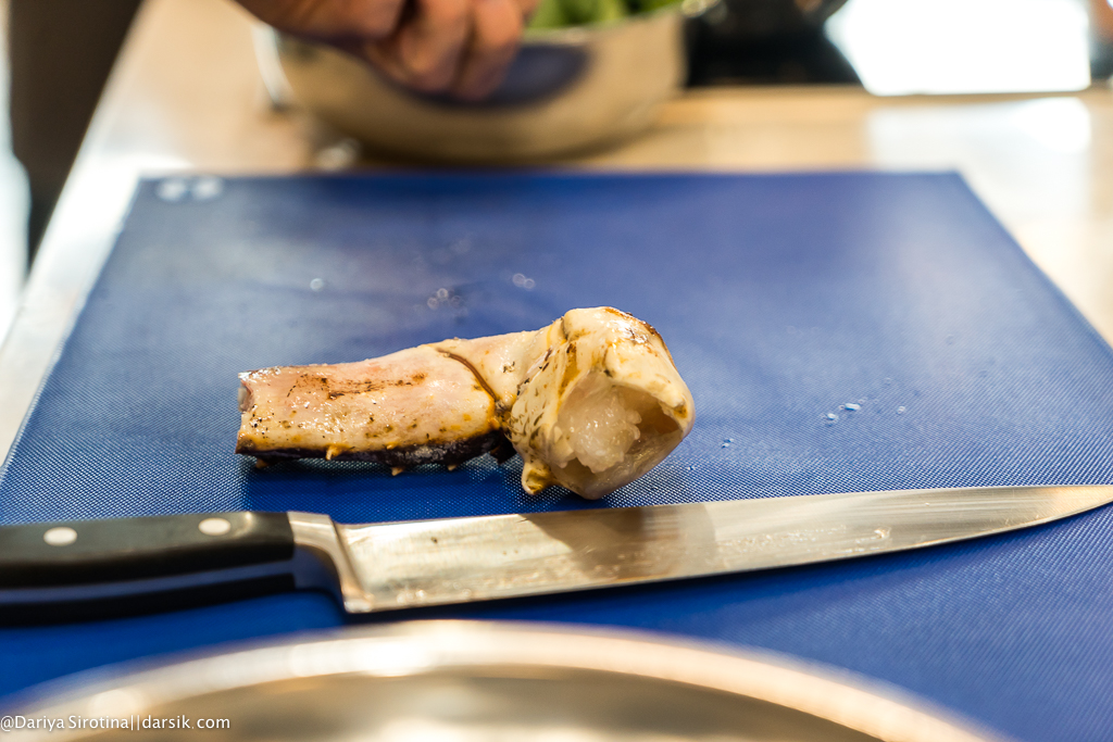 Итак, первая подача: «Юми Ясай» с трепангом, морским виноградом, асцидией пурпурной и гребешком. Салат, в котором огромную роль играет свежий, морской, йодистый вкус морепродуктов. Мне понравилось сочетание мягкой и хрустящей текстуры (например, шпинат тут был специально обработан для того, чтобы быть плотным и хрустящим), свежесть вкуса овощей дополняла морскую свежесть гребешка и трепанга, водоросли были приятно вязкими и йодистыми. Огурцы, правда, резать надо тонкими слайсами… Приятно было, что шеф с нами в итоге согласился, хотя, наверное, он просто дипломат.