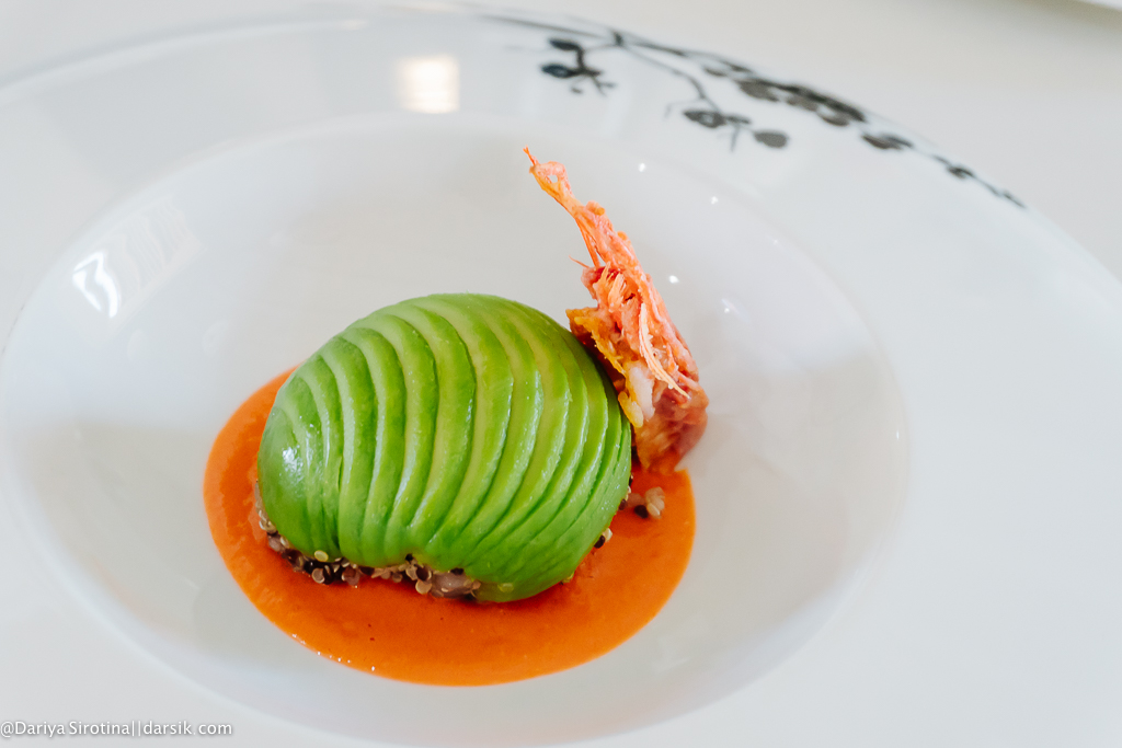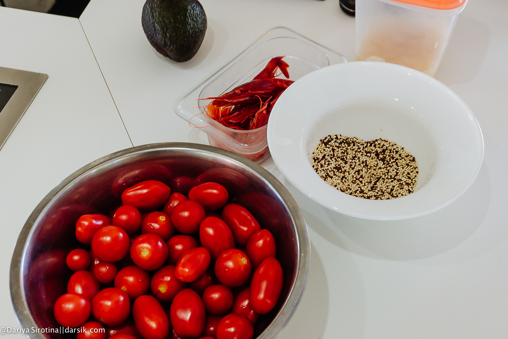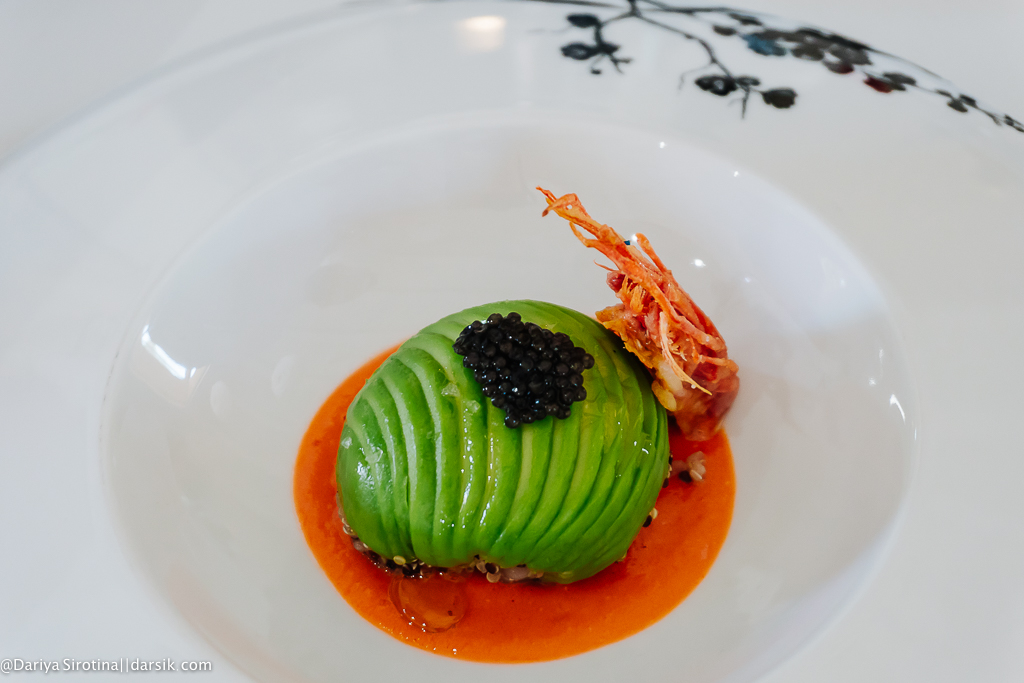 Первое блюдо сета — закуска с красными сицилийскими креветками, томатами, киноа и черной икрой. Т.к. я сырые креветки не ем, в моем блюде они были заменены на сырое филе сибаса.