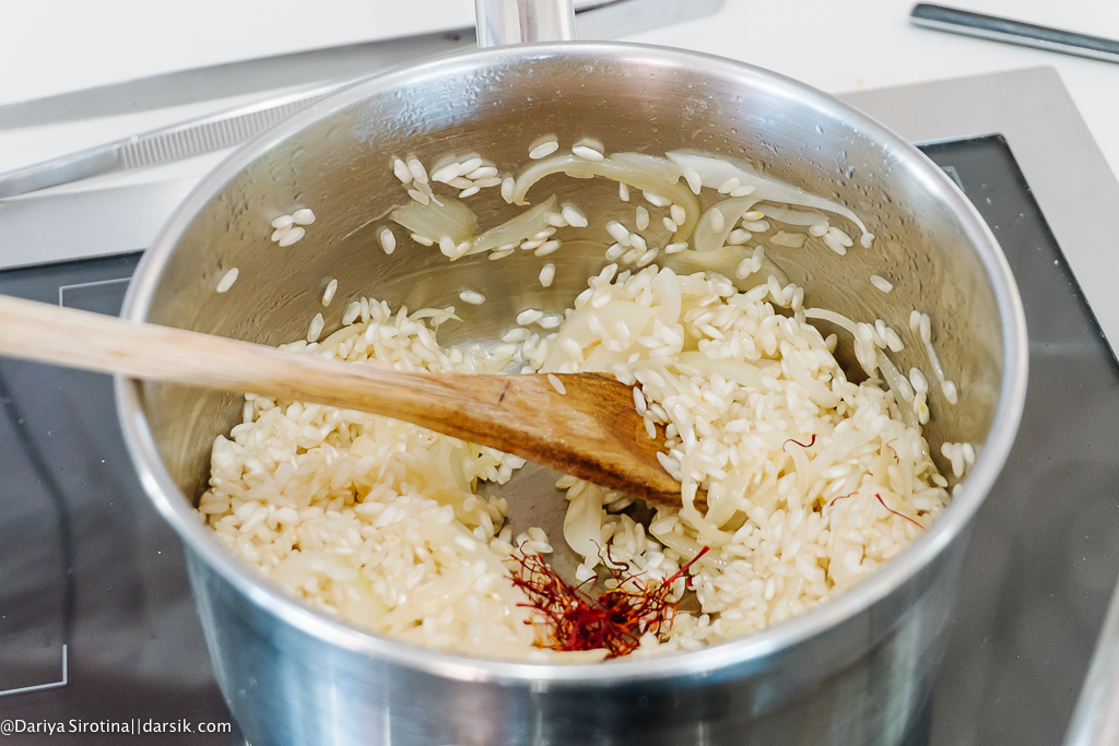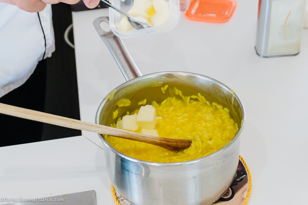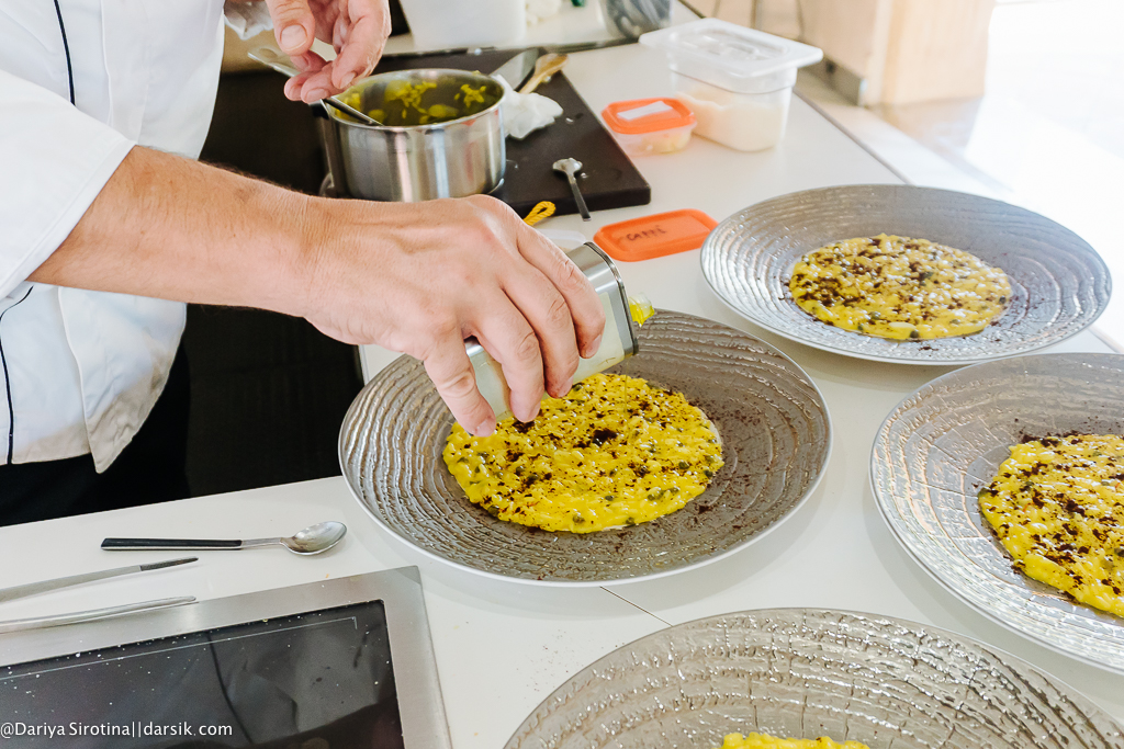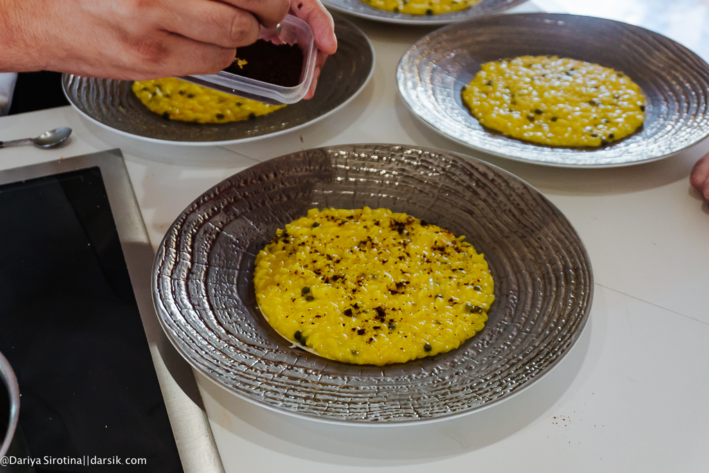 Вторая подача — ризотто с шафраном, каперсами и кофе. Интересно, что для его приготовления Итало не использует ни вино, ни бульон — только воду. Говорит, что предпочитает, чтобы вкус риса был заметным.