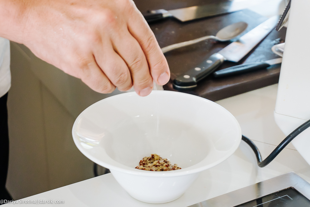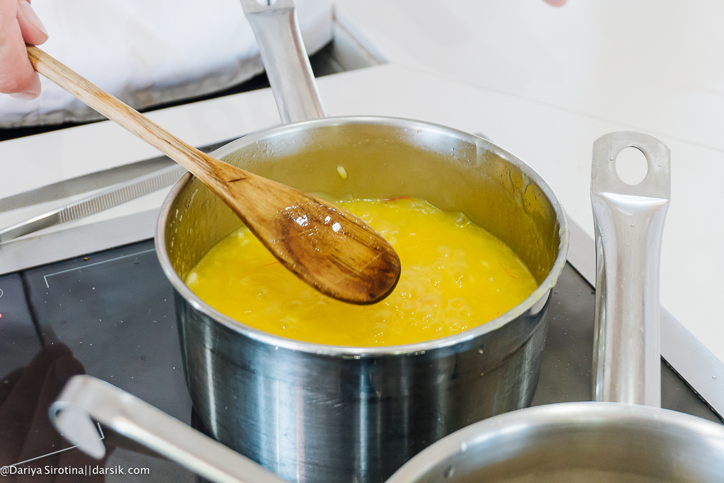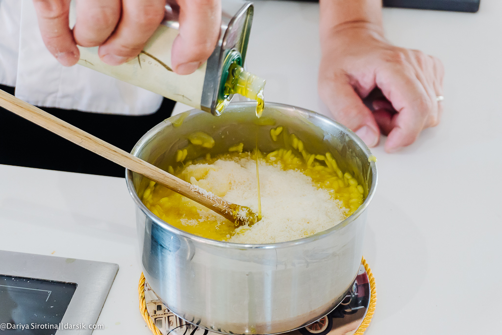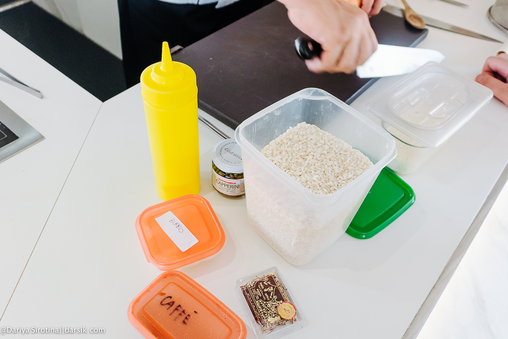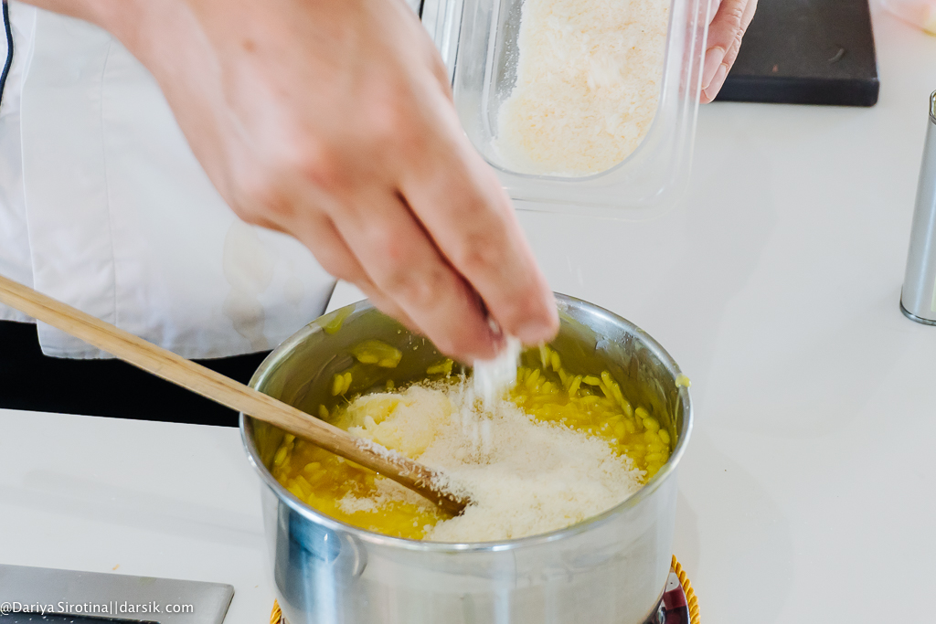 Вторая подача — ризотто с шафраном, каперсами и кофе. Интересно, что для его приготовления Итало не использует ни вино, ни бульон — только воду. Говорит, что предпочитает, чтобы вкус риса был заметным.