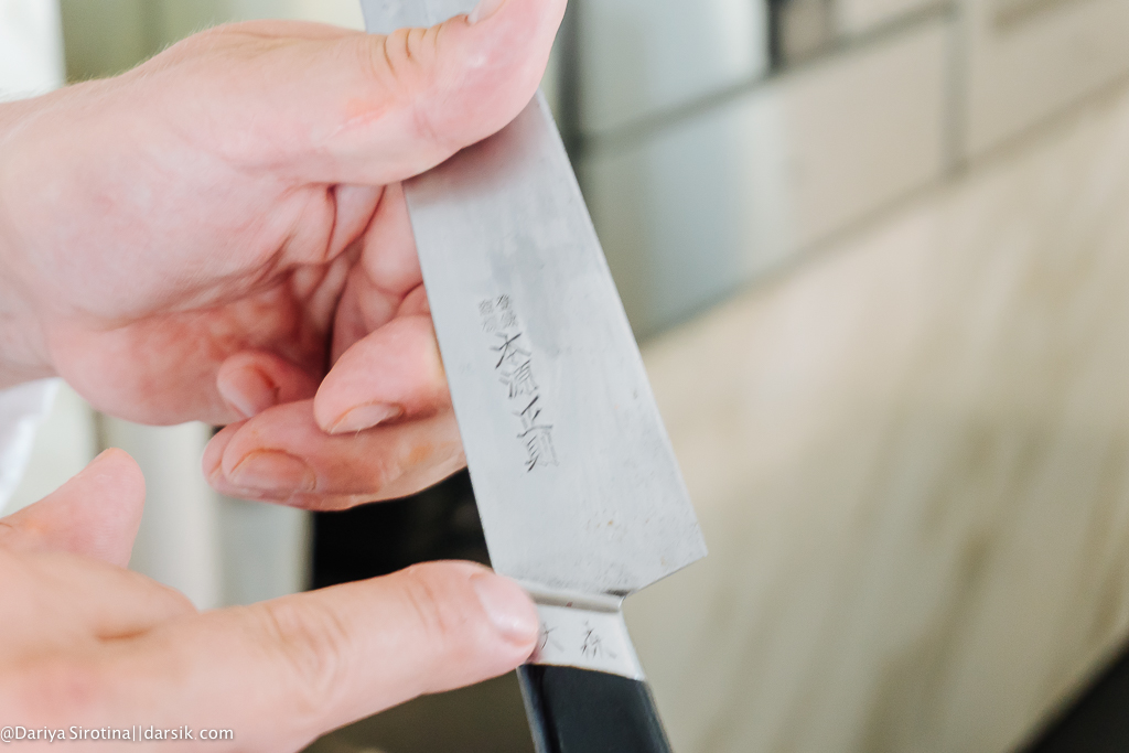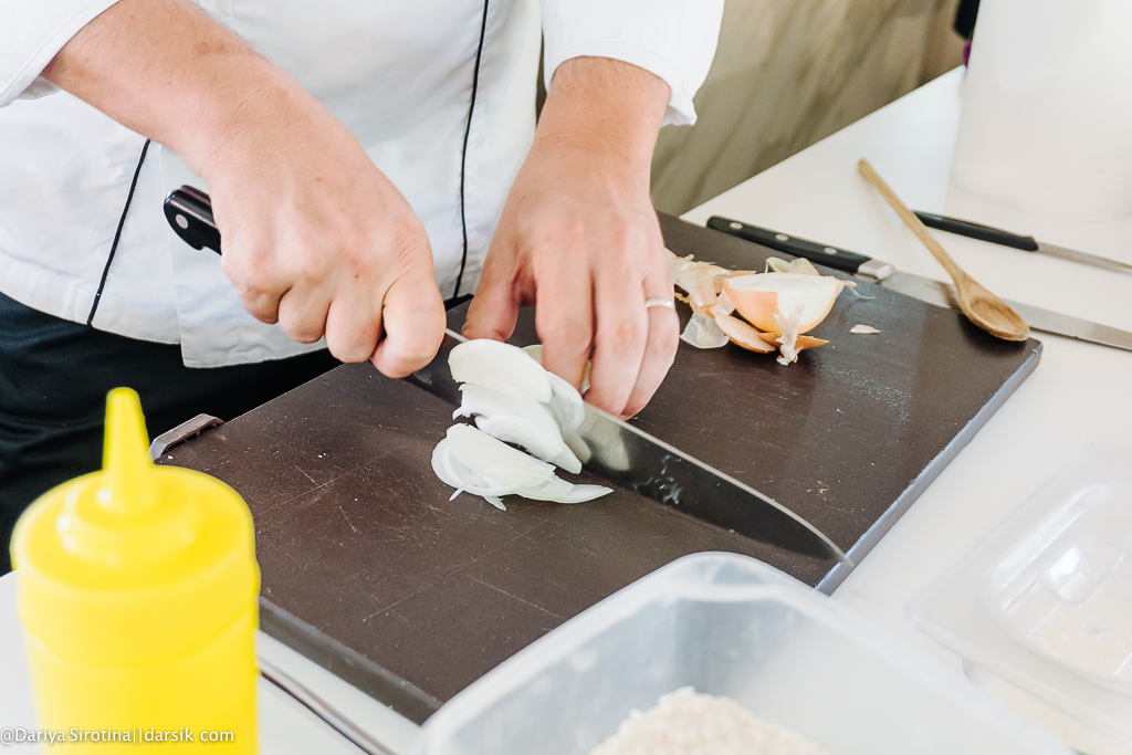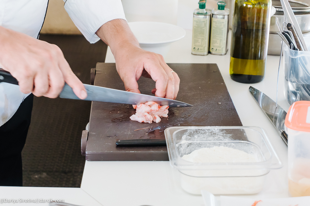 Пока мы с родителями именинника распивали коктейли и шампанское, в миллионный раз обсуждая, как нам повезло с сыном, мужем и друг с другом, Паша с Итало готовили обед из трех подач. Меню с шефом мы заранее не обсуждали. Собственно, вся подготовка заключалась в предварительном заказе фирменного кителя с именем и фамилией именинника. Ресторан очень удобно спланирован для таких мероприятий, т.к. кухня у него открытая, столик, за которым расположились мы, зрители и болельщики, стоял вплотную к кухонной зоне, так что нам было все и видно, и слышно, ну и Паша имел возможность и помогать Итало, и наблюдать за его работой, и проводить время с нами.