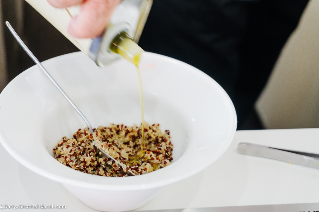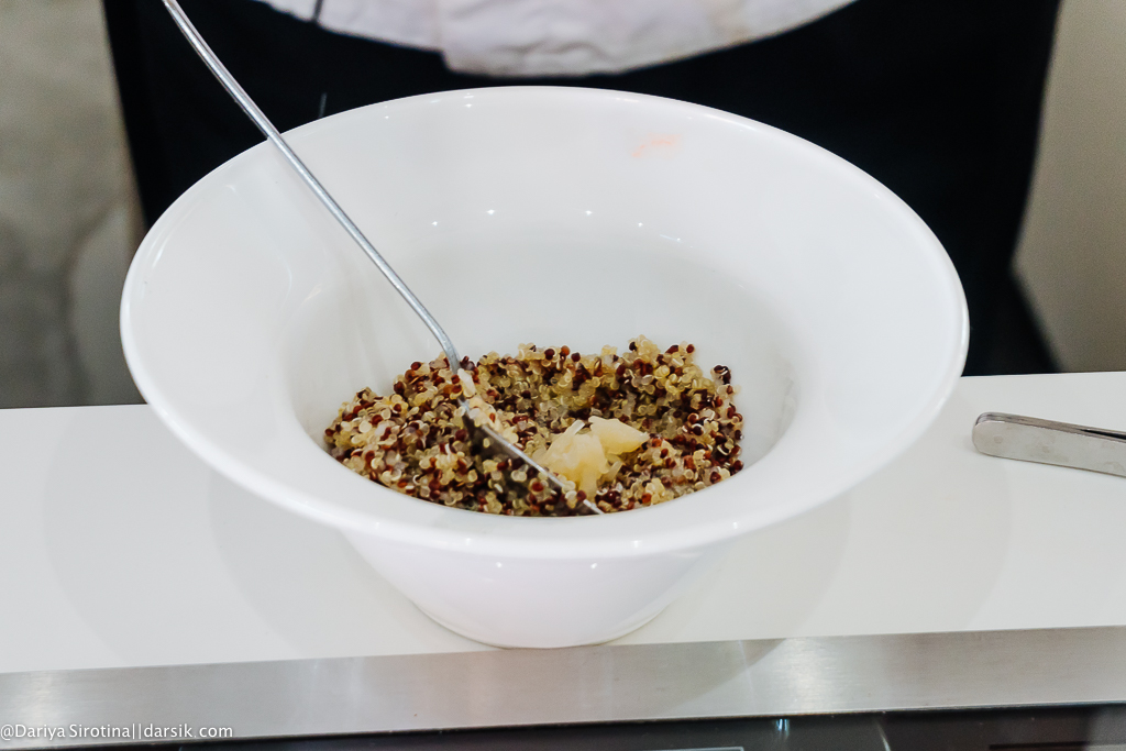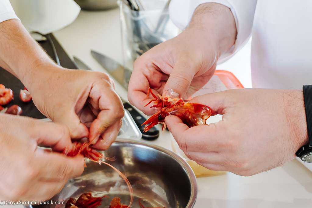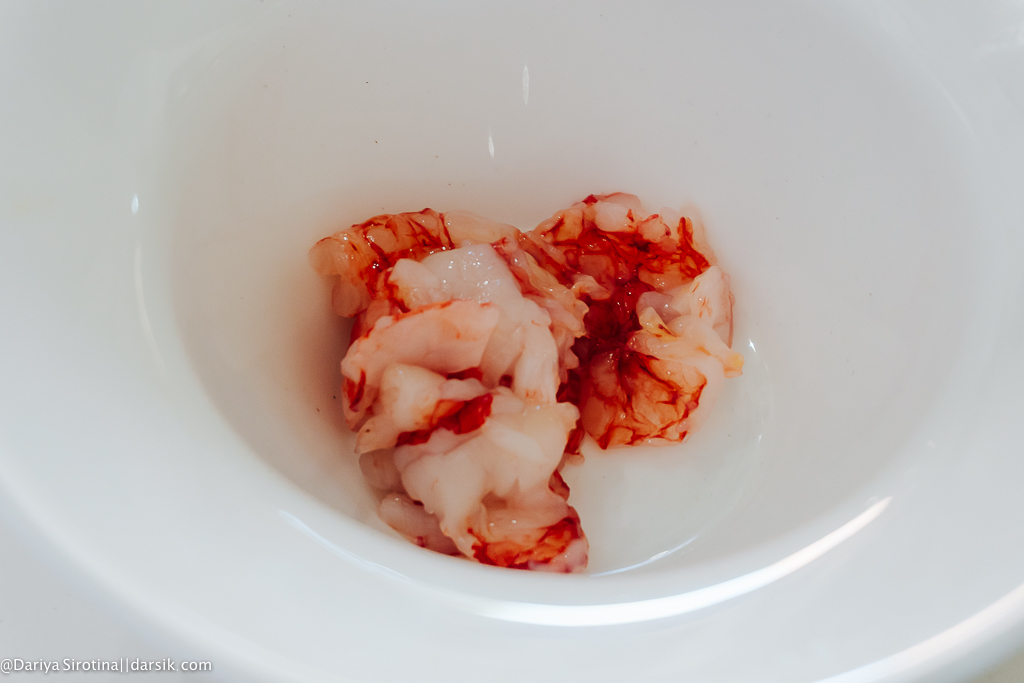 Блюдо построено на сочетании иностранных (киноа) и типично итальянских продуктов. Обжаренная голова креветки, кстати, — не просто украшение, она съедобная, что меня удивило. Томат вместе белком (креветки, икра) дает насыщенный пятый вкус — умами.