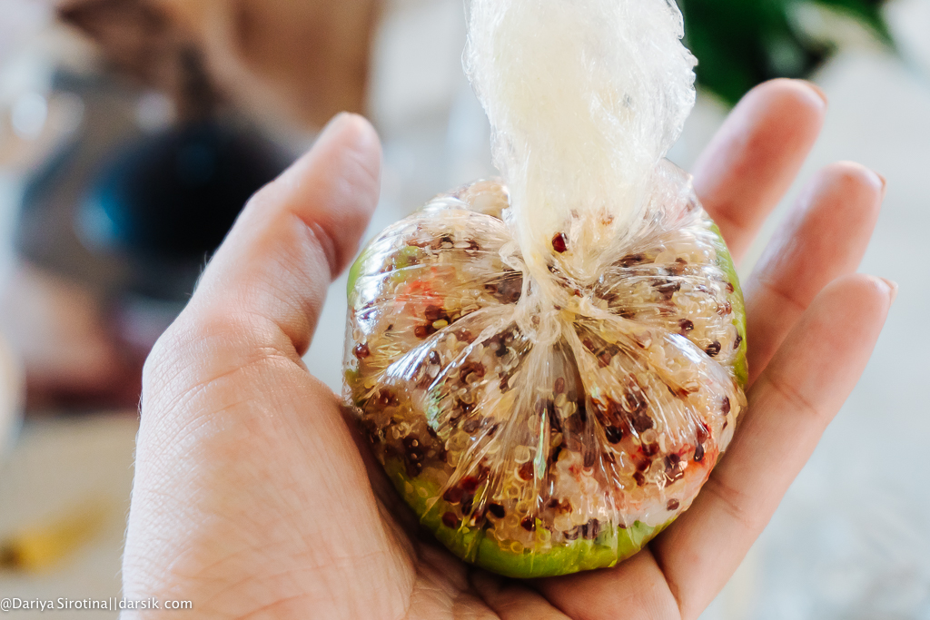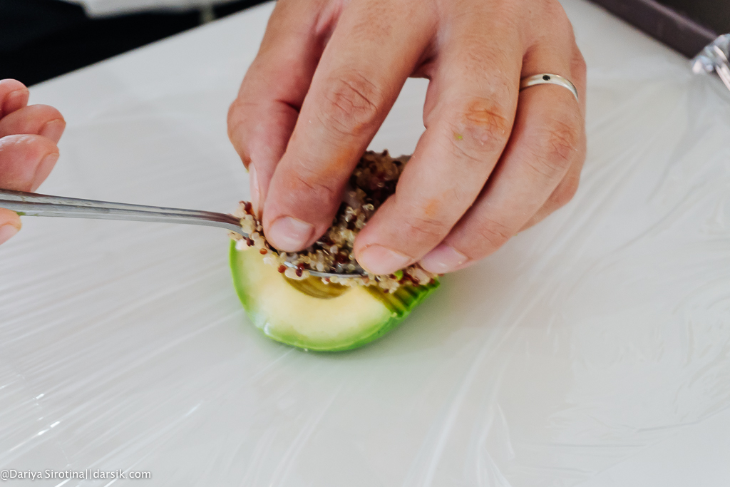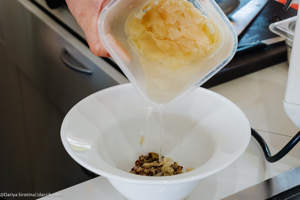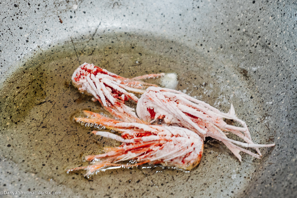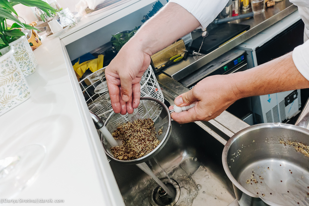 Блюдо построено на сочетании иностранных (киноа) и типично итальянских продуктов. Обжаренная голова креветки, кстати, — не просто украшение, она съедобная, что меня удивило. Томат вместе белком (креветки, икра) дает насыщенный пятый вкус — умами.