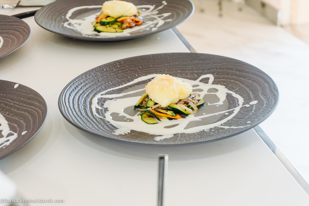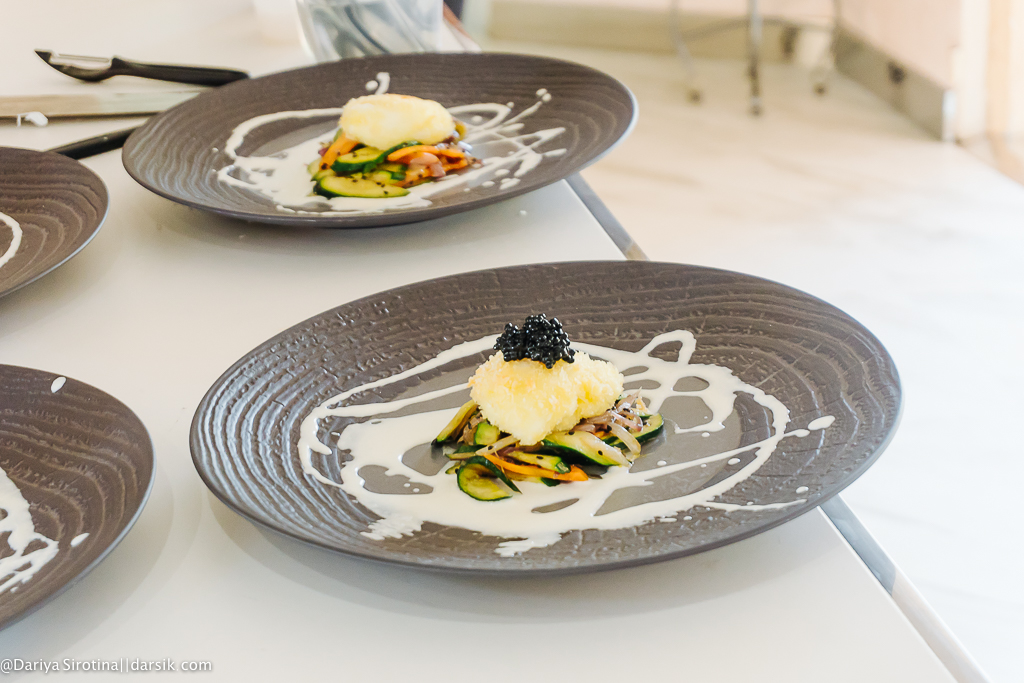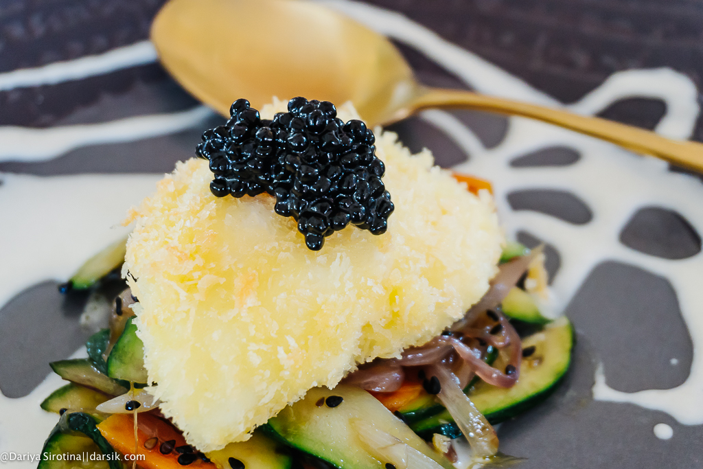Третье блюда сета — припущенные овощи, дважды приготовленное яйцо, трюфельная икра.