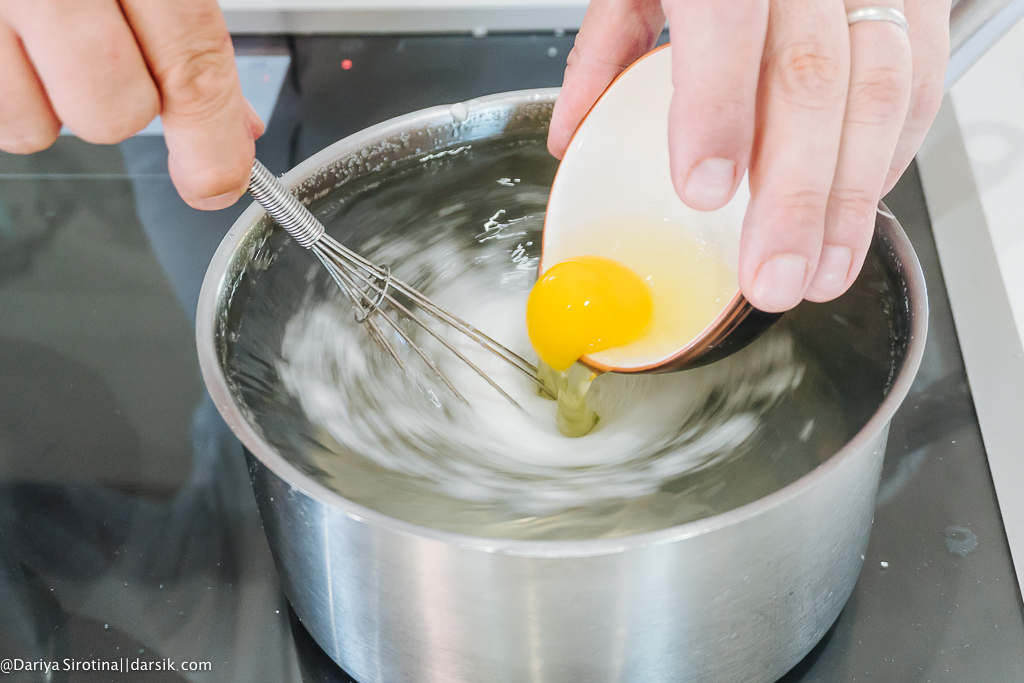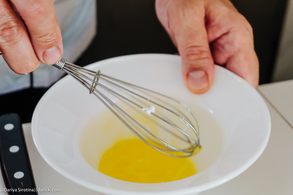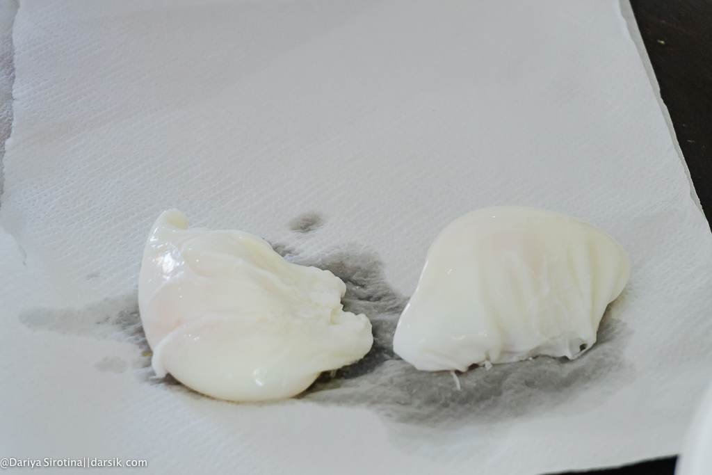 Меня заинтересовал метод приготовления пашот, отличающийся от того, какой показывали мне на курсе в Chefshows by Novikov: Итало добавляет уксус в само яйцо, а не в воду, считая это более удобным при приготовлении нескольких яиц подряд. Такой способ не дает воде стать слишком уксусной и испортить вкус. Басси особо не следит за формой пашота — геометрические огрехи будут в любом случае скрыты панировкой. Трюфельная икра — это продукт молекулярной кухни. Один из главных тосканских производителей трюфелей Savini Tartufi промышленно использует технологию сферификации, превращая трюфельную пасту в икринки. Эту же икру можно купить в Confusion, что мы и сделали.