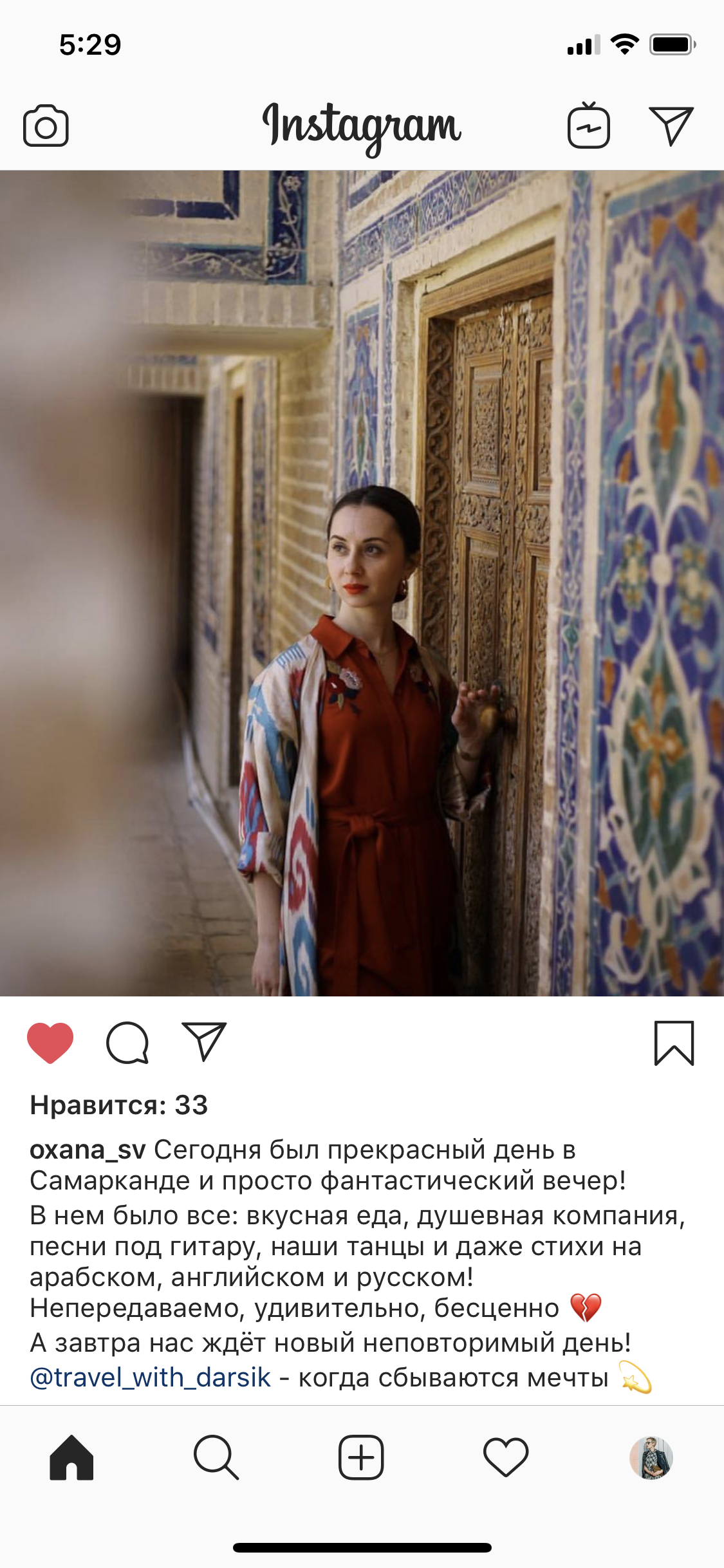 Я все делаю как для себя. Я знакомлю с восхитительным Узбекистаном своих гостей в полном, в максимальном комфорте. У нас маленькая компания — я беру в группу максимум 8 девушек. Мы ездим на новых джипах с профессиональными водителями, мы живем в лучших в стране отелях, мы пьем по утрам горячий итальянский кофе и ледяное узбекское игристое, с нами работают самые интересные гиды и фотограф, рекомендованный не кем-то там, а The Guardian… Я знаю, где лучший кальян и самое вкусное мясо, меня узнают банщицы в средневековом хаммаме (никогда не подумала бы, что частью моей работы будет ходить в баню со своими читательницами!), пароль «Даша» открывает в неурочное время лавки с сокровищами… Самое главное — я ужасно болею за страну, за людей, которые со мной работают, и за всех тех, кто доверился мне и позволил именно мне быть их проводником в волшебном Узбекистане. Другими словами, я просто счастлива.