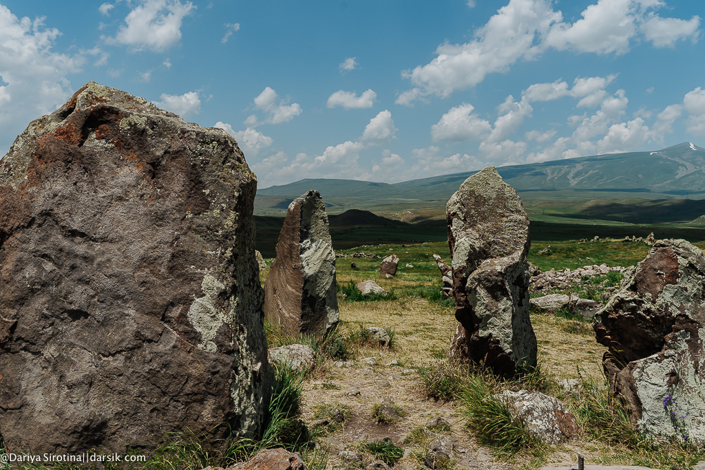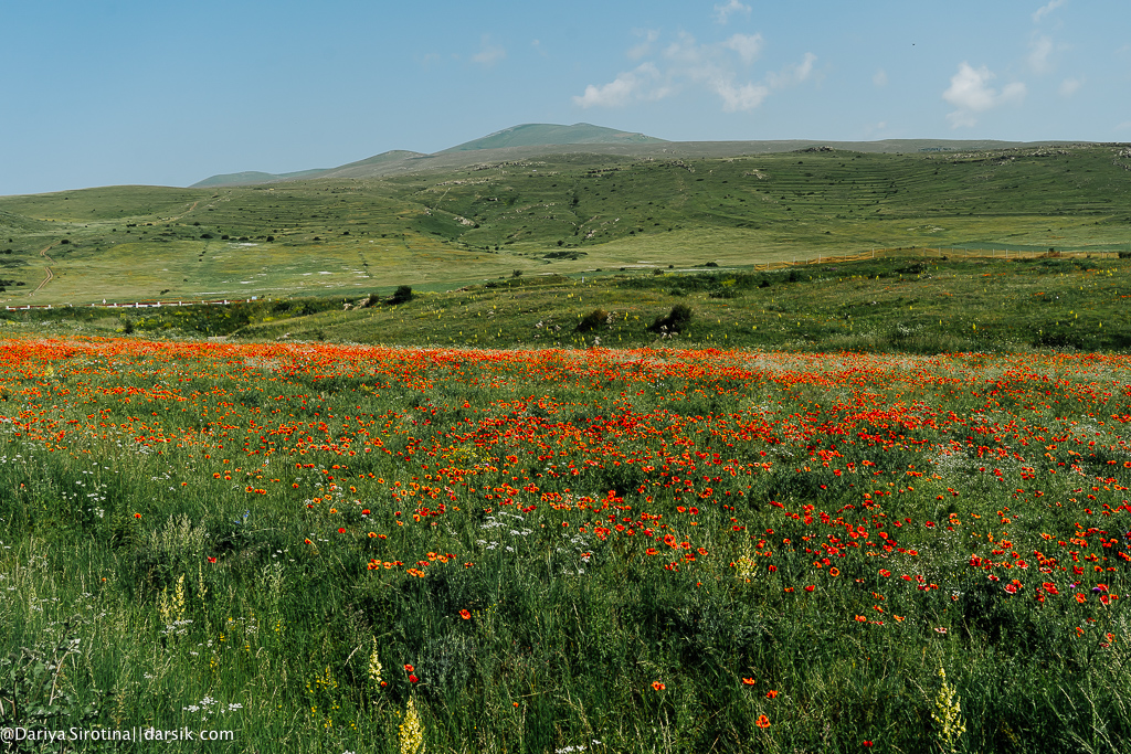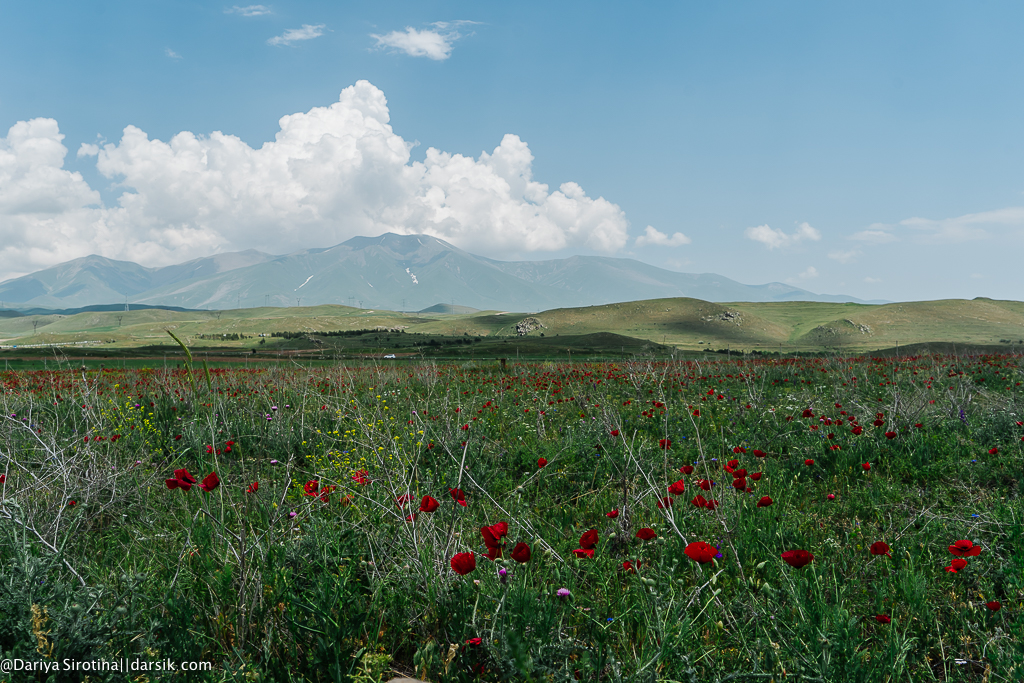 Расположенный на высоте 1700 метров на уровнем море, Караундж (или Зорац-Карер) называют армянским Стоунхенджем. Это то ли обсерватория, то ли курган, то ли загон для скота, чье время появления также остается загадкой. Есть люди, которые чувствуют тут какую-то особую энергетику, но я не из их числа точно. Окрестности, однако, мне понравились — маковые поля, кое-где еще проглядывающий на горах снег…