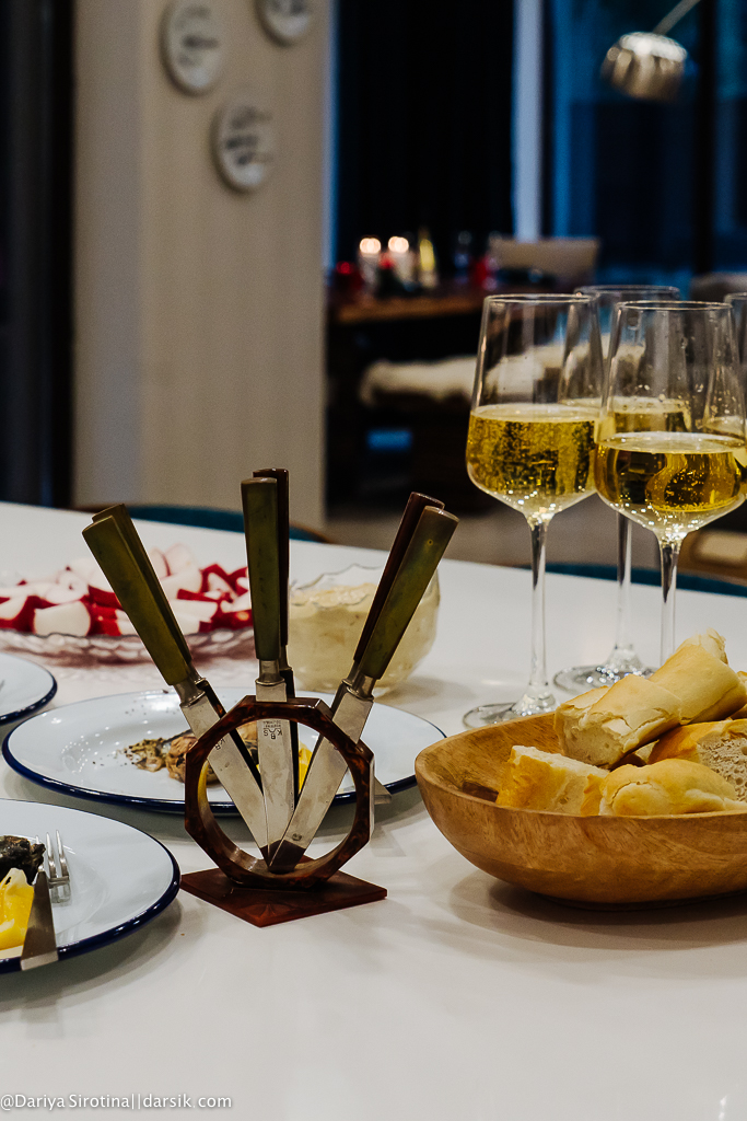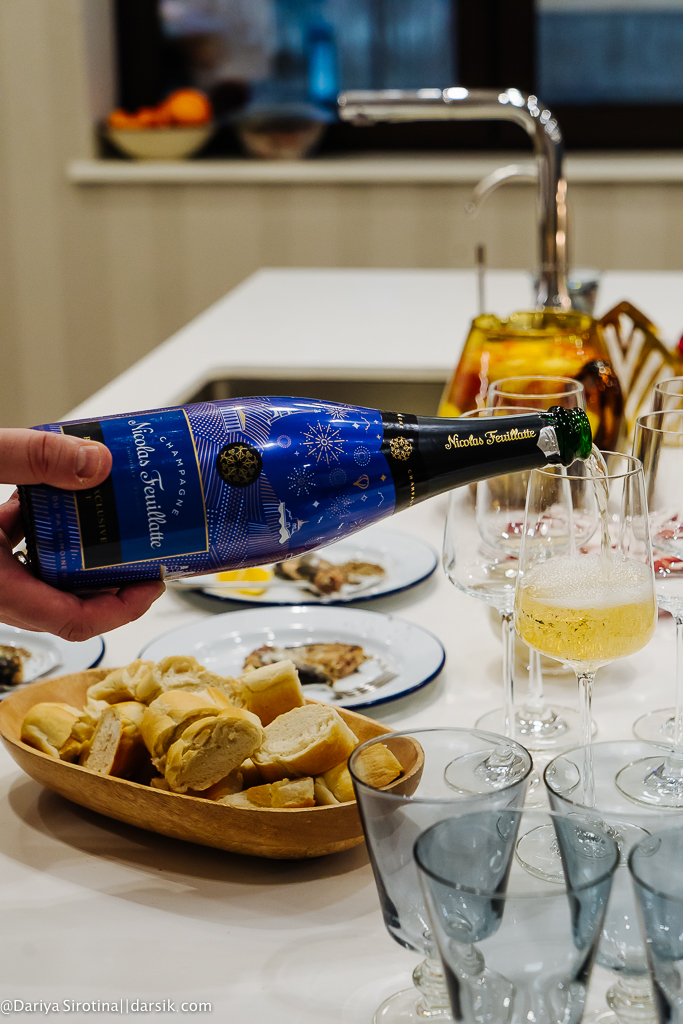 Весь обед был вдохновлен нашей с мужем поездкой в Париж и последовавшим за ним моим знакомством с Шампанью. Всю парижскую неделю, осваивая парижские бистро и брассери новой волны, мы подмечали детали: что подают на аперитив, как сервируют, какую используют посуду, как сочетают вкусы. В Шампани я попробовала множество отличных вин, получила несколько бутылок в подарок, что-то купила сама, решив привезти домой особо запомнившиеся мне экземпляры.