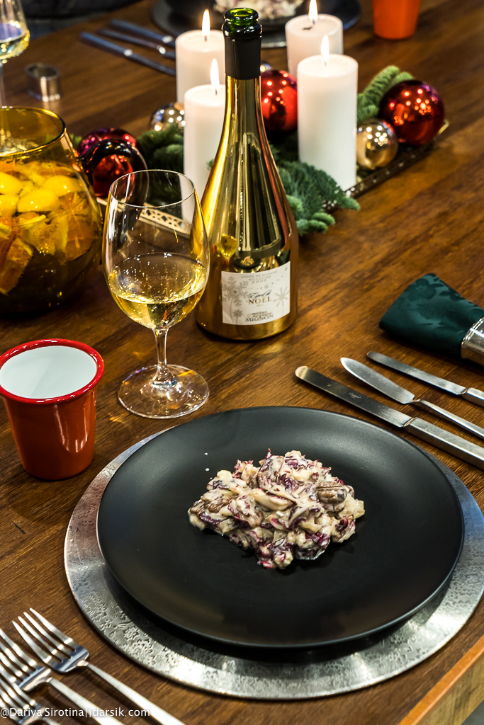 Первая подача — салат из радиккио и груши с карамелизированным пеканом и сырной заправкой (сыр с плесенью и молоко). Подсмотрен в Париже: такой мне принесли в брассери L’Entente, правда, вместо радиккио там был эндивий, которого, готовясь к обеду, я поблизости не нашла. Ну что ж, и с радиккио было очень хорошо! Если найдете эндивий, можно сделать finger food, отличный аперитив: на листик-лодочку выложить сыр, кусочки груши и орехи. И брать руками, вспоминая меня и Элизабет, хозяйку виллы Elizabeth в Аи, в Шампани, у которой я такую закуску попробовала, добрым словом.