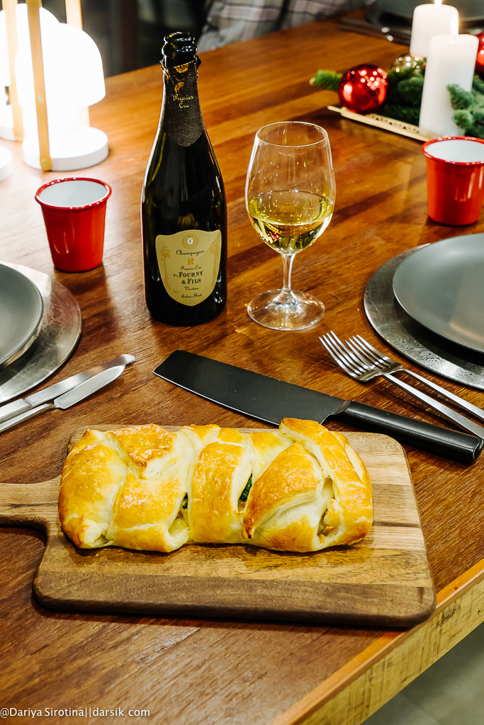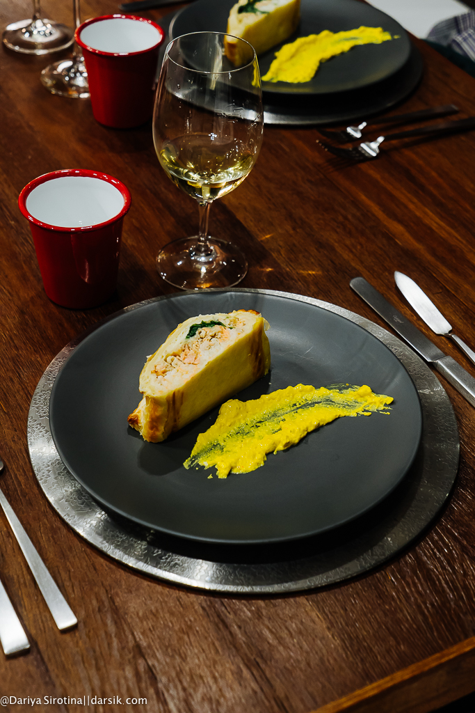 Вторая подача — кулебяка с рыбой, рисом, шпинатом, сыром грюйер и соусом с шафраном и карри. Какая связь между кулебякой и Францией, спросит меня внимательный читатель. А прямая, парирую я! Во Францию рецепт сoulibiac привез великий повар Огюст Эскофье, и включил его в свою книгу, прославив нашу кулебяку на весь просвещенный мир. Мы решили не усложнять процесс и взяли для кулебяки готовое слоеное тесто. Слой риса, слой рыбы, оставшейся от приготовления соуса для основного блюда, сыр, шпинат — очень вкусно и очень просто, тем более, что можно приготовить заранее, а перед подачей разогреть. Пару раз потренируюсь и смогу заплетать кулебяку косичкой еще более аккуратно.