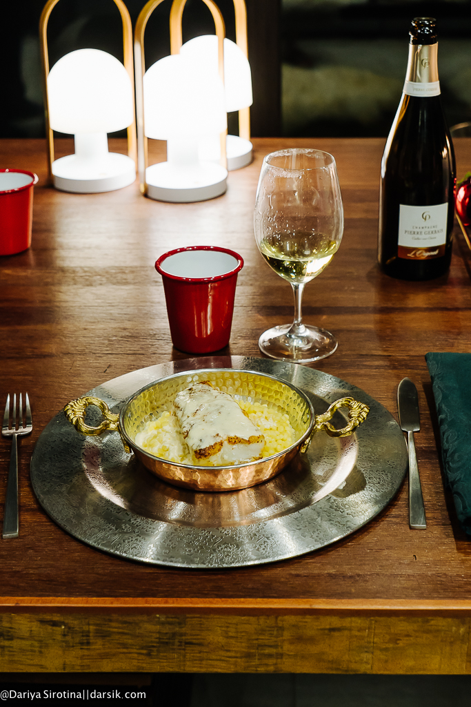 Champagne R. Pouillon&Fils Extra Brut Premier Cru Solera (50% пино нуар, 50% шардоне). Редкая штучка — шампанское, сделанное методом солера (рассказывала подробно тут) с заметными хересными нотами. Насыщенное, сильное, способное быть парой не только рыбе, но и, скажем, свинине или курице с темным соусом. Моей идеей было сочетать с этим вином рыбу, перед подачей чуть подкопченную из коптильного пистолета. И я была права! Дымность, сливочный соус и хересные ноты вина идеально сработались.