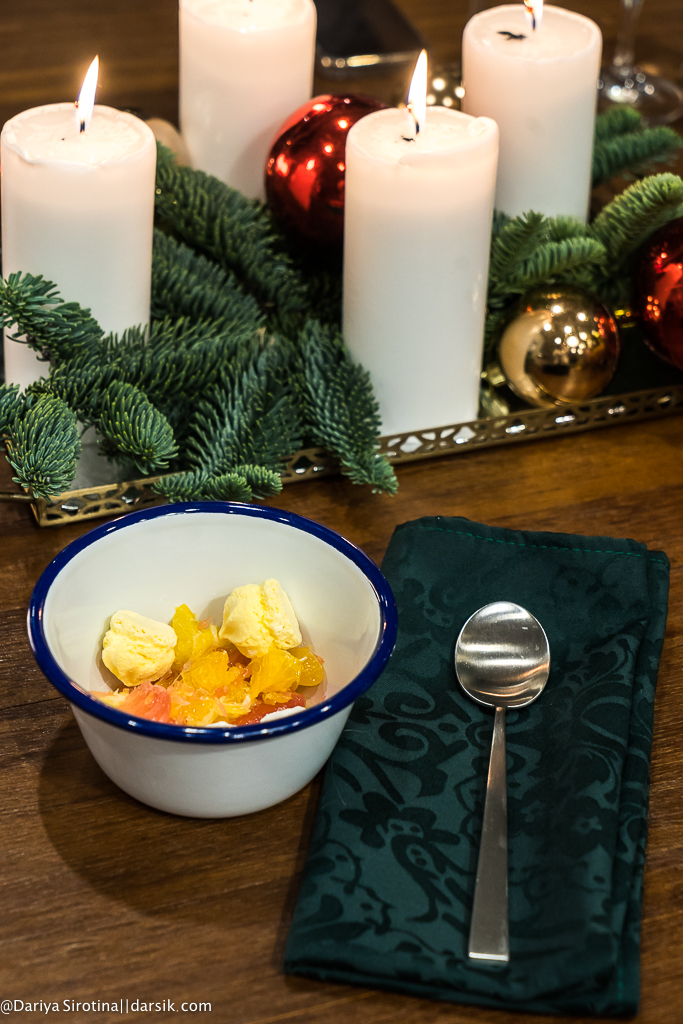 Четвертая подача — цитрусовый десерт с оливковым маслом, солью и меренгами, подсмотренный в том же бистро. Он сколь прост, столь и эффектен: сочетание цитрусов с нежностью оливкового масла (берите только самое-самое хорошее, а не ерунду из супермаркета), крупинками соли и сладкими меренгами просто восхитительное. Я не знаю, почему, но в нашей гордой стране пропала соль хлопьями, которую я люблю больше всего. Именно такая, а не мелкая и не крупными кристаллами, сюда подойдет идеально. Хорошо, что у меня живы еще итальянские запасы. Меренги купили готовые. Самый важный этап — чистка цитрусов от пленок, отведите на него побольше времени.