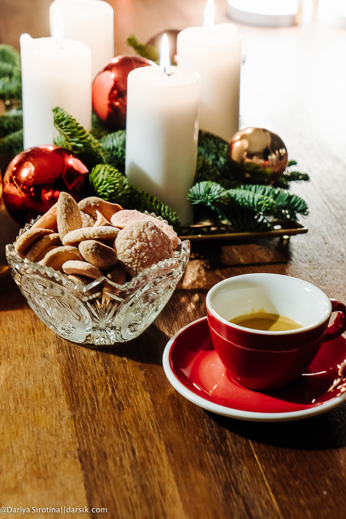 В кульках из подарочной бумаги, украшенных еловыми ветками, маленькими елочными игрушками и новогодними бусами — то же самое реймское розовое печенье, чтобы гости, борясь утром с похмельем и перееданием и налив себе кофе, вспоминали хозяйку добрым словом.