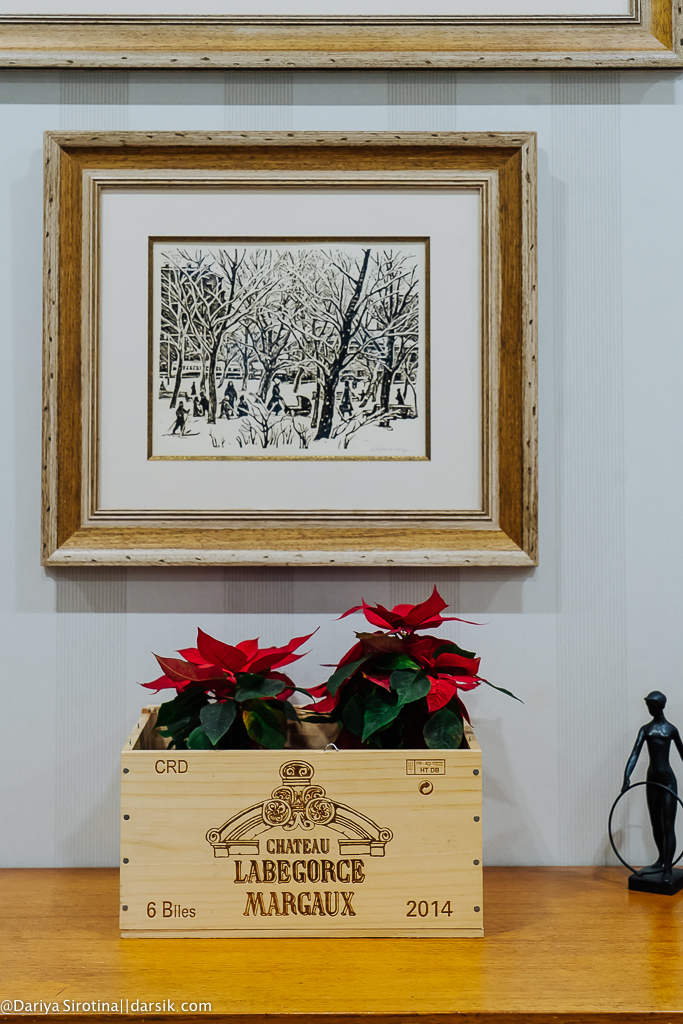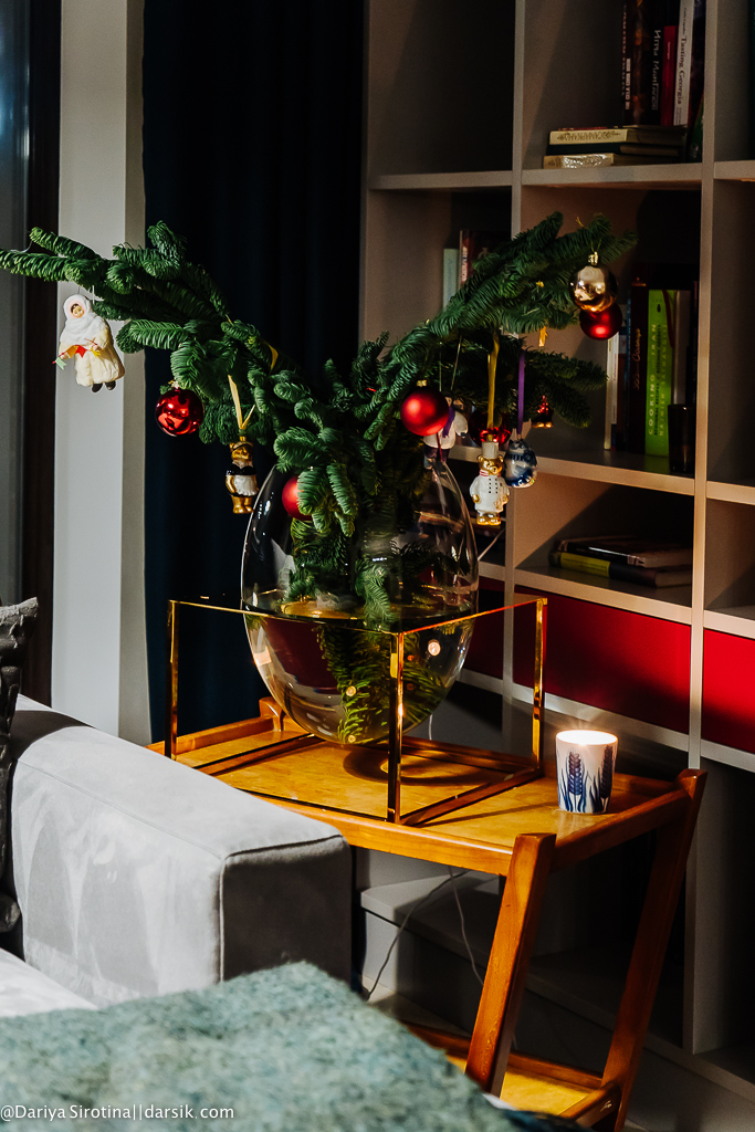Елку в этом году мы решили не ставить. Зато я впервые купила пуансеттию, красный рождественский цветок, который в Европе часто используют для украшения именно в декабре. Зеленые салфетки — маленький праздничный штрих. В центре стола — поднос со свечами и елочными шарами, который я украсила еловыми ветками. Ну кот — всесезонное украшение, подходящее к любому случаю. Согласны?