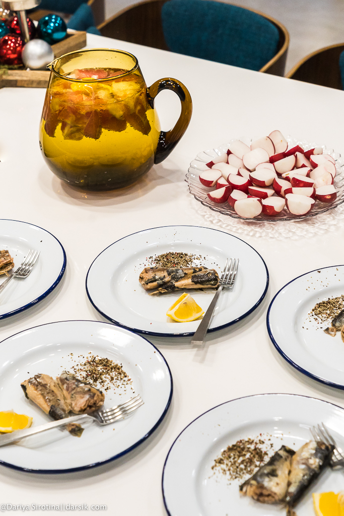 Помню, что я также очень удивилась, получив впервые в качестве аперитива банку упругих толстеньких сардин с перцем и лимоном. Во Франции их подают прямо в жести, не выкладывая на тарелку, но для стола, рассчитанного больше, чем на двоих, это не очень удобно, так что мы разложили рыбу по тарелкам.