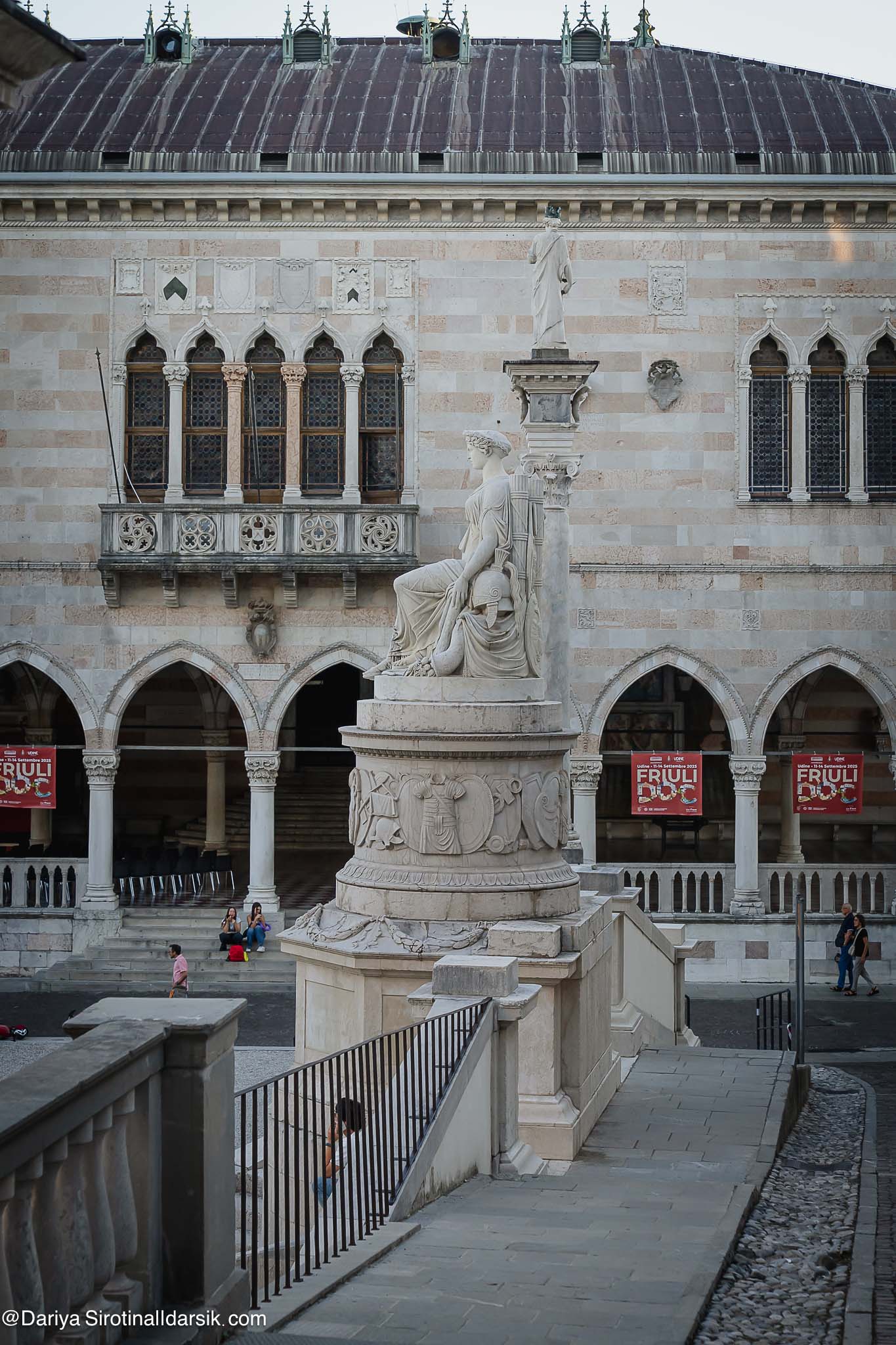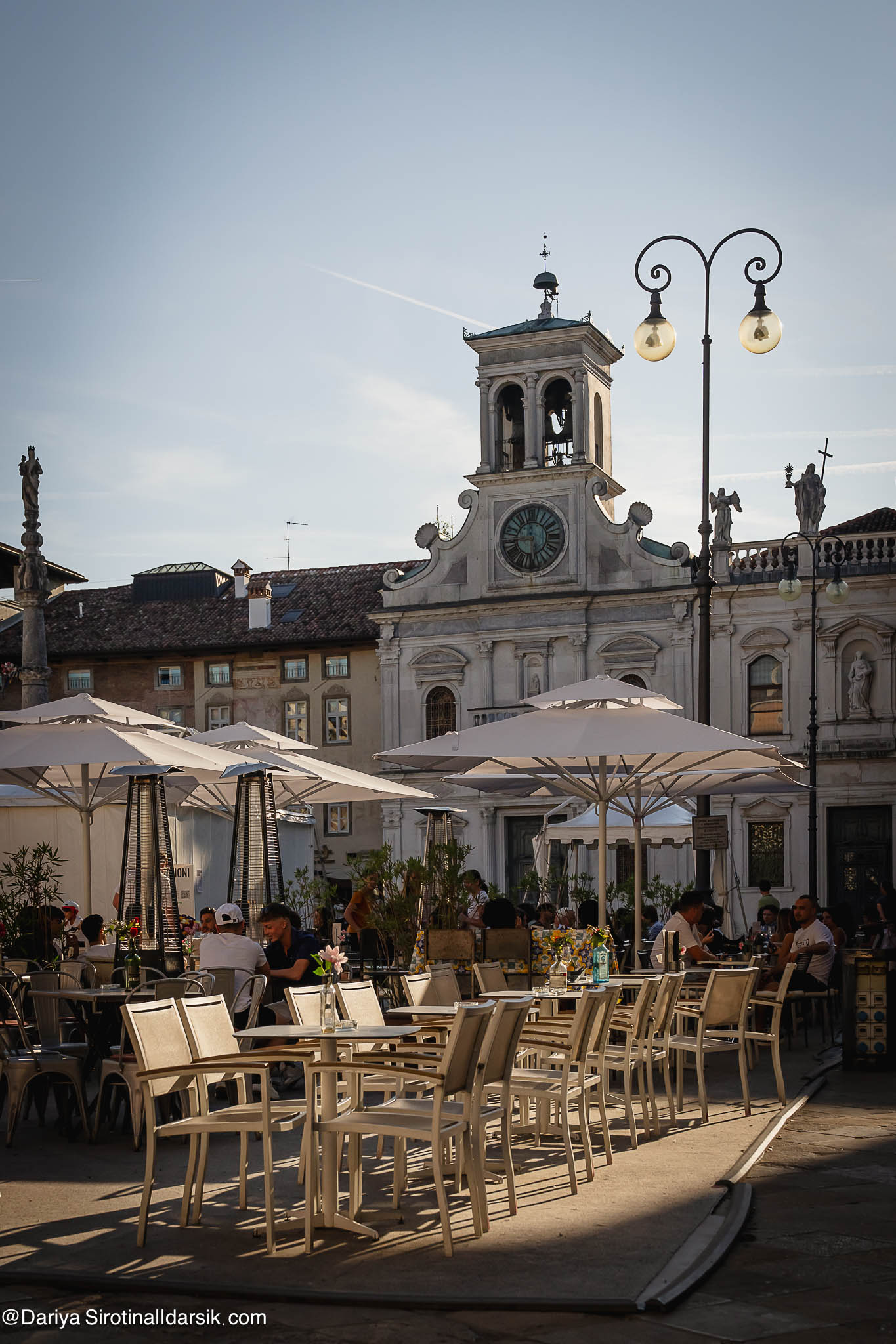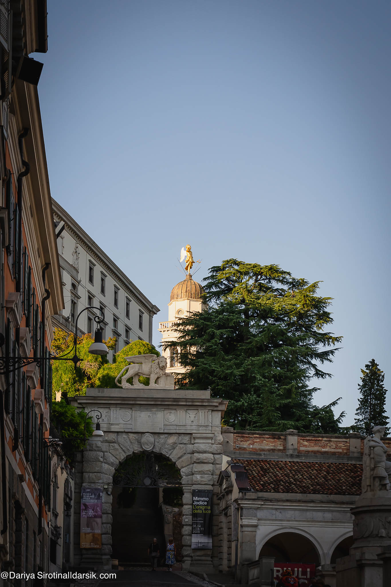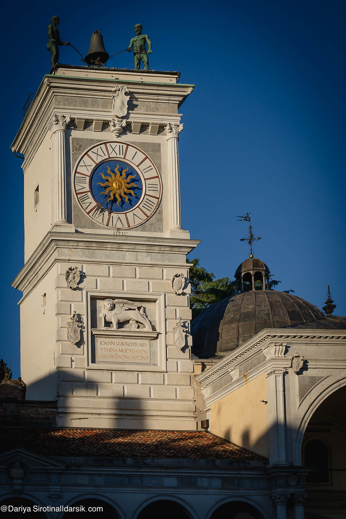 Удине — это моя новая большая любовь и город, в который я очень хочу вернуться для более обстоятельного знакомства. Удалось здесь провести всего несколько вечерних часов, но зато каких! Была суббота, весь город, кажется, гулял. Бурлящие улицы, заполненные террасы кафе, звон бокалов, сливающийся со звоном колокола, установленного на городском замке. Магический вечерний свет, венецианская архитектура, бесконечные портики и арки и ощущение новизны за каждым изгибом улицы. Почему архитектура венецианская? Да потому, что Удине был частью Венецианской республики с начала 15 до конца 18 века, поэтому как минимум центральная городская площадь, Piazza della Libertà, напомнит вам Венецию. От площади начинается подъем к замку. Не пожалейте времени и преодолейте его хотя бы ради прекрасных видов на сам город и Альпы! Спускаясь вниз, вы сможете вдоволь налюбоваться задним планом двух мускулистых мужских фигур, установленных на колокольне. Это мавры, как их тут принято называть, часовые автоматы. Один из них бьёт в колокол за несколько минут до наступления каждого часа, второй — ровно в ноль минут. То, что они движутся, привело лично меня в восторг!
