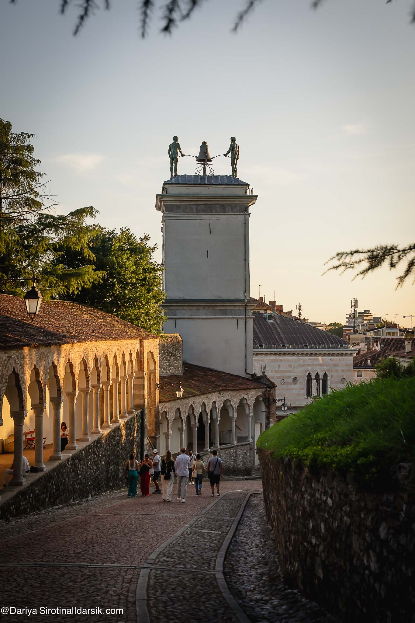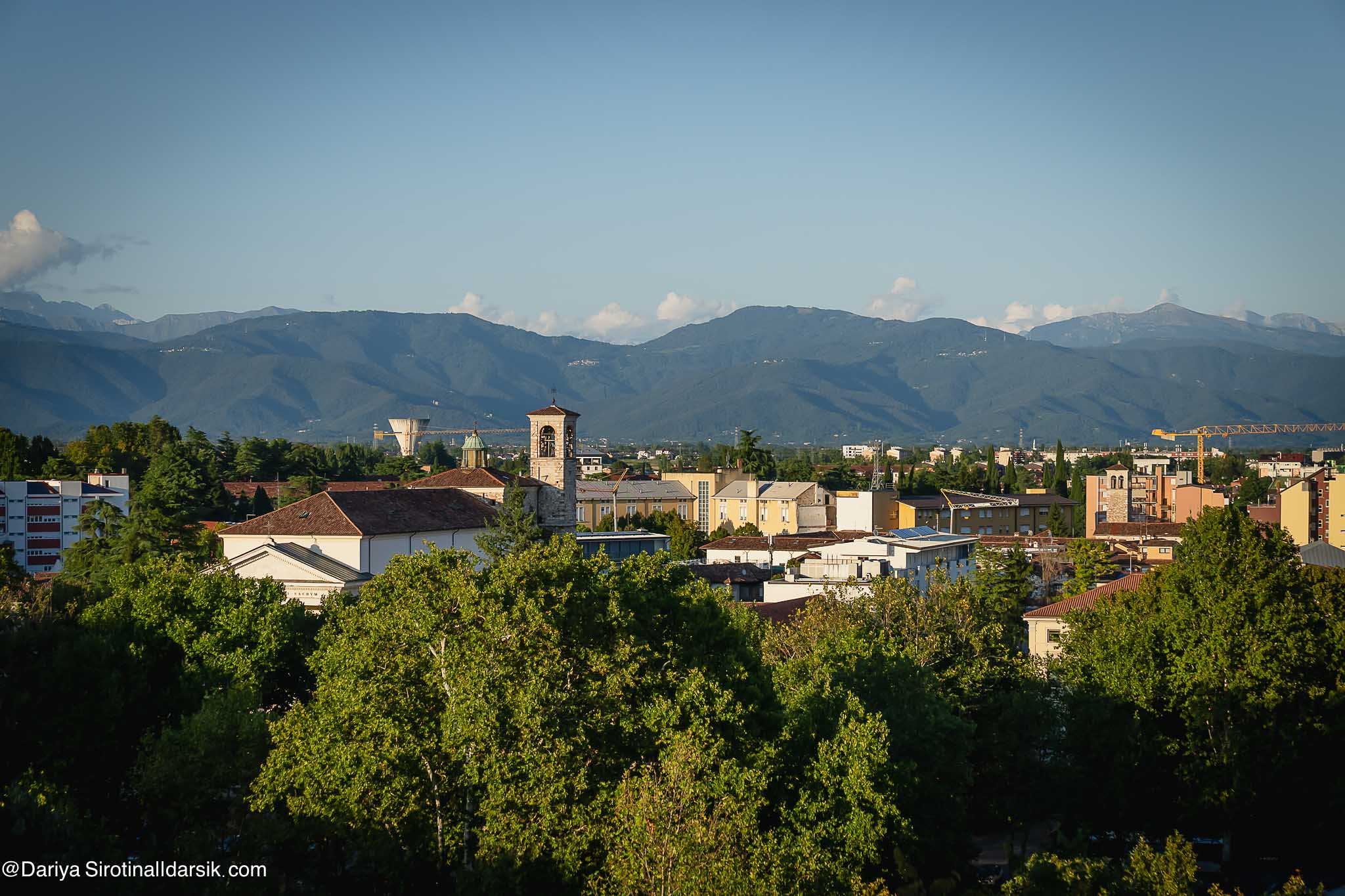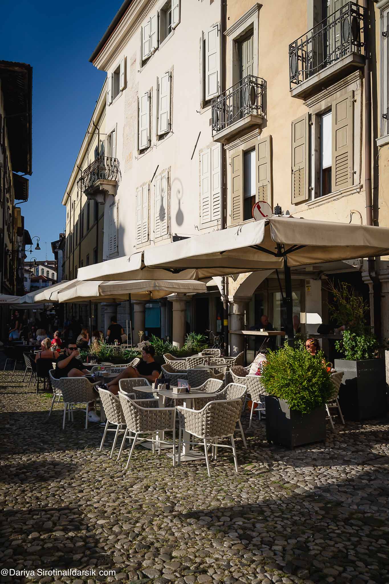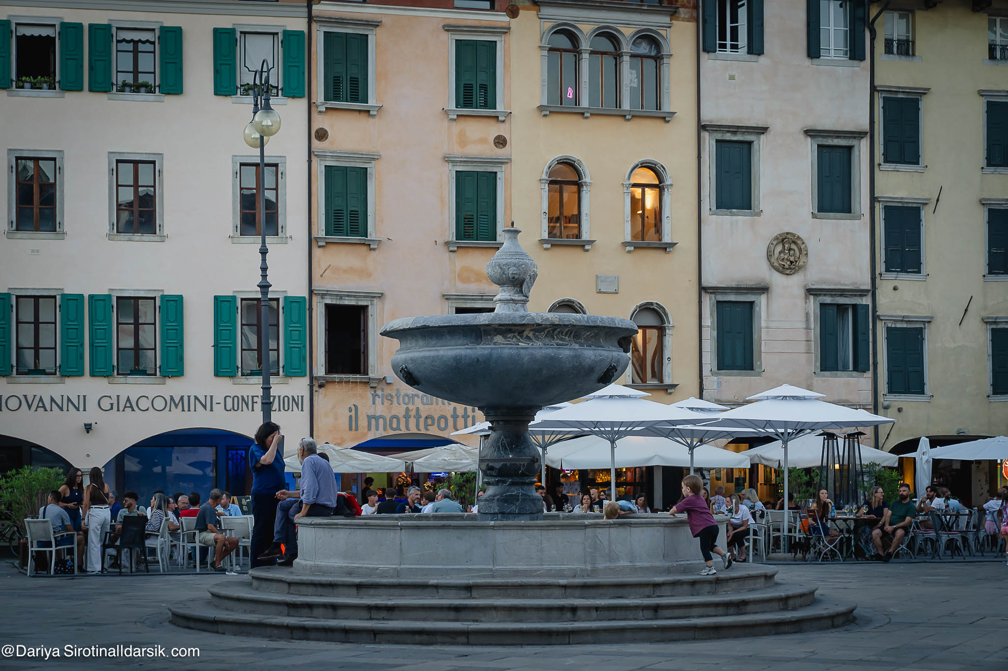 Удине — это моя новая большая любовь и город, в который я очень хочу вернуться для более обстоятельного знакомства. Удалось здесь провести всего несколько вечерних часов, но зато каких! Была суббота, весь город, кажется, гулял. Бурлящие улицы, заполненные террасы кафе, звон бокалов, сливающийся со звоном колокола, установленного на городском замке. Магический вечерний свет, венецианская архитектура, бесконечные портики и арки и ощущение новизны за каждым изгибом улицы. Почему архитектура венецианская? Да потому, что Удине был частью Венецианской республики с начала 15 до конца 18 века, поэтому как минимум центральная городская площадь, Piazza della Libertà, напомнит вам Венецию. От площади начинается подъем к замку. Не пожалейте времени и преодолейте его хотя бы ради прекрасных видов на сам город и Альпы! Спускаясь вниз, вы сможете вдоволь налюбоваться задним планом двух мускулистых мужских фигур, установленных на колокольне. Это мавры, как их тут принято называть, часовые автоматы. Один из них бьёт в колокол за несколько минут до наступления каждого часа, второй — ровно в ноль минут. То, что они движутся, привело лично меня в восторг!