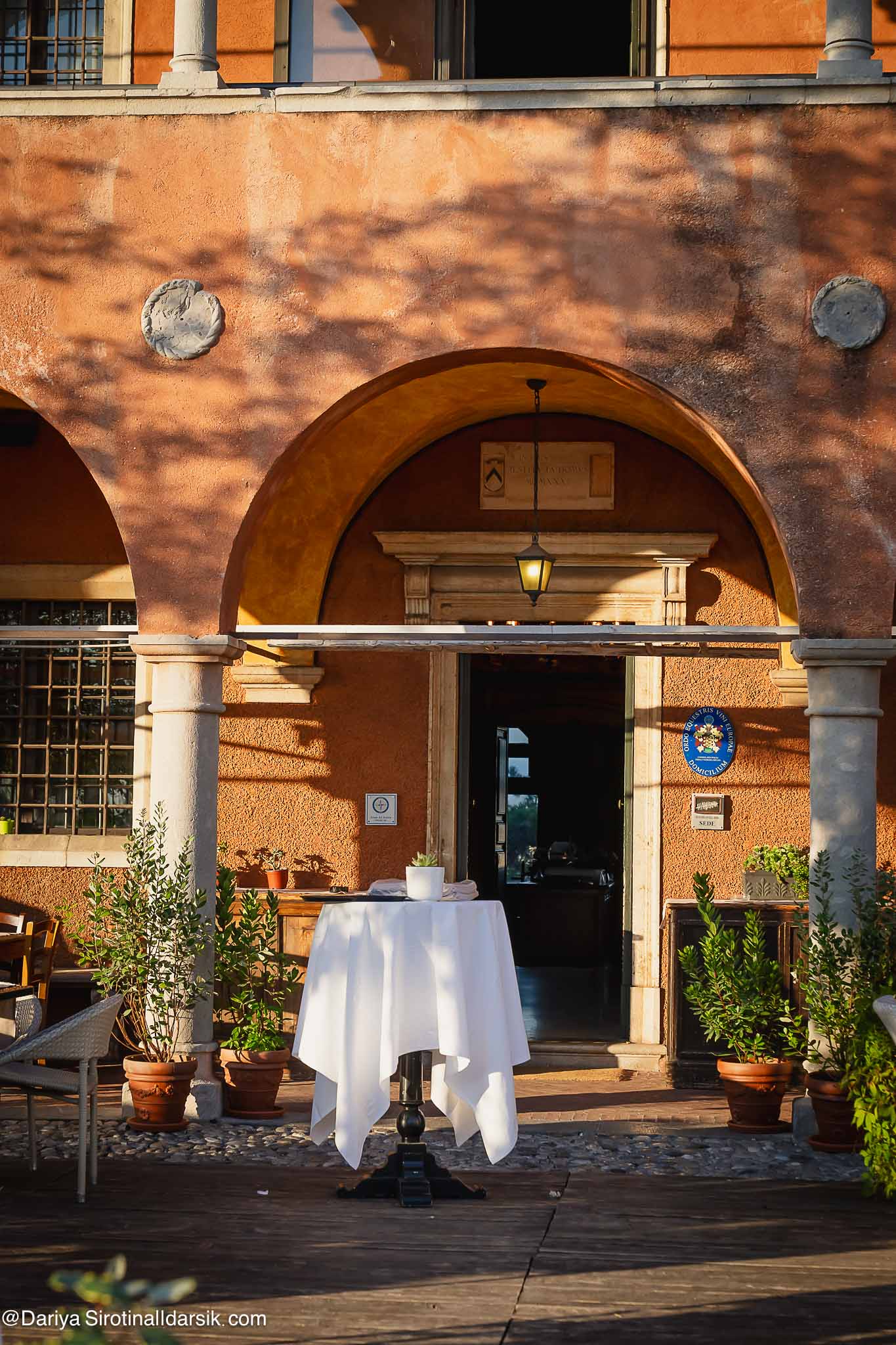 Это лучший ресторан за всю поездку, если не считать Hiša Franko *** в Словении , о котором речь пойдет ниже. Выбрала я его потому, что все рестораны со звездами, расположенные в Удине, в начале сентября были закрыты на каникулы. И слава богу! Hostaria alla Tavernetta — очень элегантный и очень популярный ресторан, находящийся в семейном управлении. Здесь множество разных залов, наполненных антиквариатом и прекрасной живописью, крахмальные салфетки, импозантные буфеты, уставленные бутылками, и очень вежливое, сдержанное, но располагающее к себе обслуживание. Нас встречал, принимал заказ и провожал наследник семьи, владеющей заведением, Маттео Романо. Голливудская улыбка, идеально сидящий костюм, прекрасный манеры — l’italiano vero! Про таких людей я обычно говорю, что они работают на своей работе, то есть нашли себе наилучшее применение. Я ела ну просто божественное карпаччо из бранзино с щедрой порцией трюфеля сверху и очень жалела, что решила не брать к нему бокальчик белого. Рыба с лимонным соусом в качестве горячего также была хороша. Муж оценил ризотто, тоже с лимоном. Другая часть нашей компании осталась довольна грибами и мясом. Если ваша компания пьющая, вы точно оцените и винную карту.