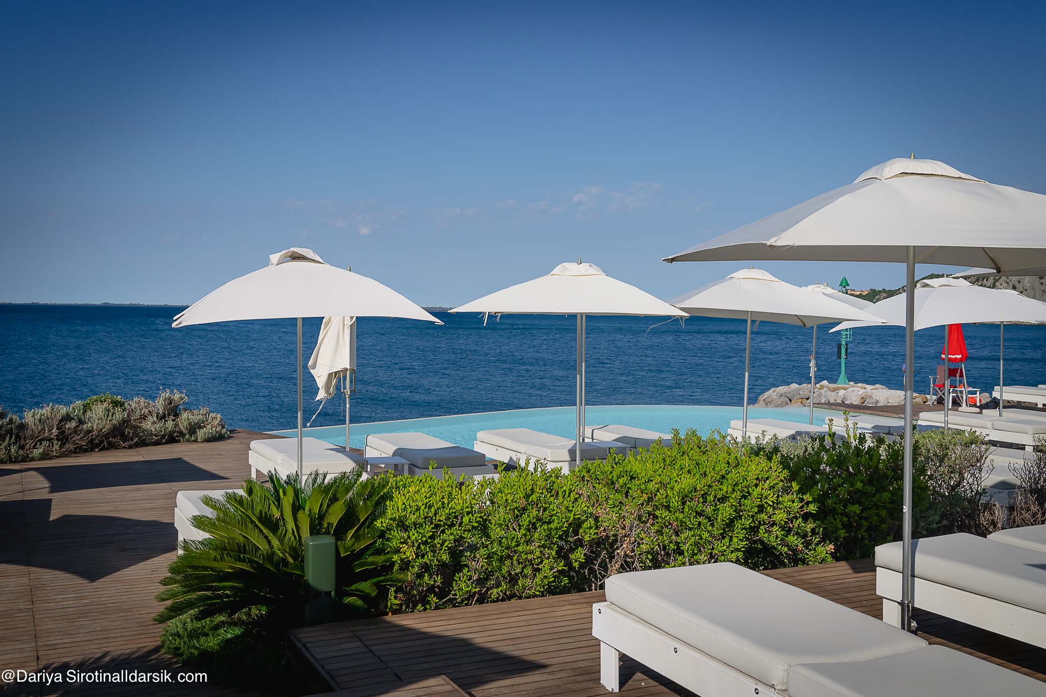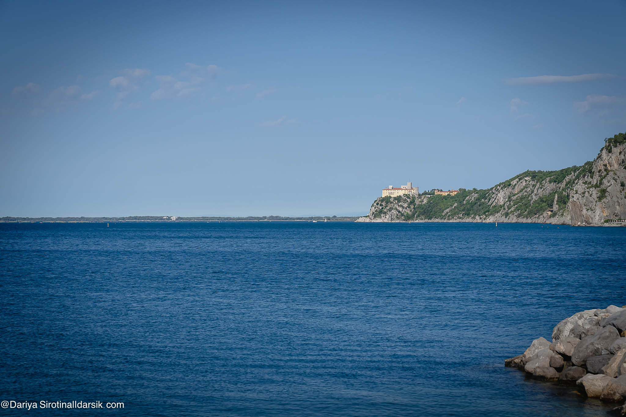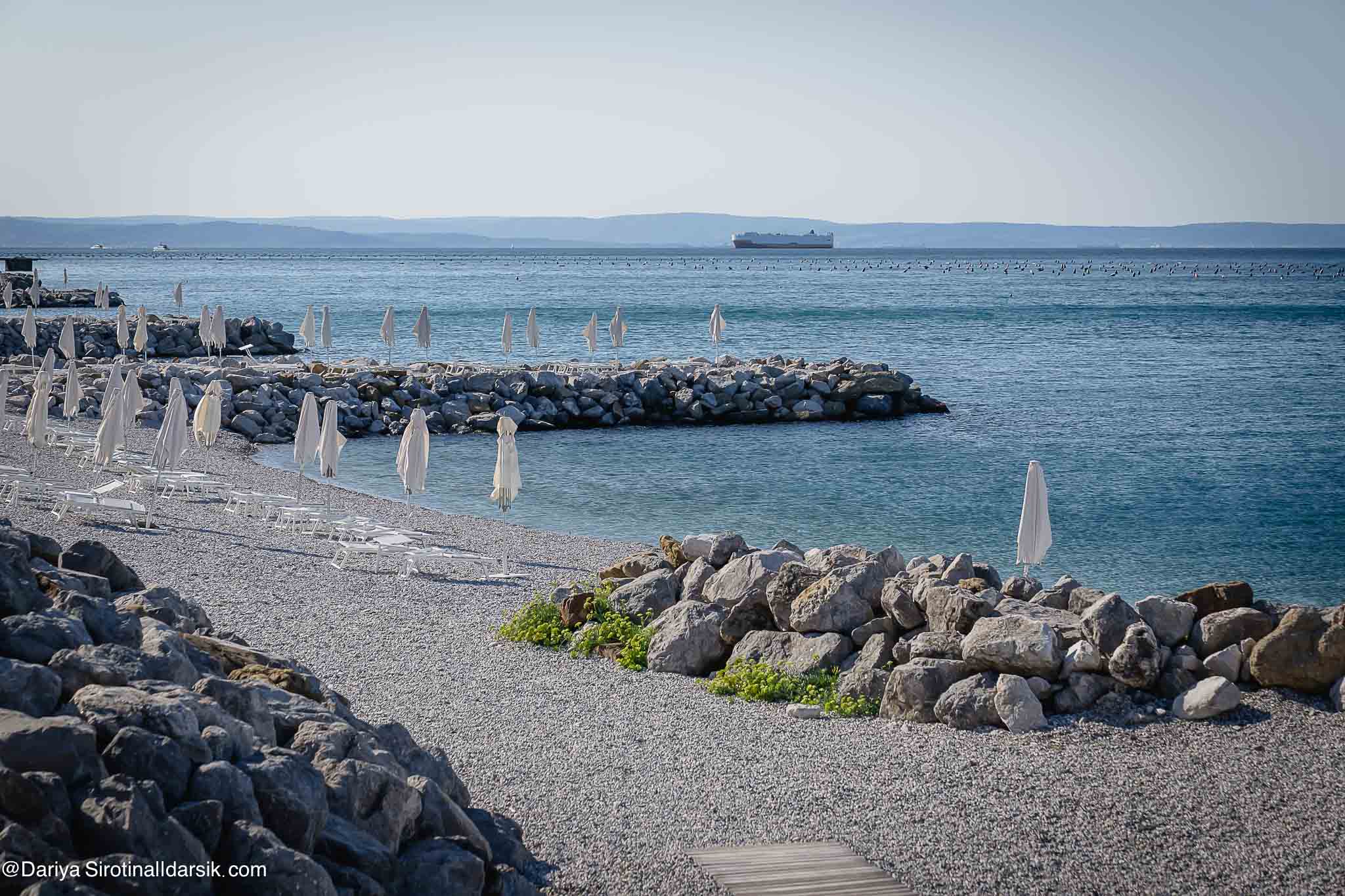 Пляж галечный, море невероятно чистое. Чистое настолько, что я за один день трижды видела дельфина на расстоянии буквально вытянутой руки. Шезлонги стоят как у кромки воды, так и на террасах чуть на возвышении. Для гостей отеля отведено самое престижное место на возвышении с красивейшим видом на замок Дуино и Триестинский залив. Для тех, кто в море не купается, есть бассейн. Лежаки мягкие, души, раздевалки — есть все. Музыки на той части пляжа, где отдыхают гости отеля, нет. Словом, тишина, красота и покой.