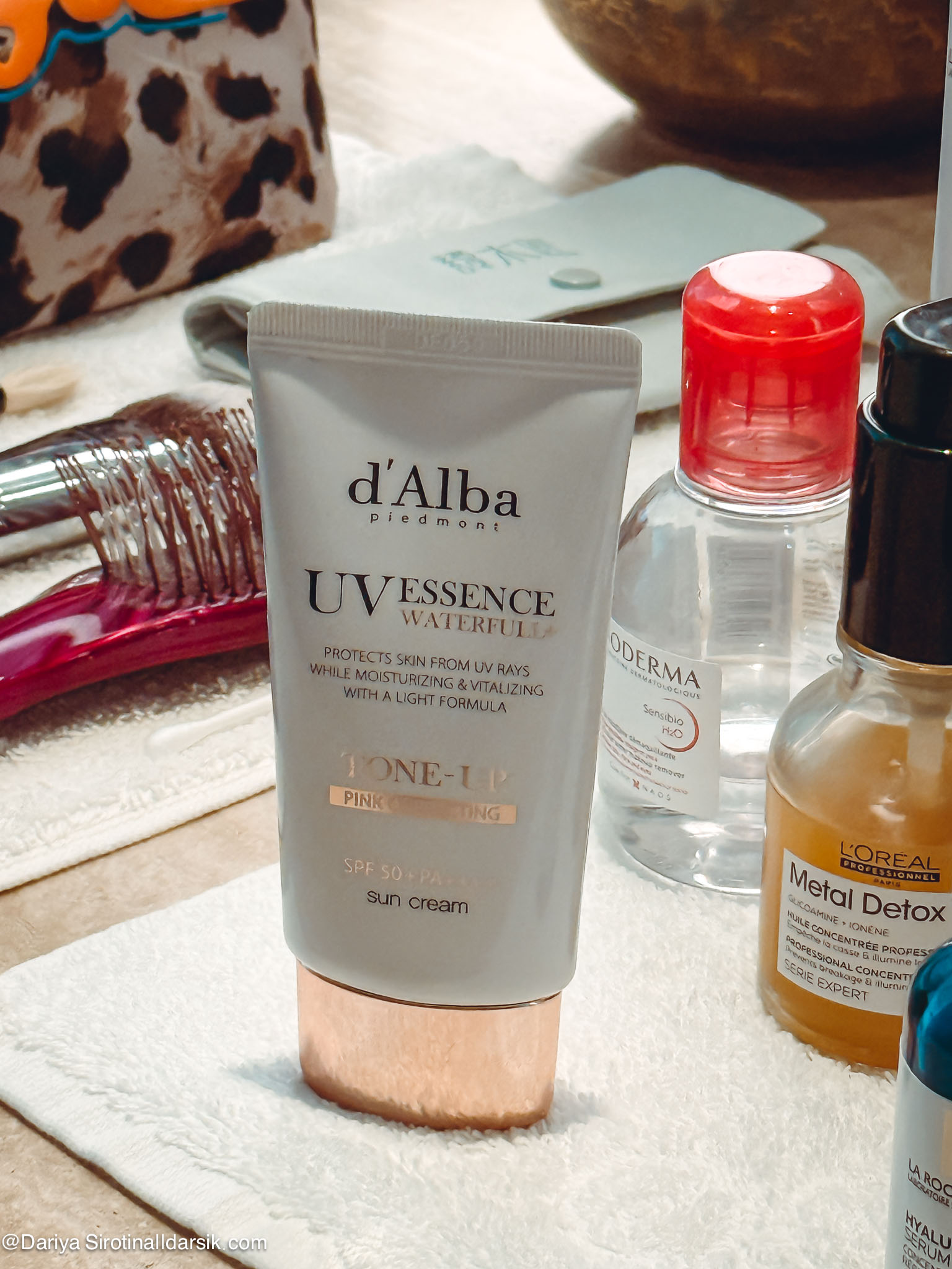 D’Alba UV Essence Waterfull Tone-Up — очень хороший SPF для города с заметным подсвечивающим эффектом. Весь этот сезон я пользовалась им и рассказывала вам об этом. Он делает сияющее, холеное лицо. Выходя утром из номера на пляж, я наносила именно его.