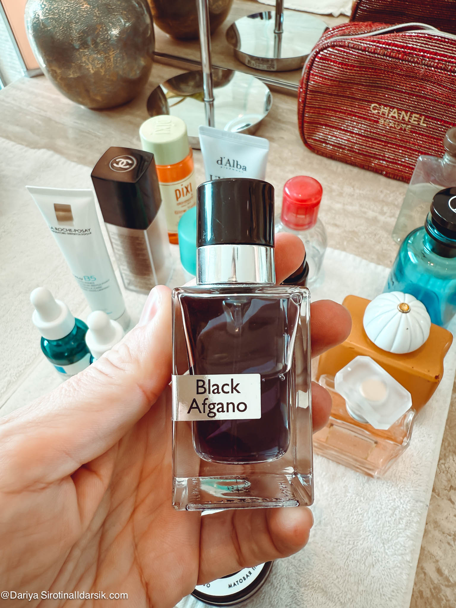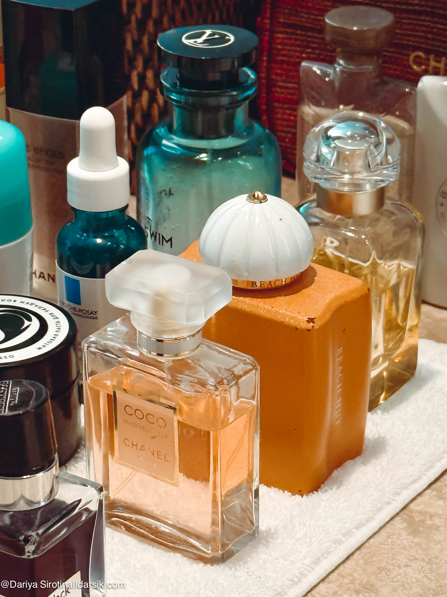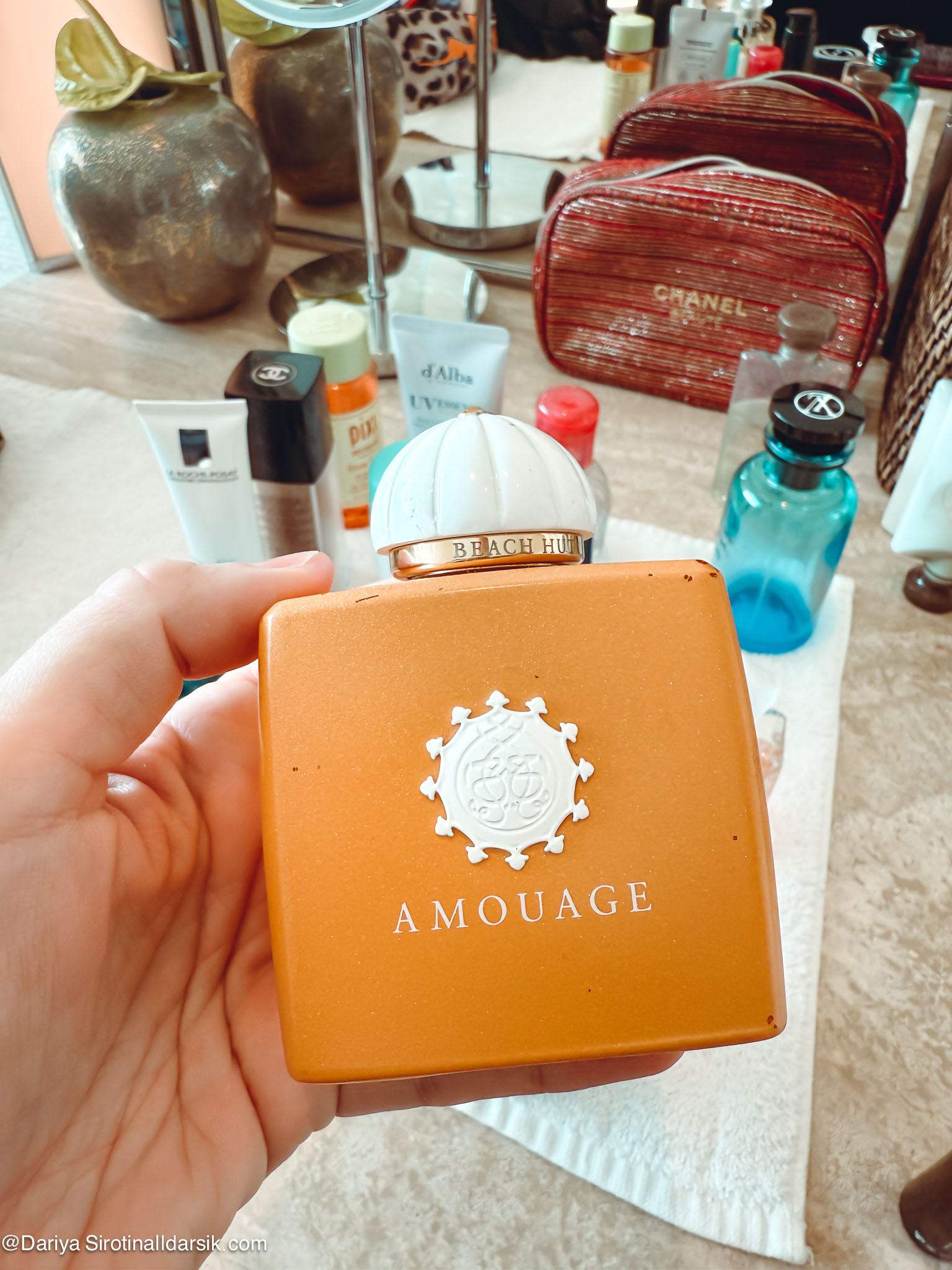Артоматы — это, пожалуй, то, что и отличает косметичку, которую я беру с собой в Италию, от той, что отправляется в Париж, и уж тем более от той, которая сопровождает меня в Дубай. Именно ароматы связывают меня с местом, создают особую связь между мной, ситуацией и выбранной мной одеждой. Немного об этом я писала в материале «Ароматы и наряды: 6 примеров из моего гардероба». Два аромата из этой подборки там фигурировали: это Amouage Beach Hut и Louis Vuitton Afternoon Swim. Первый — воплощение Востока, горячего песка, обнимающего тебя теплого вечера, второй — аромат воды, солнца и прибрежного аперитива. Но на деле Afternoon Swim я почти не доставала и пользовалась днем (читай — наносила на пляжное кимоно) Hermès Un Jardin au Cythère. Это сад, но не цветущий, а выжженный ярким солнцем, с нагретыми камнями и древними оливковыми деревьями. Дубаю и пустыне он очень идет! Все остальные — Nasomatto Black Afgano, подаренный мне мужем со словам «вот тебе восточное», Amouage, также купленный мужем много лет назад, и внезапно полюбившийся мне Chanel Coco Mademoiselle — ароматы вечерние. Дубай мне нравится в том числе и за то, что там сложно переборщить что с ароматом, что с нарядом. По крайней мере мне! Город позволяет яркие выходы и громкие шлейфы, так что я с удовольствием, приезжая туда, начинаю наряжаться и душиться.