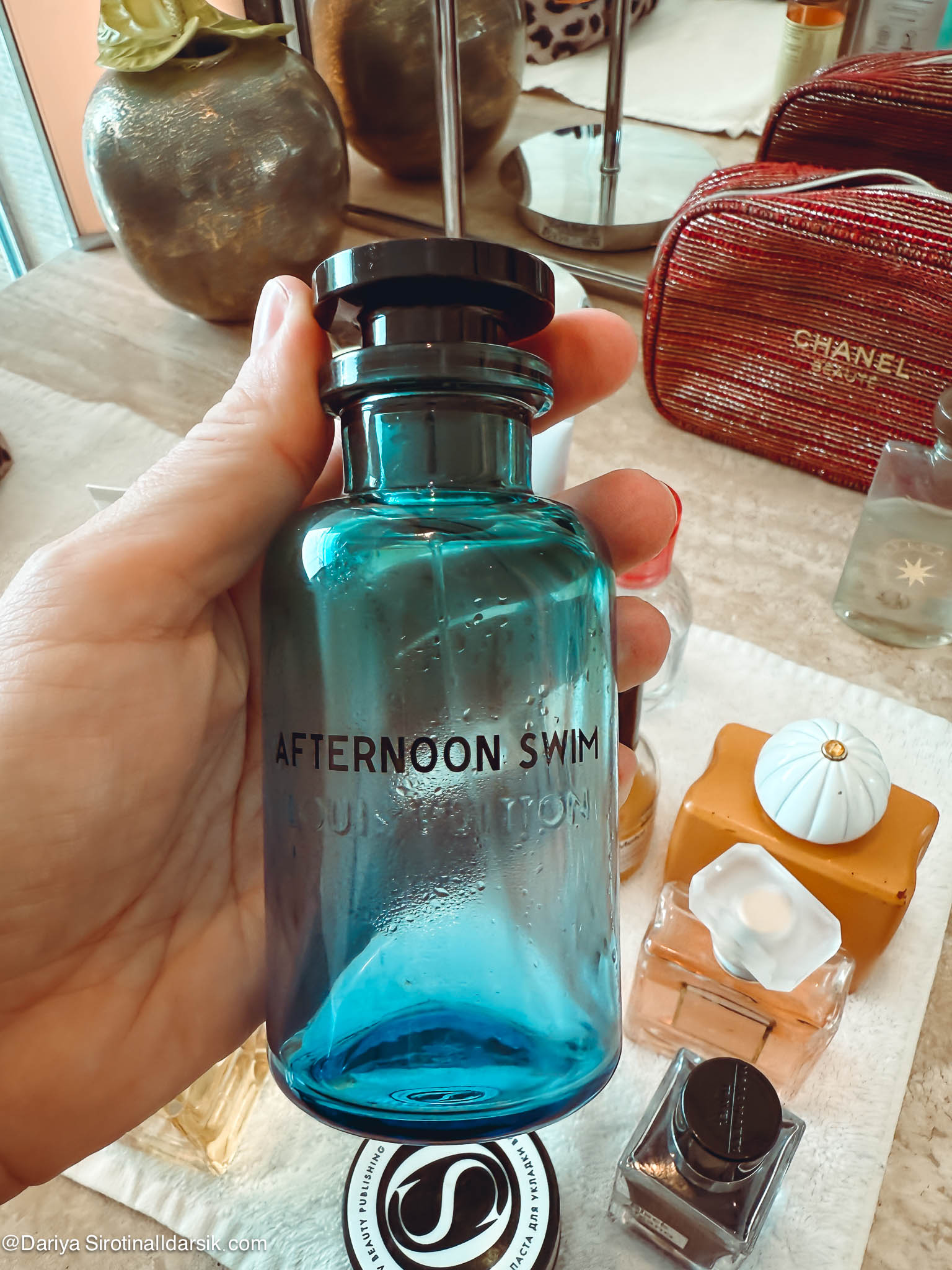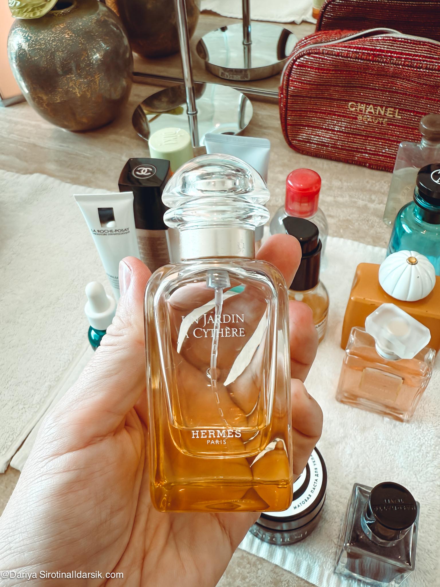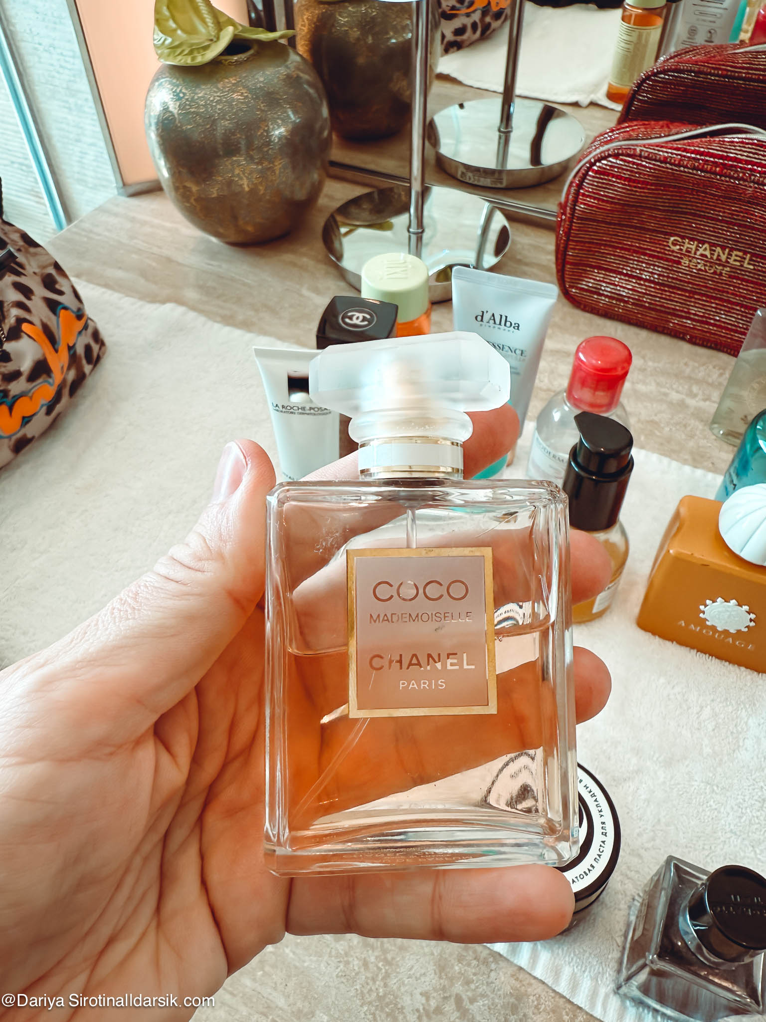 Артоматы — это, пожалуй, то, что и отличает косметичку, которую я беру с собой в Италию, от той, что отправляется в Париж, и уж тем более от той, которая сопровождает меня в Дубай. Именно ароматы связывают меня с местом, создают особую связь между мной, ситуацией и выбранной мной одеждой. Немного об этом я писала в материале «Ароматы и наряды: 6 примеров из моего гардероба». Два аромата из этой подборки там фигурировали: это Amouage Beach Hut и Louis Vuitton Afternoon Swim. Первый — воплощение Востока, горячего песка, обнимающего тебя теплого вечера, второй — аромат воды, солнца и прибрежного аперитива. Но на деле Afternoon Swim я почти не доставала и пользовалась днем (читай — наносила на пляжное кимоно) Hermès Un Jardin au Cythère. Это сад, но не цветущий, а выжженный ярким солнцем, с нагретыми камнями и древними оливковыми деревьями. Дубаю и пустыне он очень идет! Все остальные — Nasomatto Black Afgano, подаренный мне мужем со словам «вот тебе восточное», Amouage, также купленный мужем много лет назад, и внезапно полюбившийся мне Chanel Coco Mademoiselle — ароматы вечерние. Дубай мне нравится в том числе и за то, что там сложно переборщить что с ароматом, что с нарядом. По крайней мере мне! Город позволяет яркие выходы и громкие шлейфы, так что я с удовольствием, приезжая туда, начинаю наряжаться и душиться.