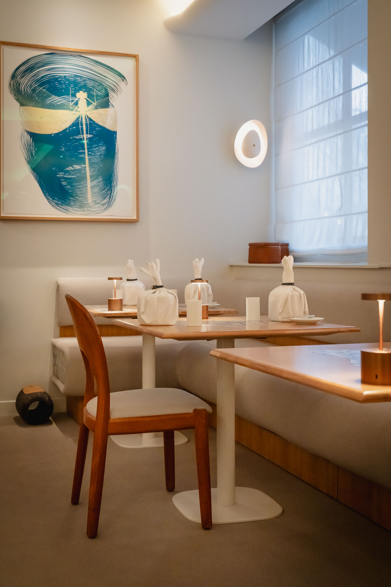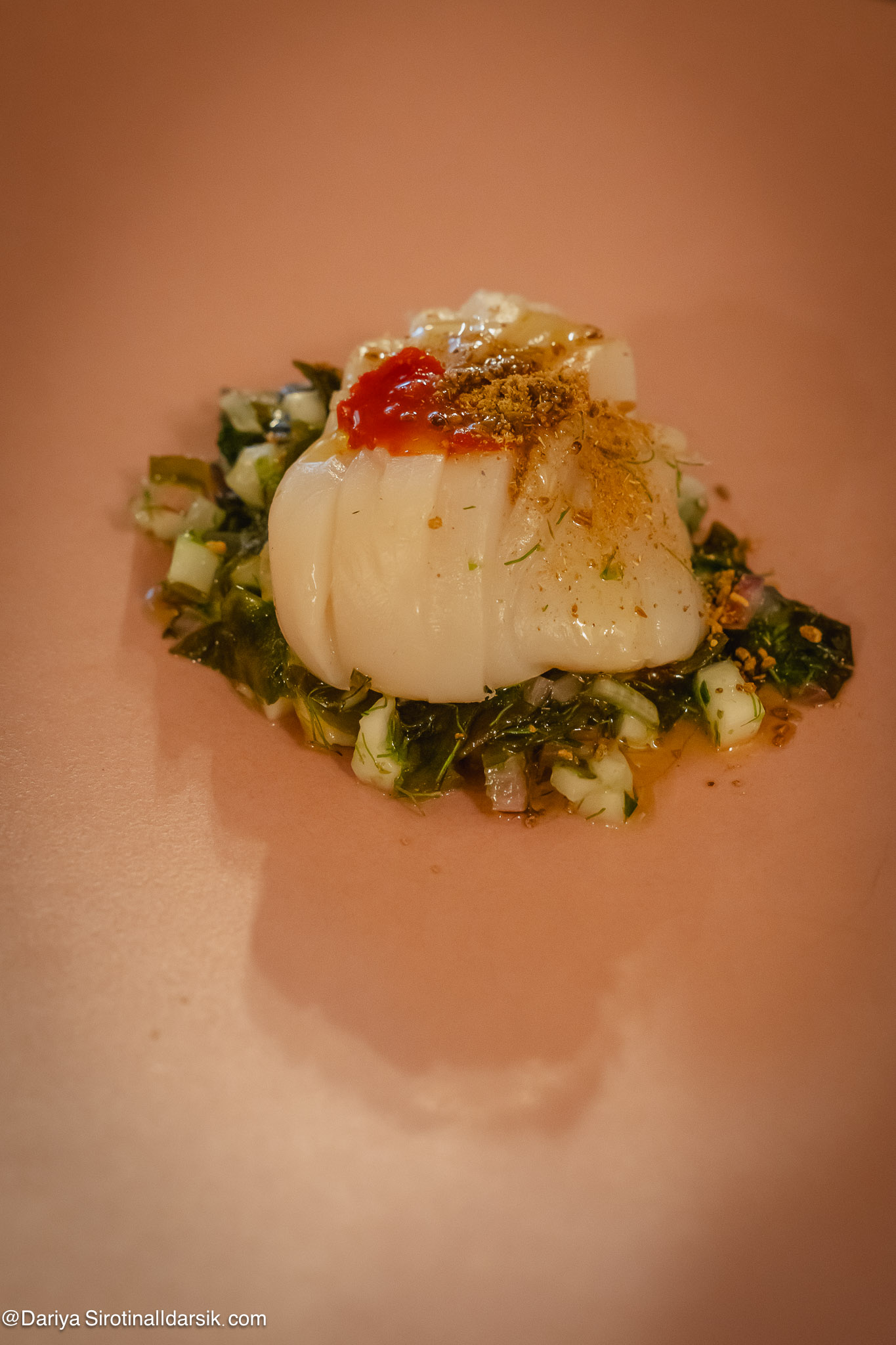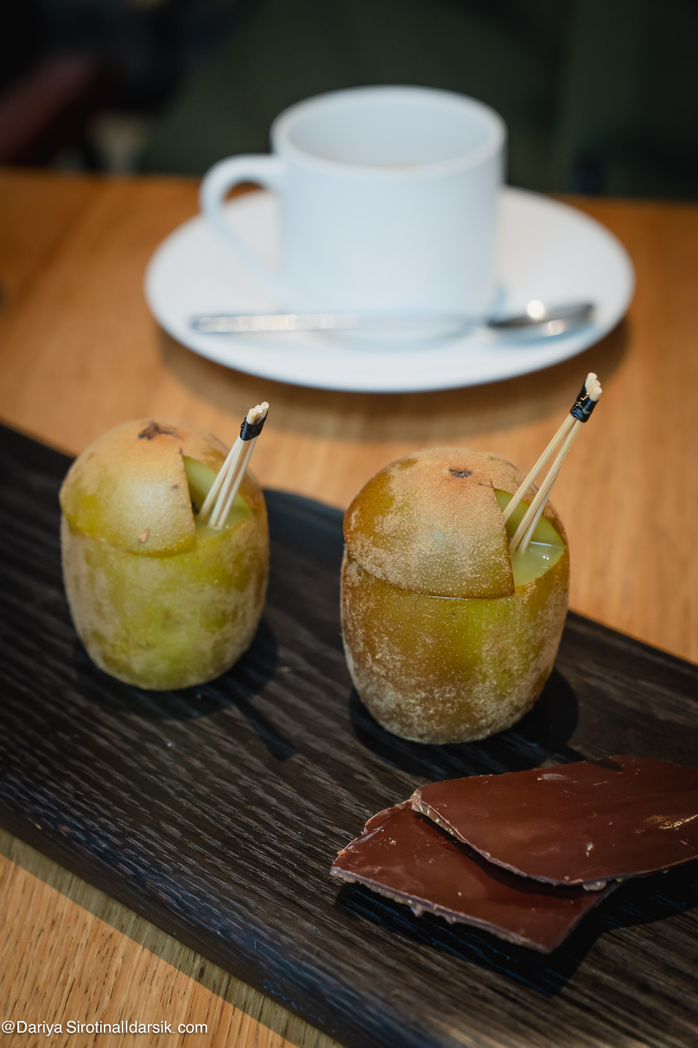 Среди обязательных подач в Onor — приготовленные на манер ризотто соевые проростки с сырой устрицей. Дань японскому рамену — маринованное в красном вине яйцо, поданное с дюкселем из грибов и салом. В платочки на манер фуросики, традиционной японской техники упаковки, завязаны этажерки, на которых подаются закуски. Все одновременно скромно, но эффектно! Обратите внимание, что и здесь, и в La Scène, и во многих других отличных парижских ресторанах действует обеденное меню: в Onor сет из 4 подач стоит очень скромные для ресторана такого уровня 90 евро.