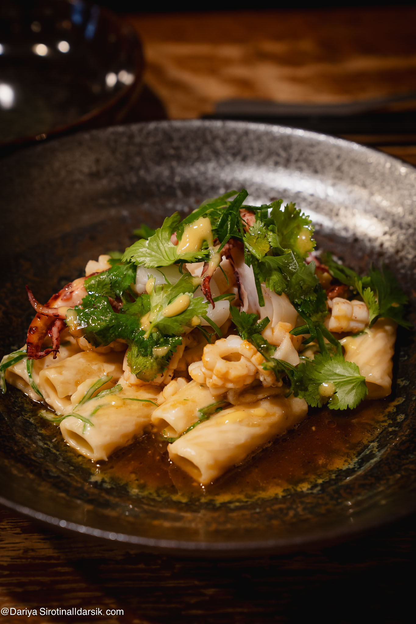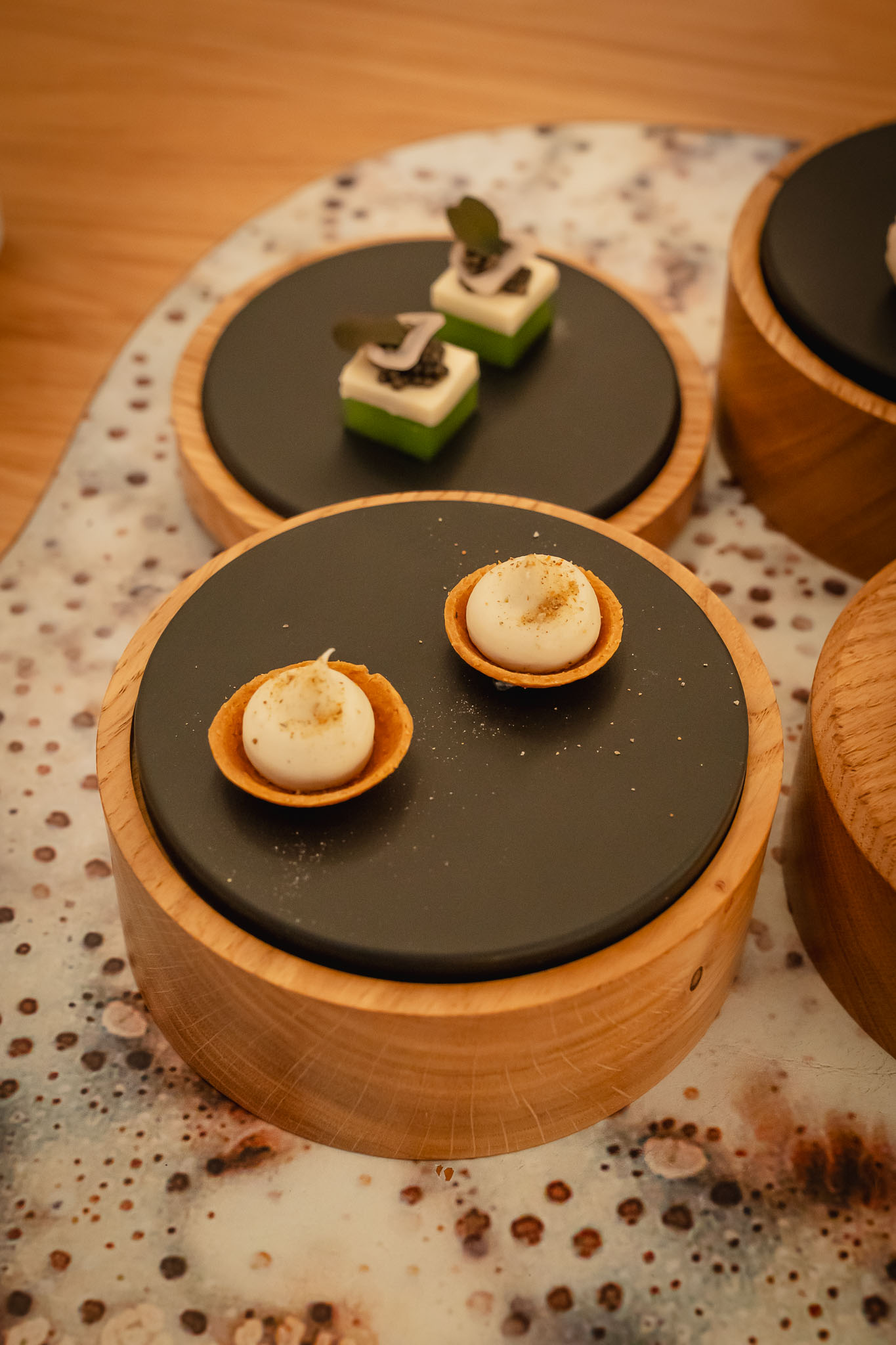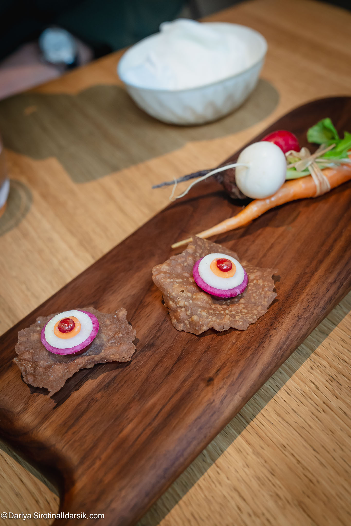 Среди обязательных подач в Onor — приготовленные на манер ризотто соевые проростки с сырой устрицей. Дань японскому рамену — маринованное в красном вине яйцо, поданное с дюкселем из грибов и салом. В платочки на манер фуросики, традиционной японской техники упаковки, завязаны этажерки, на которых подаются закуски. Все одновременно скромно, но эффектно! Обратите внимание, что и здесь, и в La Scène, и во многих других отличных парижских ресторанах действует обеденное меню: в Onor сет из 4 подач стоит очень скромные для ресторана такого уровня 90 евро.