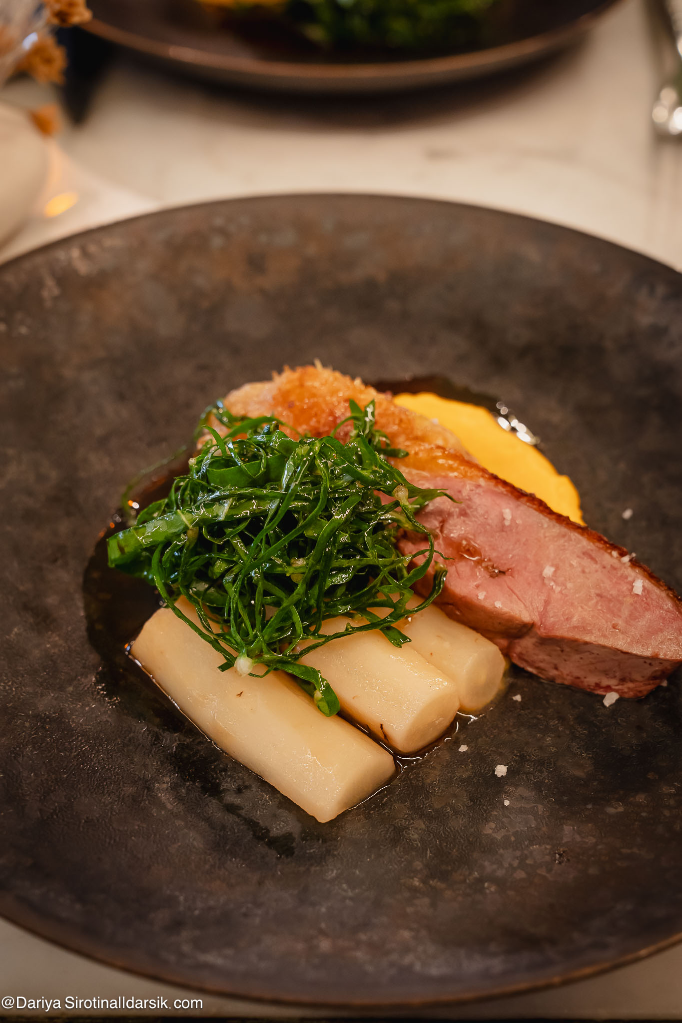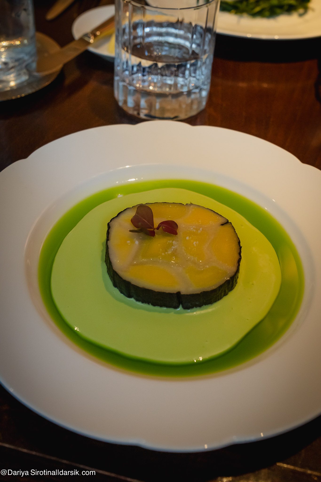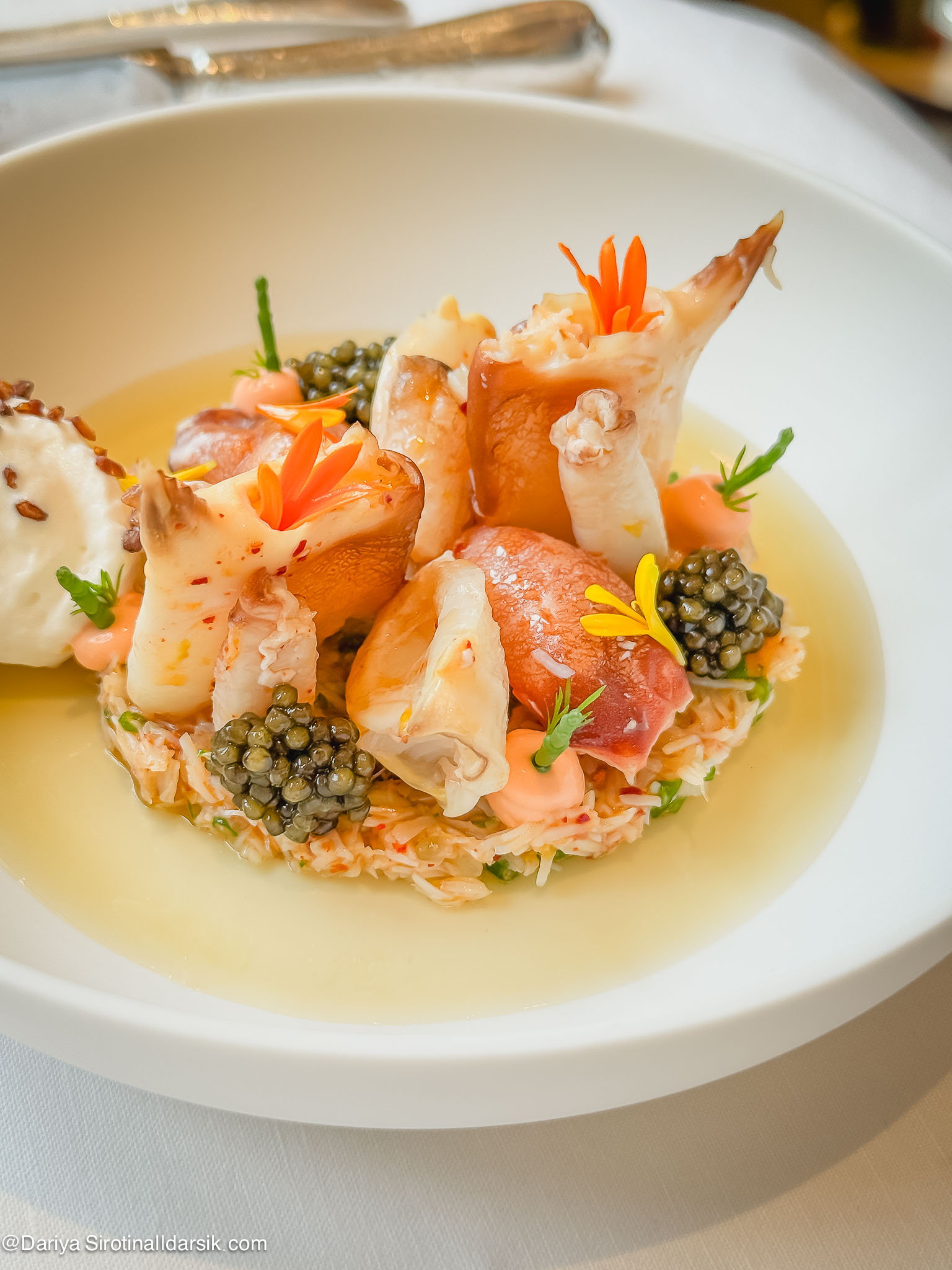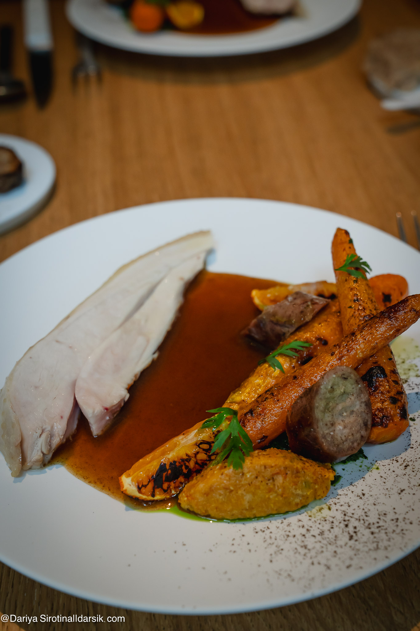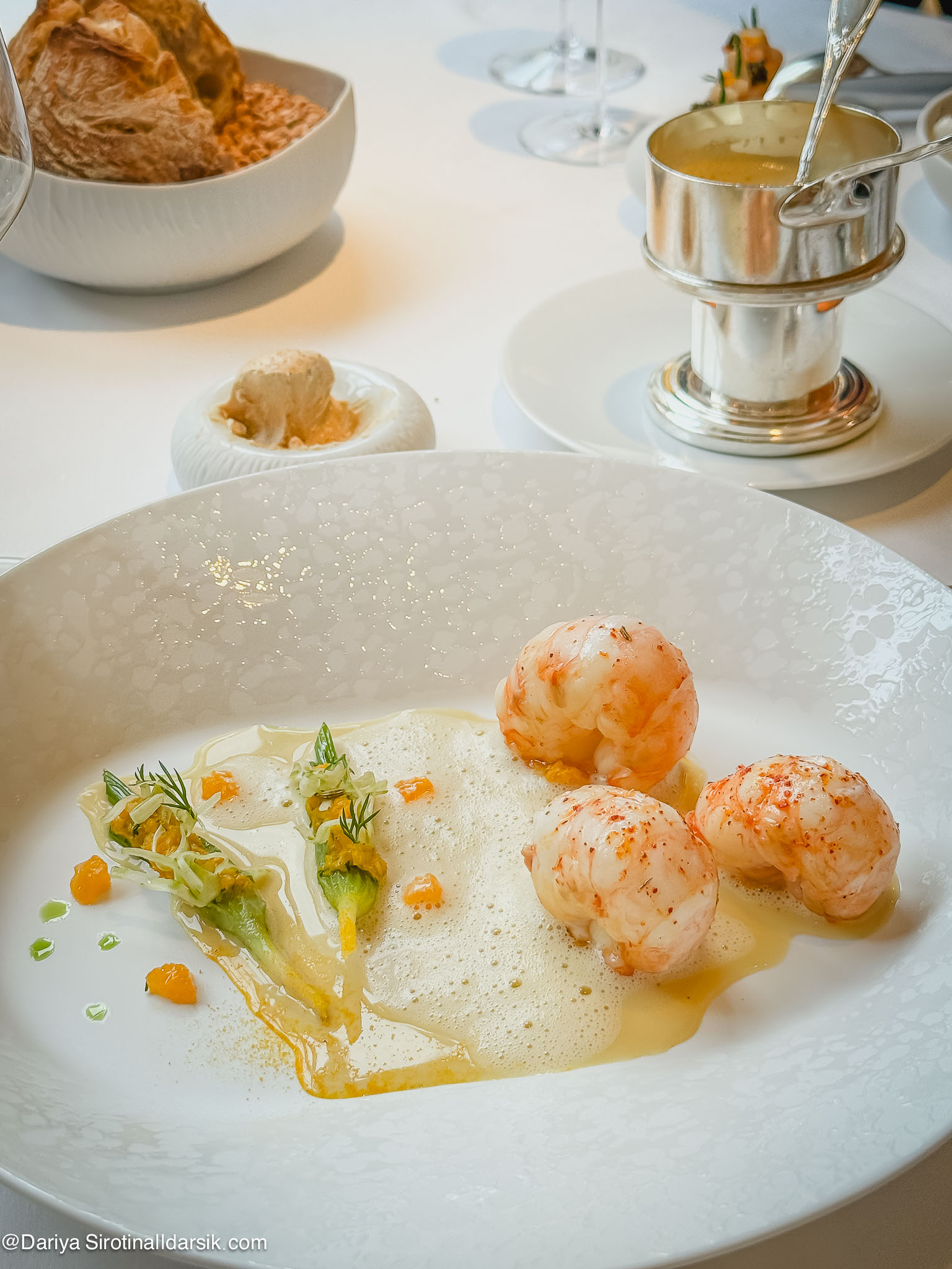 Из старого меню остались только легендарная бресская курица и краб, причем у последнего изменилась подача. Курица эта в двух подачах, готовится в бычьем мочевом пузыре (фактически этот способ — архаичная версия сувида) и выносится в нем к вам на серебряной подставке с куриными серебряными лапами. Официант протыкает пузырь, извлекает идеальную бресскую курочку, разделывает ее перед вами, подает вам части грудки, а оставшееся отправляет на кухню для того, чтобы мясо дошло до нужной кондиции и стало основой второй подачи.