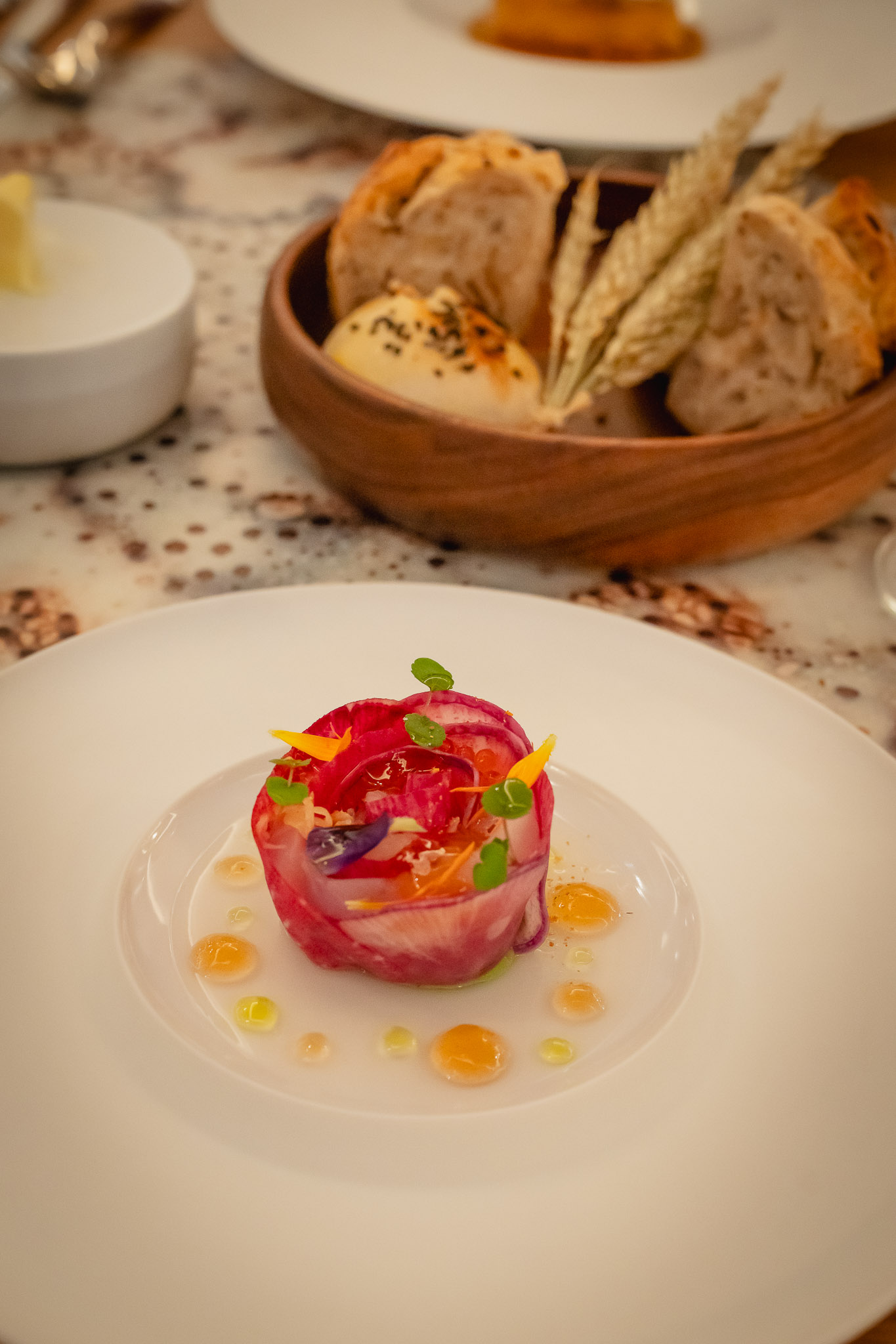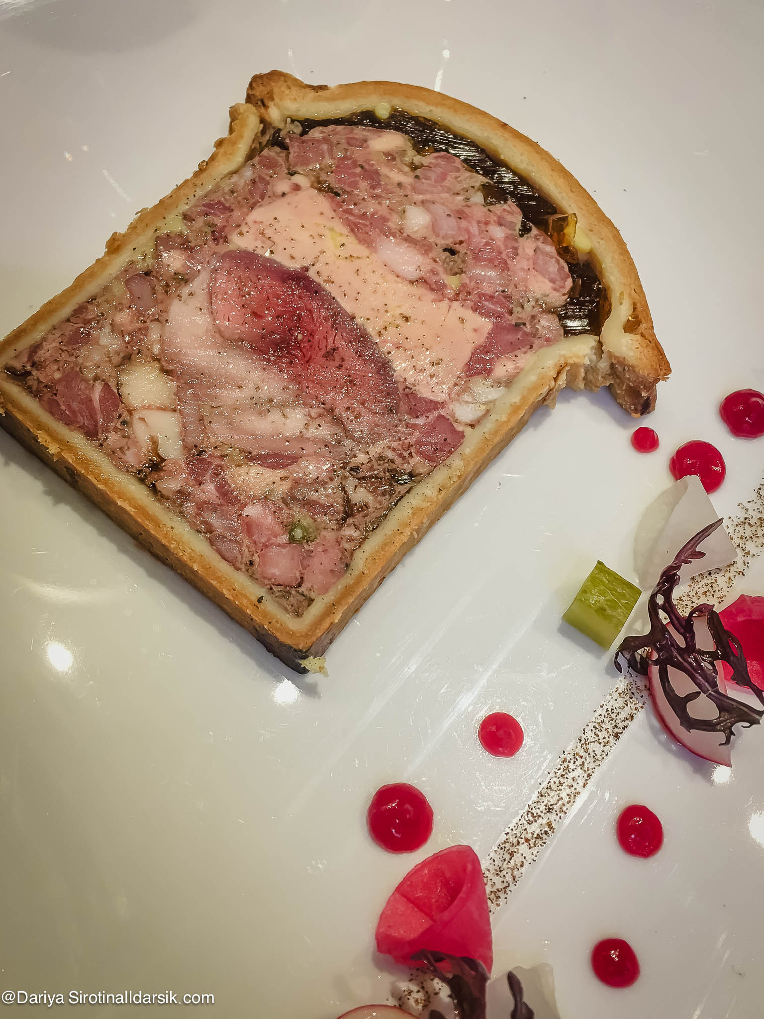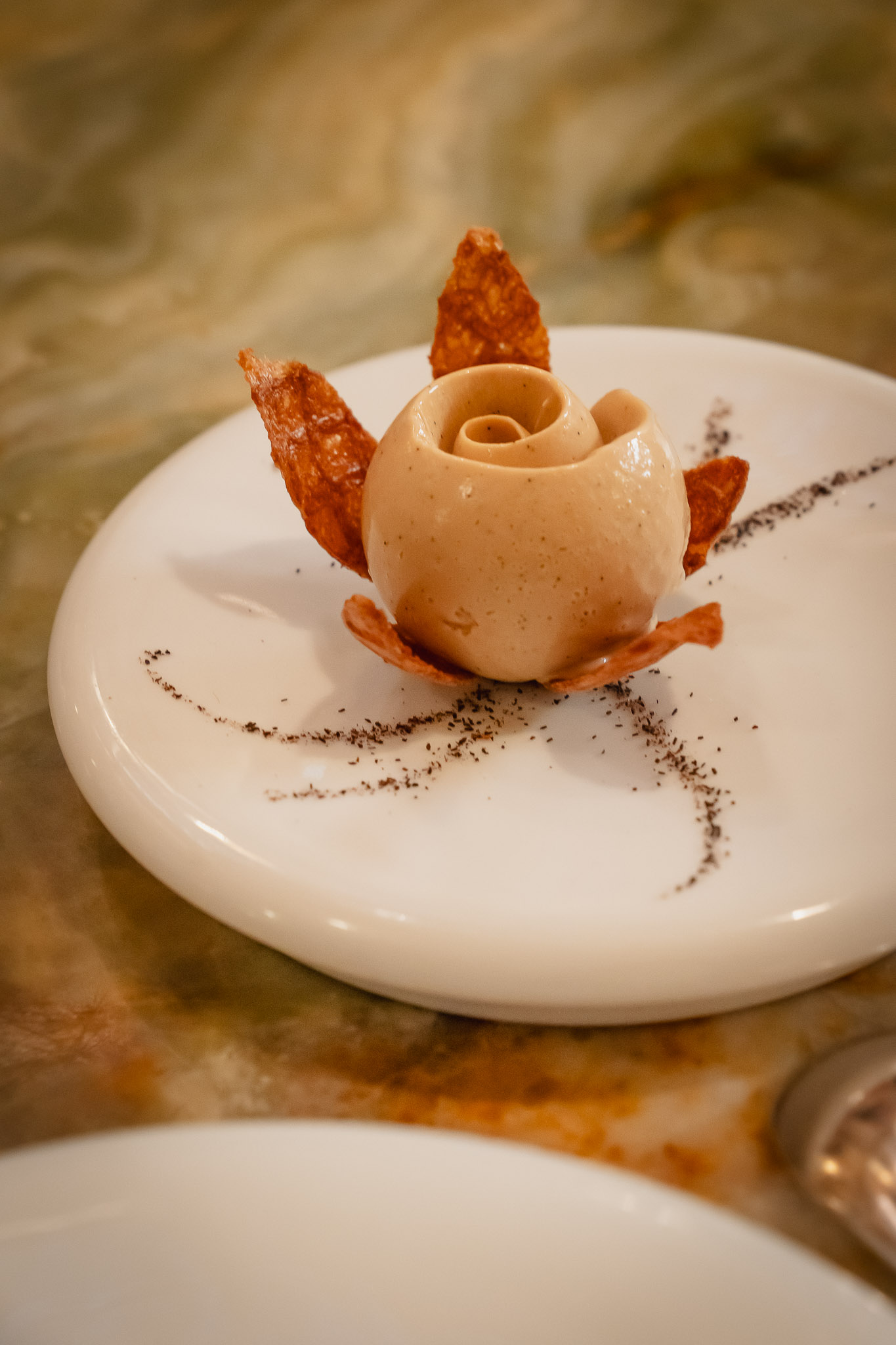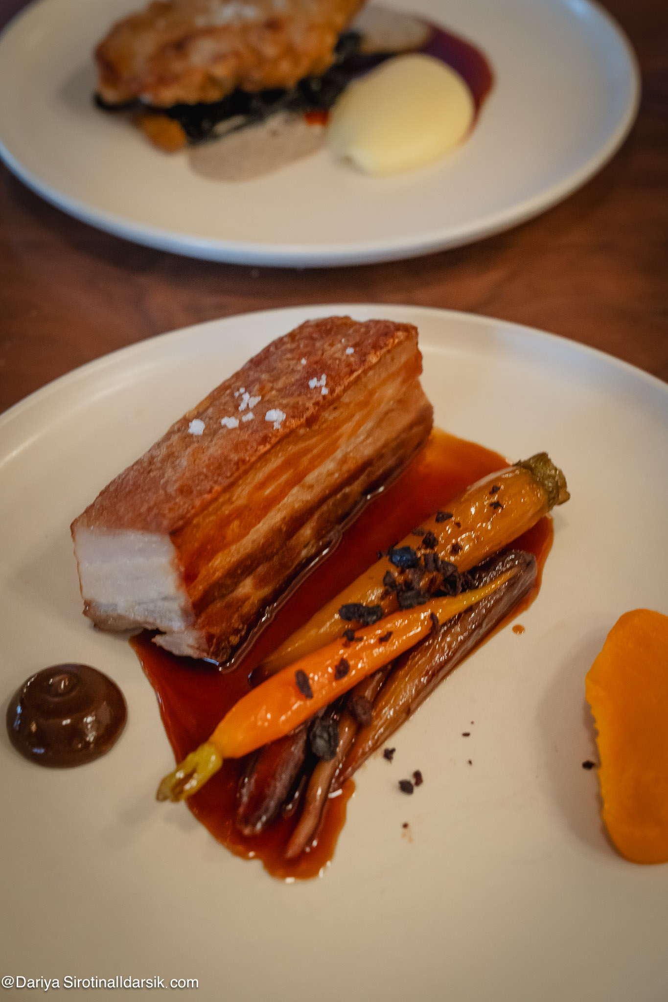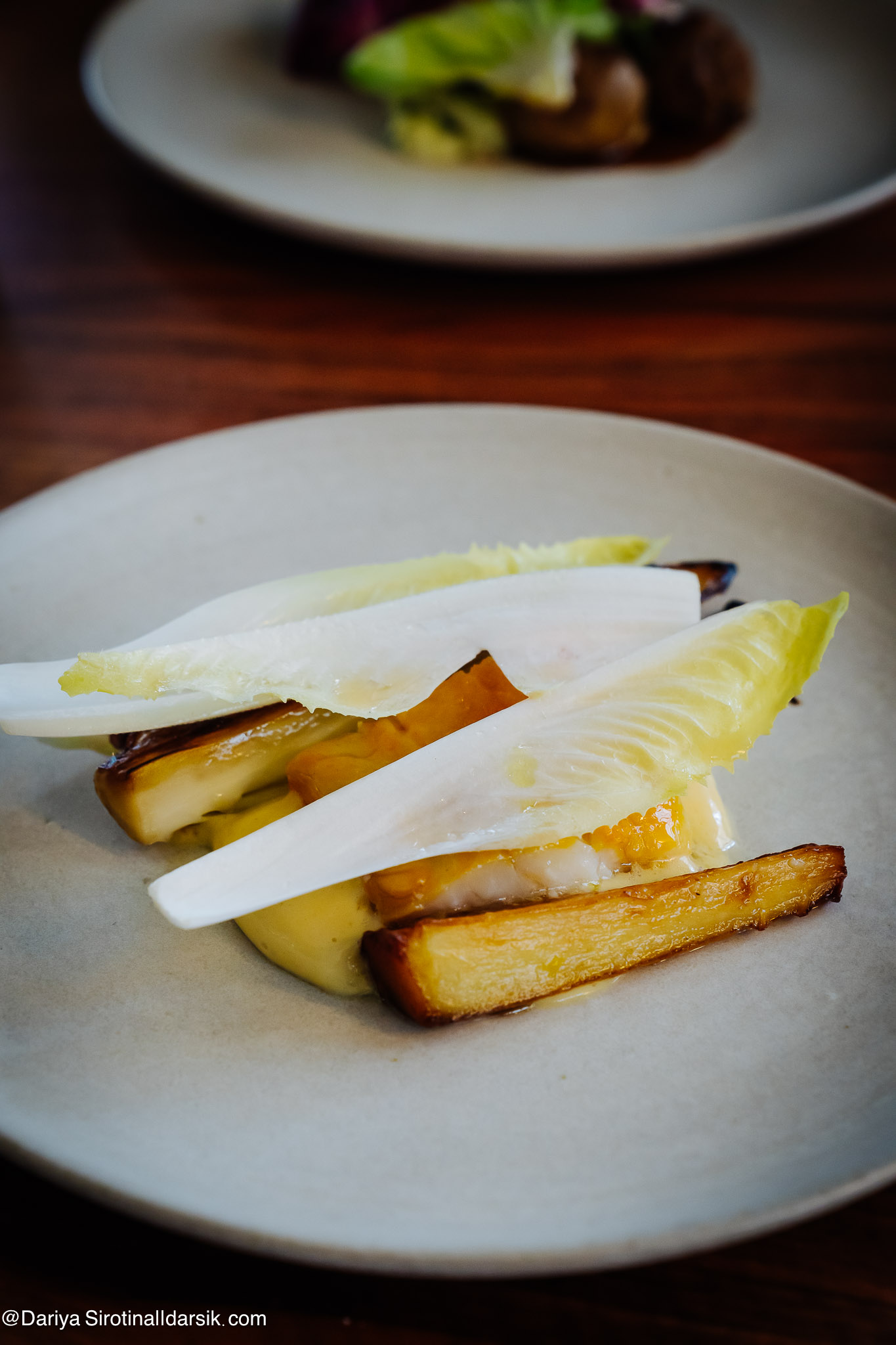 Из старого меню остались только легендарная бресская курица и краб, причем у последнего изменилась подача. Курица эта в двух подачах, готовится в бычьем мочевом пузыре (фактически этот способ — архаичная версия сувида) и выносится в нем к вам на серебряной подставке с куриными серебряными лапами. Официант протыкает пузырь, извлекает идеальную бресскую курочку, разделывает ее перед вами, подает вам части грудки, а оставшееся отправляет на кухню для того, чтобы мясо дошло до нужной кондиции и стало основой второй подачи.