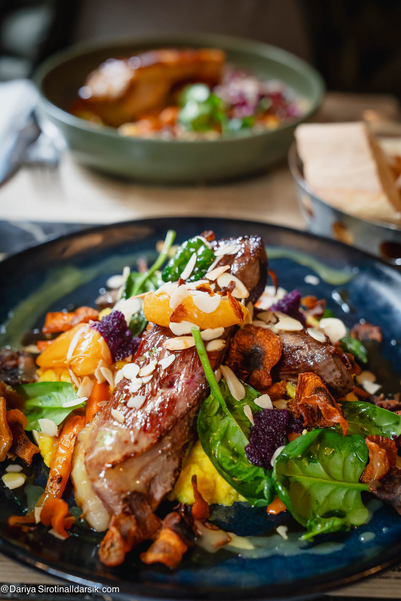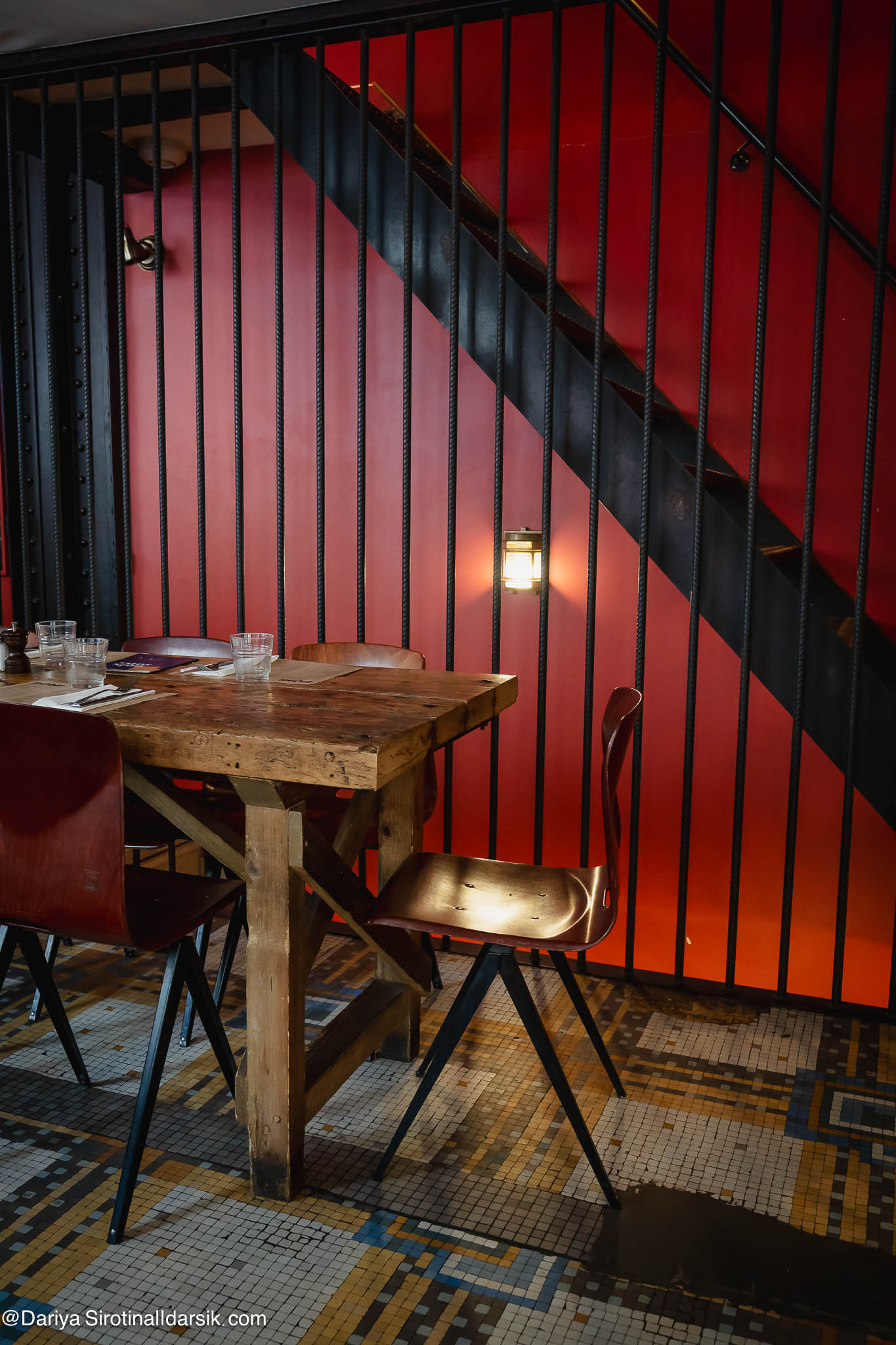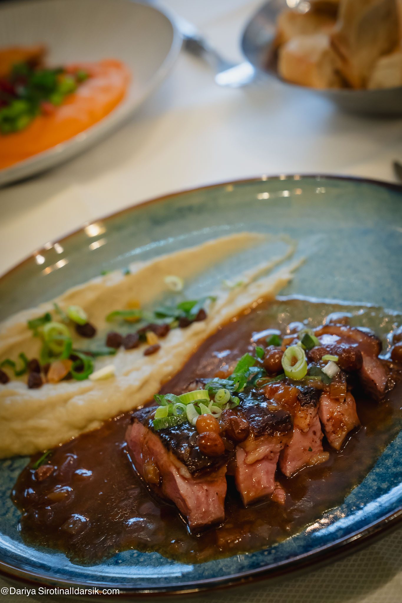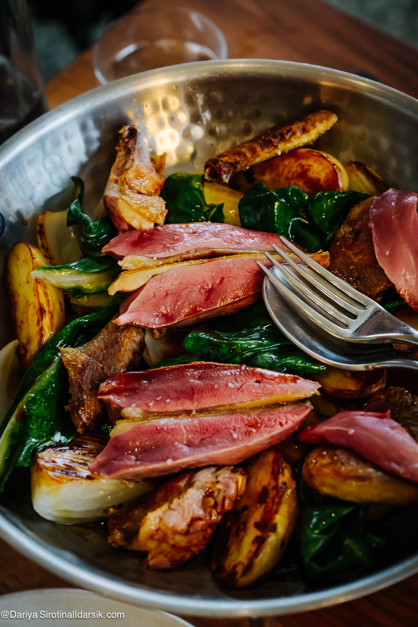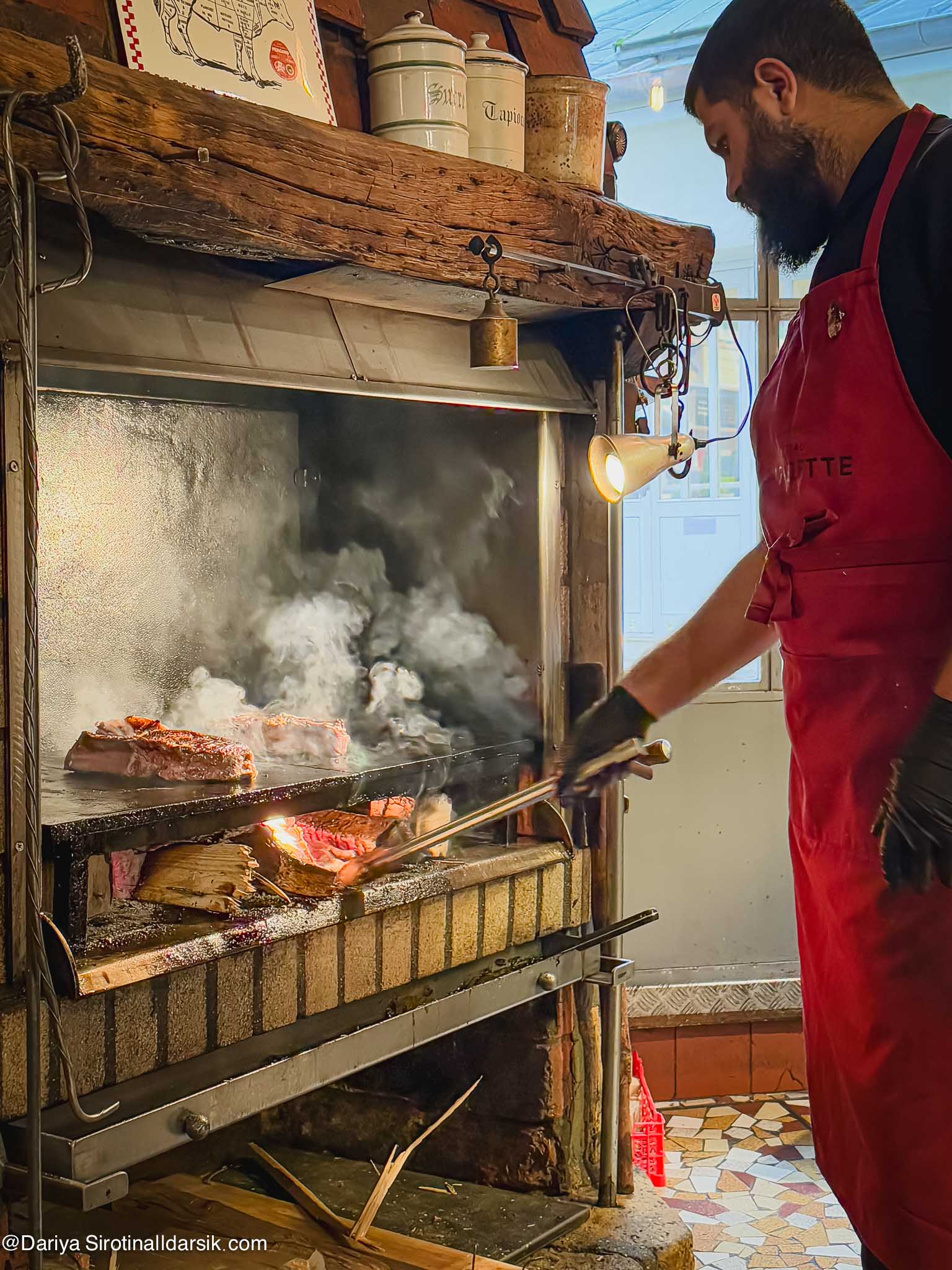 Не ожидала, что такого плана место можно найти в центре Парижа, в Марэ! Представьте: вы идете субботним днем по улице в Марэ, вокруг — интернациональная публика, витрины магазинов и галерей. Полный Париж, другими словами! Открываете дверь в ресторан и оказываетесь будто бы в деревенском трактире: грубые общие столы, видавшая виды барная стойка и дровяной гриль прямо в зале! Я такого не видела никогда! Мясо готовят при вас, но не в виде шоу и не на какой-то специально придуманной открытой кухне, а просто так все устроено, что вы становитесь свидетелем процесса приготовления. Готовят без премудростей, все очень просто, но продукты доведены до идеала. Мы выбрали утиную грудку на двоих и остались очень довольны.