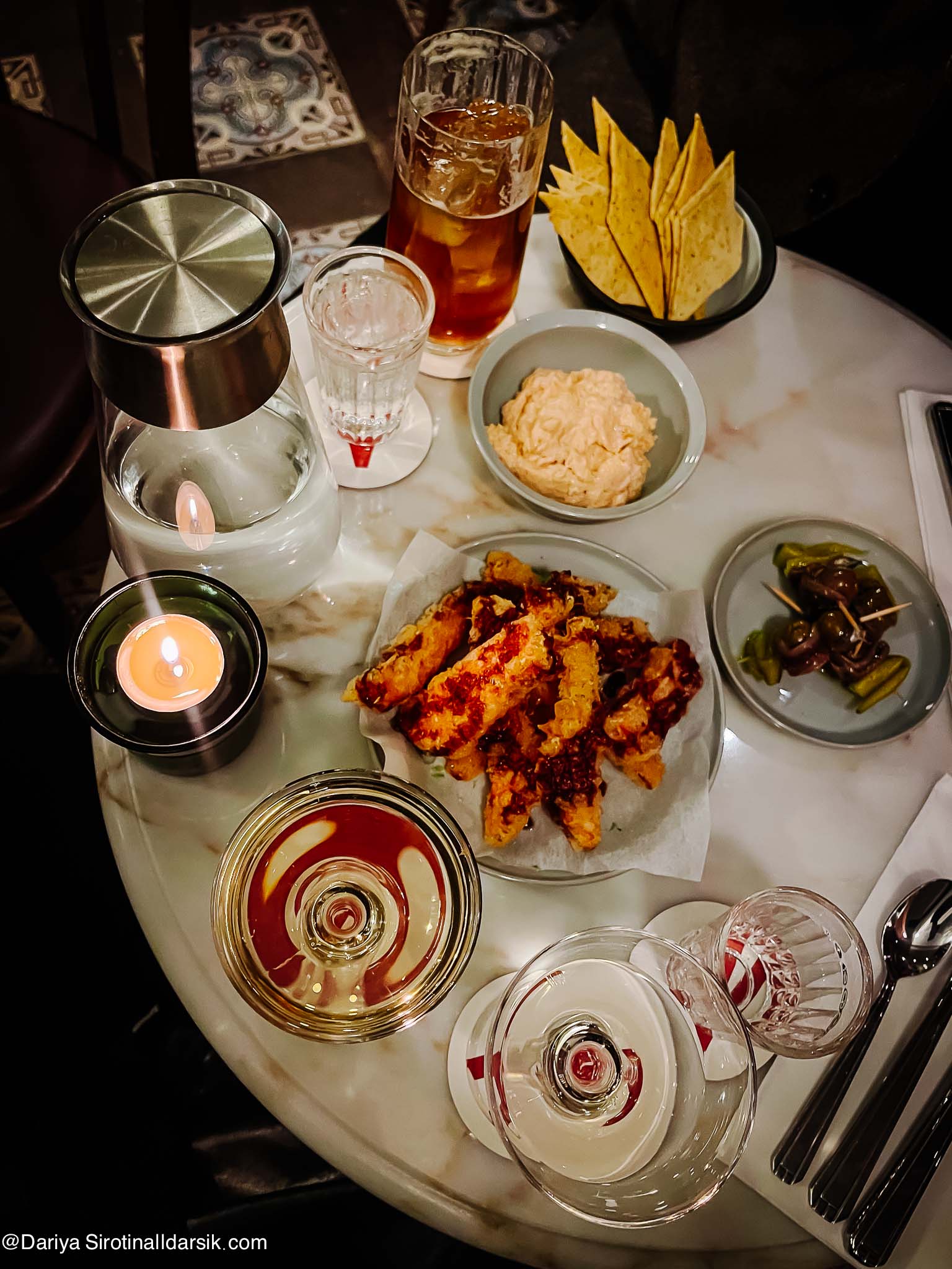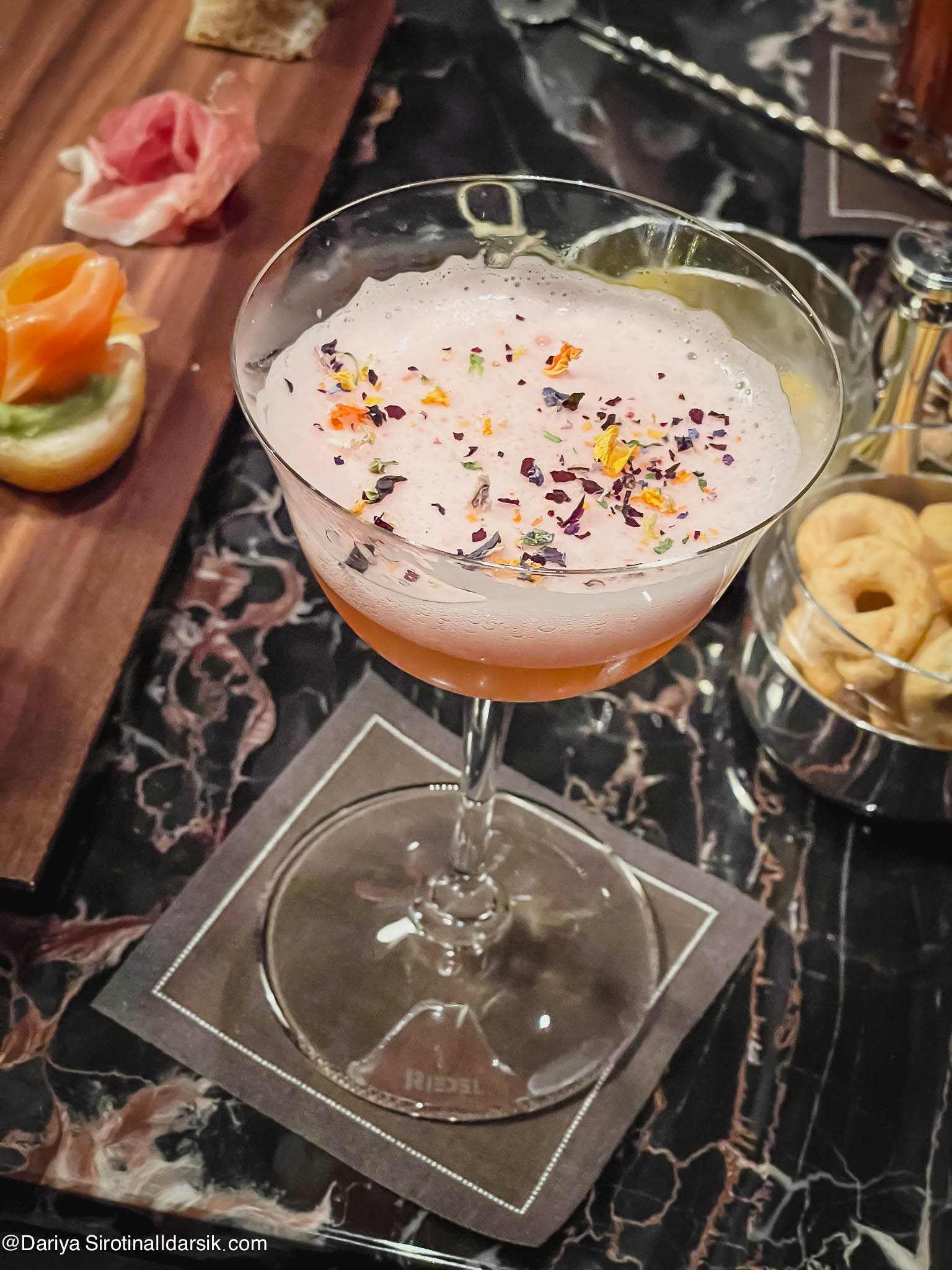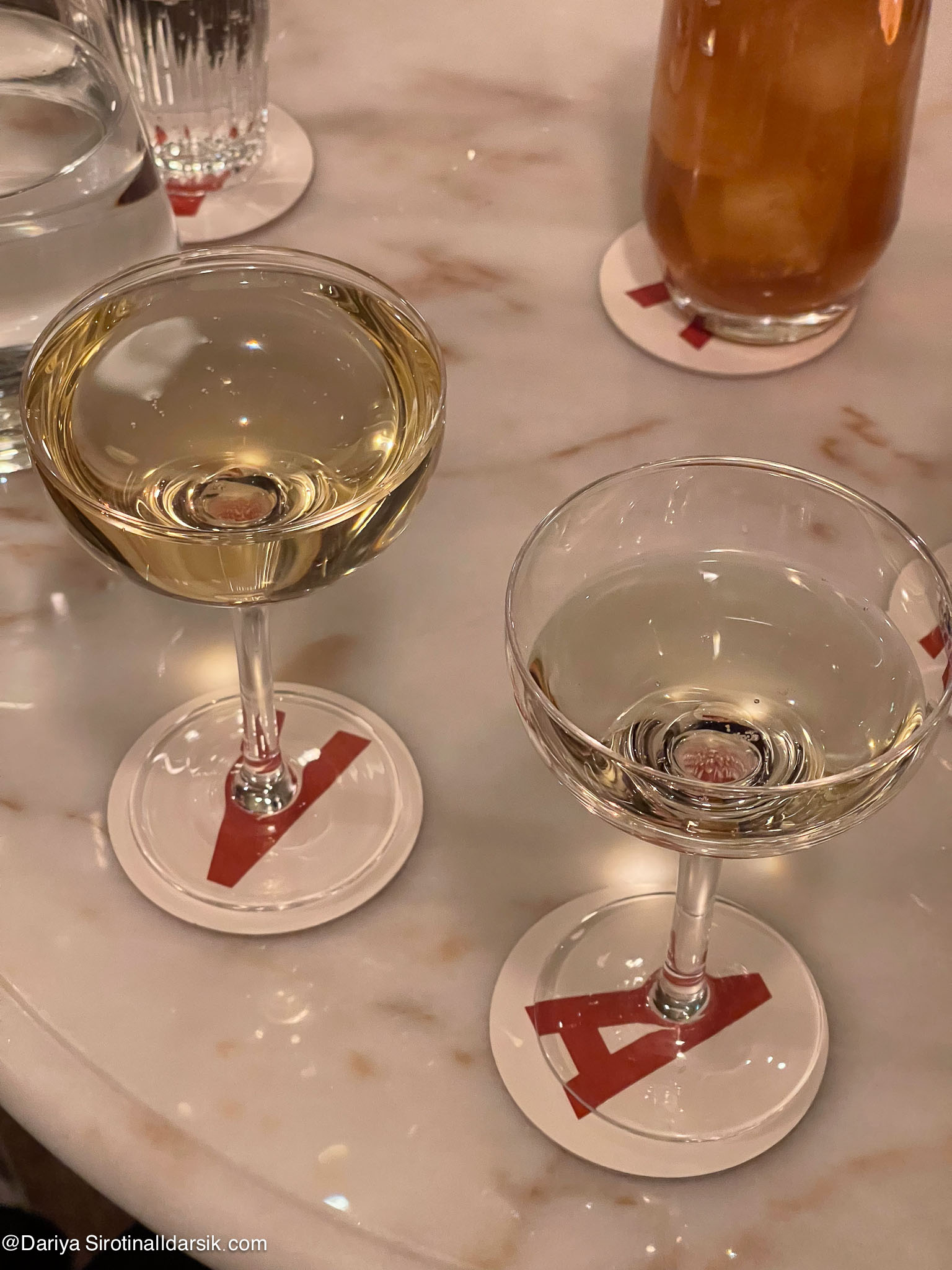 Cravan взял под свое крыло LVMH. И бар зашел на очень рискованную территорию коктейлей с напитками, входящими в портфель LVMH, начав делать в том числе и коктейли с шампанским. Я за время своего знакомства с баром пробовала разные версии коктейлей на основе шампанского и все они были хороши! Например, Royal Royal на основе Dom Perignon 2013 приносят в 2 бокалах: в одном собственно шампанское, в другом оно же плюс редукция из него же. Концентрированный вкус, большая плотность, острее перляж. Разница видна даже на фото! И, главное, испортить шампанское этими манипуляциями не удается, что не перестает меня удивлять. Коктейли с коньяком, естественно, тоже есть.