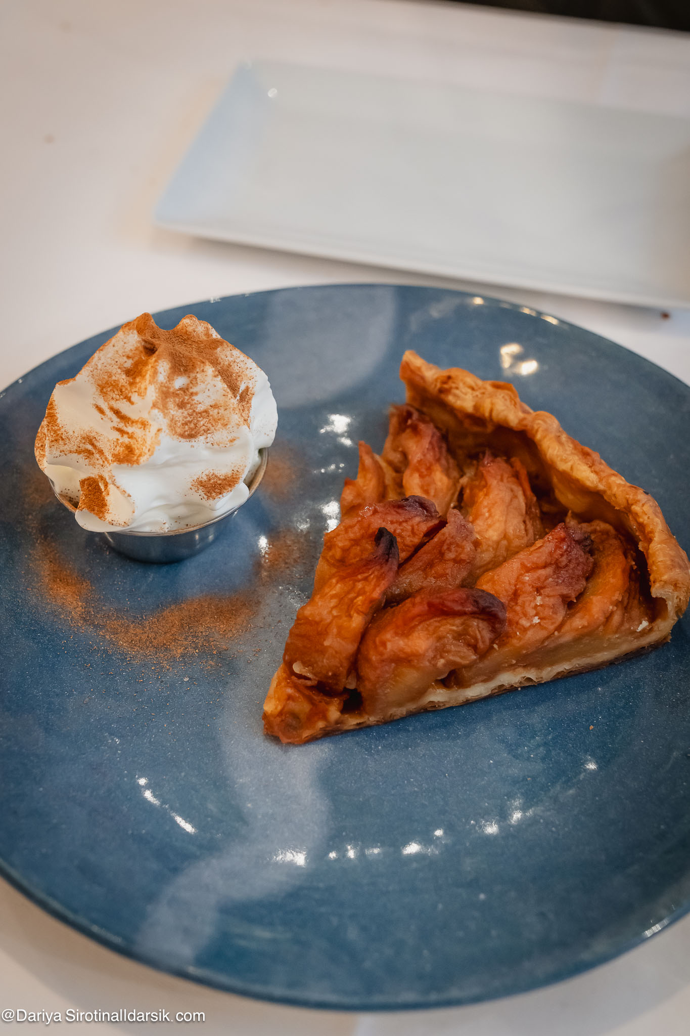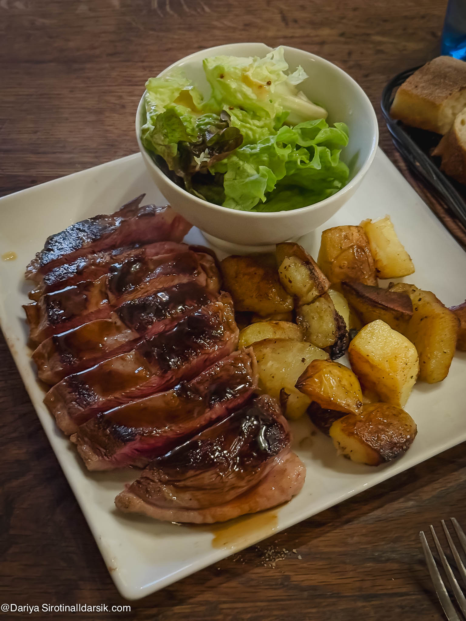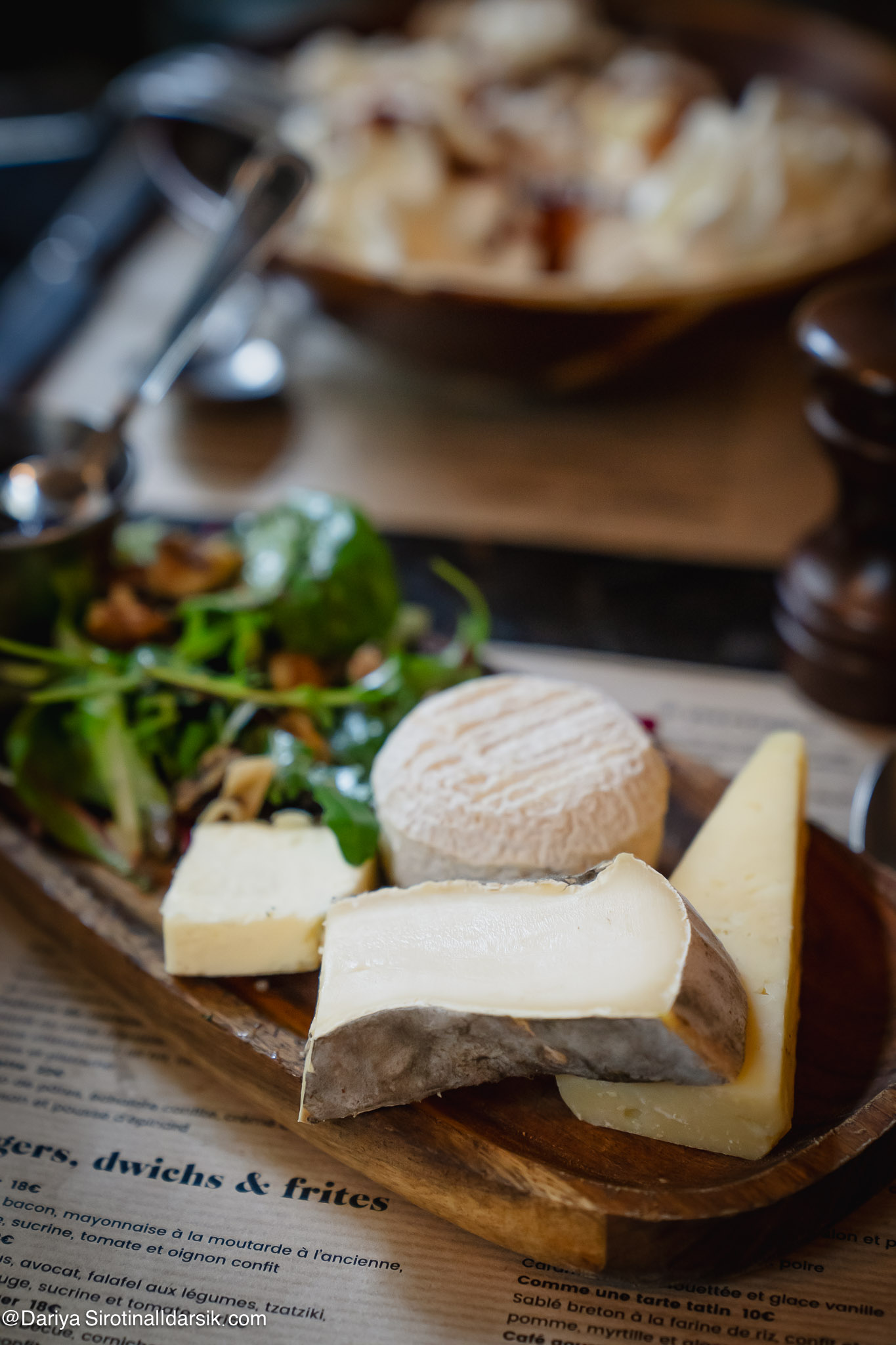 Столиков меньше, чем в Le Cyrano, я не видела никогда. Я много лет не могу привыкнуть к тому, как неразлучны парижане со своей верхней одеждой (ее принято пихать куда-нибудь за себя, на спинку дивана, или вешать на спинку стула, ибо гардеробы есть только в ресторанах верхней ценовой группы), но с годами одежда становится все больше, а рестораны и столики — все меньше. Короче, пойдете сюда — оверсайз не надевайте! Также я никогда не видела, чтобы шеф подходил к меню как к конструктору, используя одни и те же ингредиенты в одной и той же форме и обработке в разных блюдах. Понятно, что это позволяет управлять себестоимостью (а в Париже, впрочем, как и везде, все сильно подорожало), но такой подход тянет, не знаю, на новую искренность. Дорогих ингредиентов тут нет (я даже не про икру, краба или там фуа-гра, а просто даже рыбы и мяса в качестве основного блюда лично я не застала), меню крошечное. Зато флан из картофеля был похож на слоеный пирог за счет тонкости картофельных лепестков. Присоединюсь к восторженному хору французских критиков, в том числе гида Pudlo (читайте правильные гиды и будет вам вкусно!), и пожелаю вам не побояться Клиши и картошки и сюда зайти. Соберетесь — на аперитив цельтесь или в винный бар Les P’tits Potes, или в Au Petit Rozey. Оба они находятся рядом.