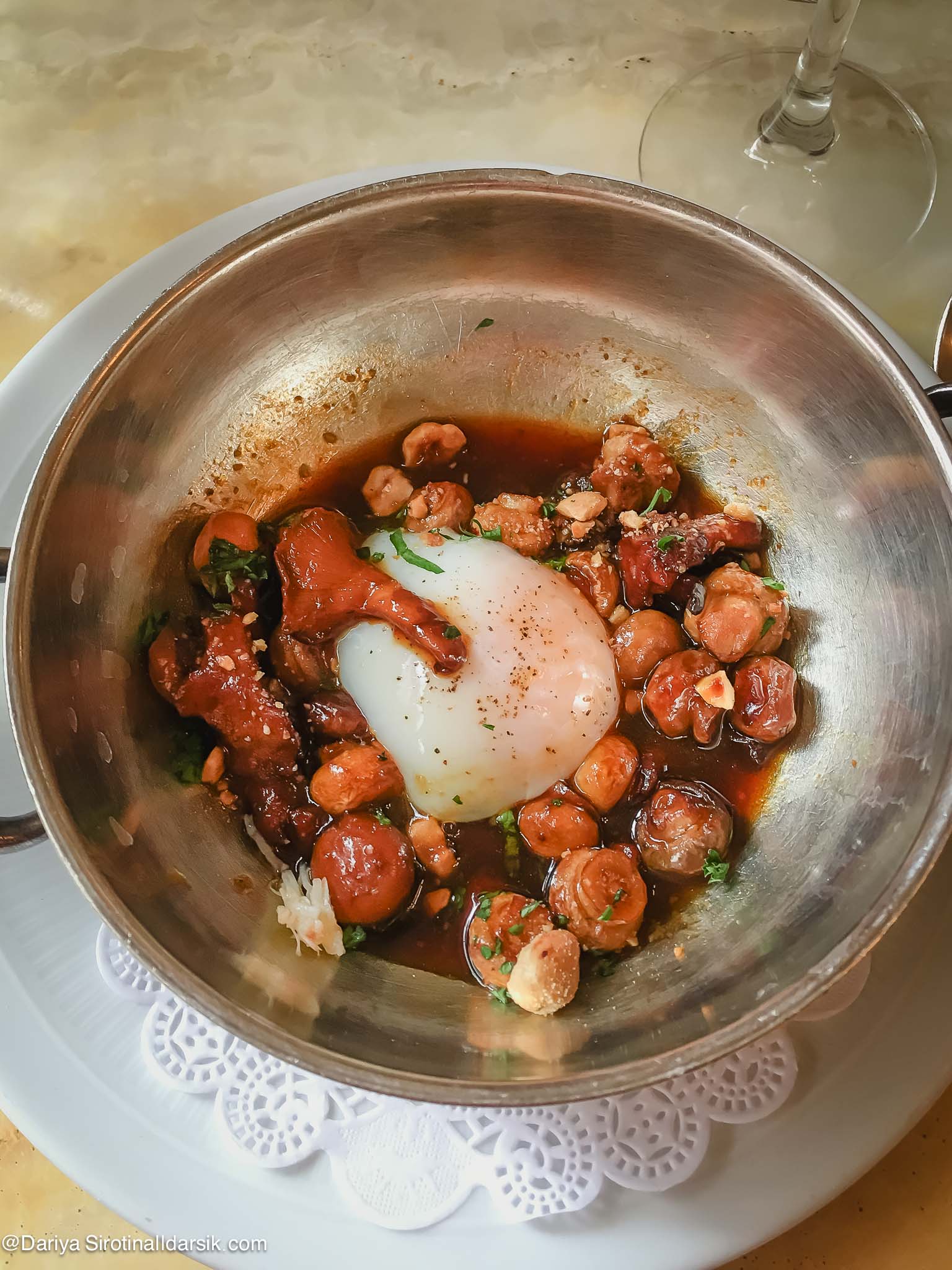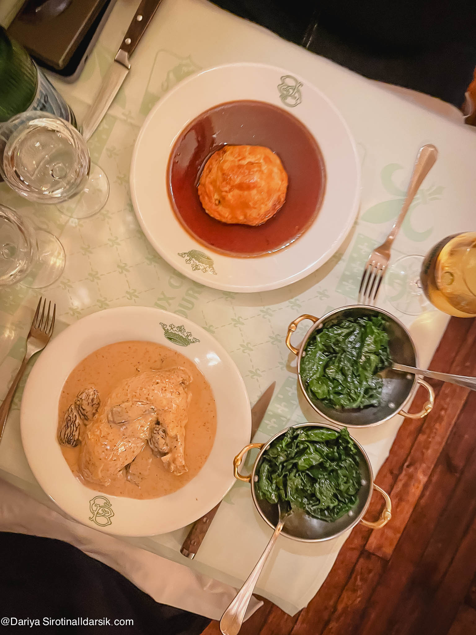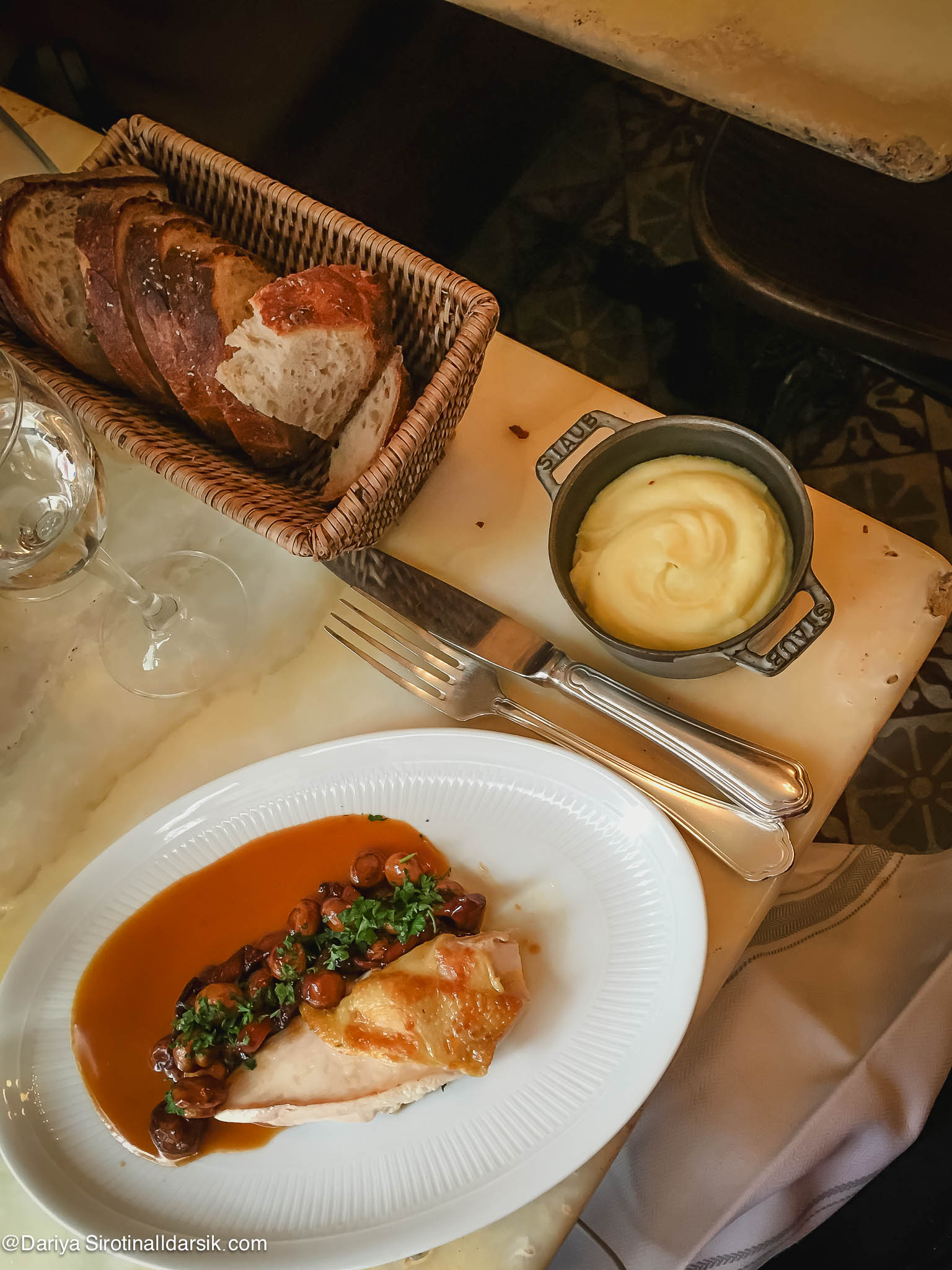 Побывать в Бургундии и напиться в конце концов бургундского по месту его произрастания и производства — моя мечта еще с тех пор, как я училась в школе сомелье. Мечта все никак не реализуется… Зато в Париже я открыла для себя очень простое бургундское бистро во втором округе — Aux Crus de Bourgogne. Выглядит оно так, будто бы ты ехал на поезде, сошел на вокзале где-нибудь в Дижоне, завернул за угол и обнаружил ресторан, в котором ничего не менялось лет сто. Если присмотритесь, увидите не только крашеные густой масляной краской стены, но и жаккардовое полотенце, которым покрывают стол. Толстые сероватые щербатые тарелки, видавшие виды приборы покорили мое сердце, а карты аппелласьонов на стенах заставили меня вспомнить, как я зубрила шассань-монраше, батар-монраше и их соседей (и, между прочим, сдала на пять с плюсом французские вина самому Сандро Хатиашвили). Aux Crus de Bourgogne работает с 1932 года. Еда здесь простая до невозможности (я пишу это не в первый раз, но я действительно предпочитаю рестораны, где сначала идет продукт, потом продукт, потом снова продукт, потом техника, а амбиции шефа вообще замыкают список). Яйца «Мимоза», эта классика французских бистро, лишены каких-либо современных наворотов или улучшений — просто яйца, просто майонез. Курица со сморчками сопровождена насыщенным соусом на основе vin jaune, желтого вина, как во Франции принято называть вина из региона Юра. Аутентично и очень вкусно!