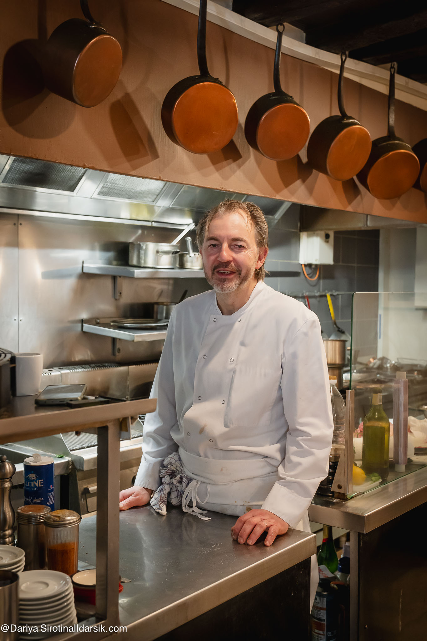 Шефа и владельца зовут Гюго Вольфер. Готовит он всегда только сам на виду у гостей. В ресторане два маленьких зала: в первом кухонная станция и один или два столика, во втором уместится еще десяток человек. Сервис тут очень неторопливый, потому что помощников на кухне у Гюго нет. Кроме него в La Cordonnerie работает официантка да за ширмой гремит тарелками и кастрюлями посудомойщик. Еда очень и очень простая: говяжий язык, свиные сосиски, рыба в соусе из сливочного масла и лимона. Гюго сокрушается, что молодое поколение не имеет вкуса к потрохам и прочим мясным запчастям, но готовить их не перестает.