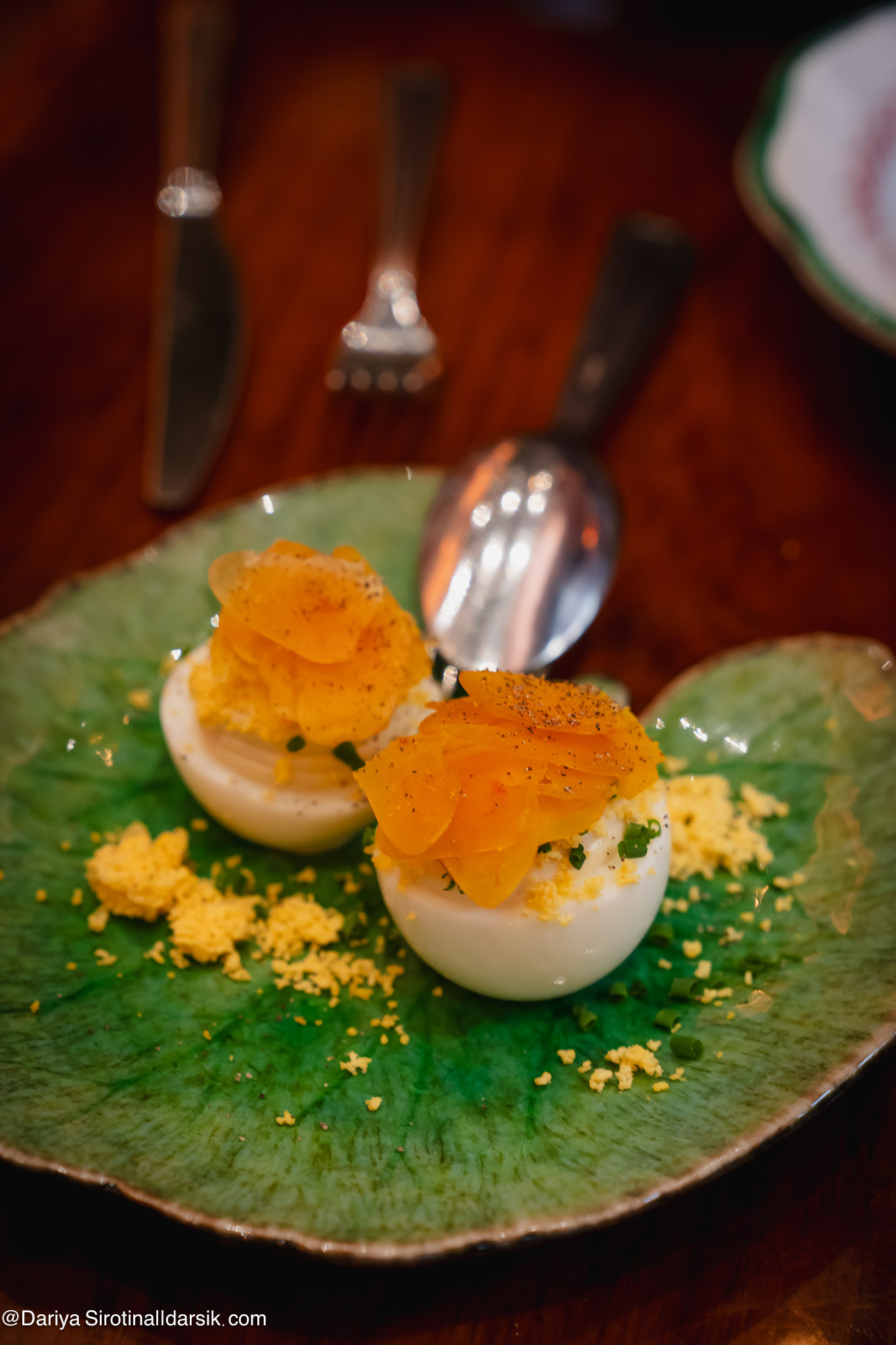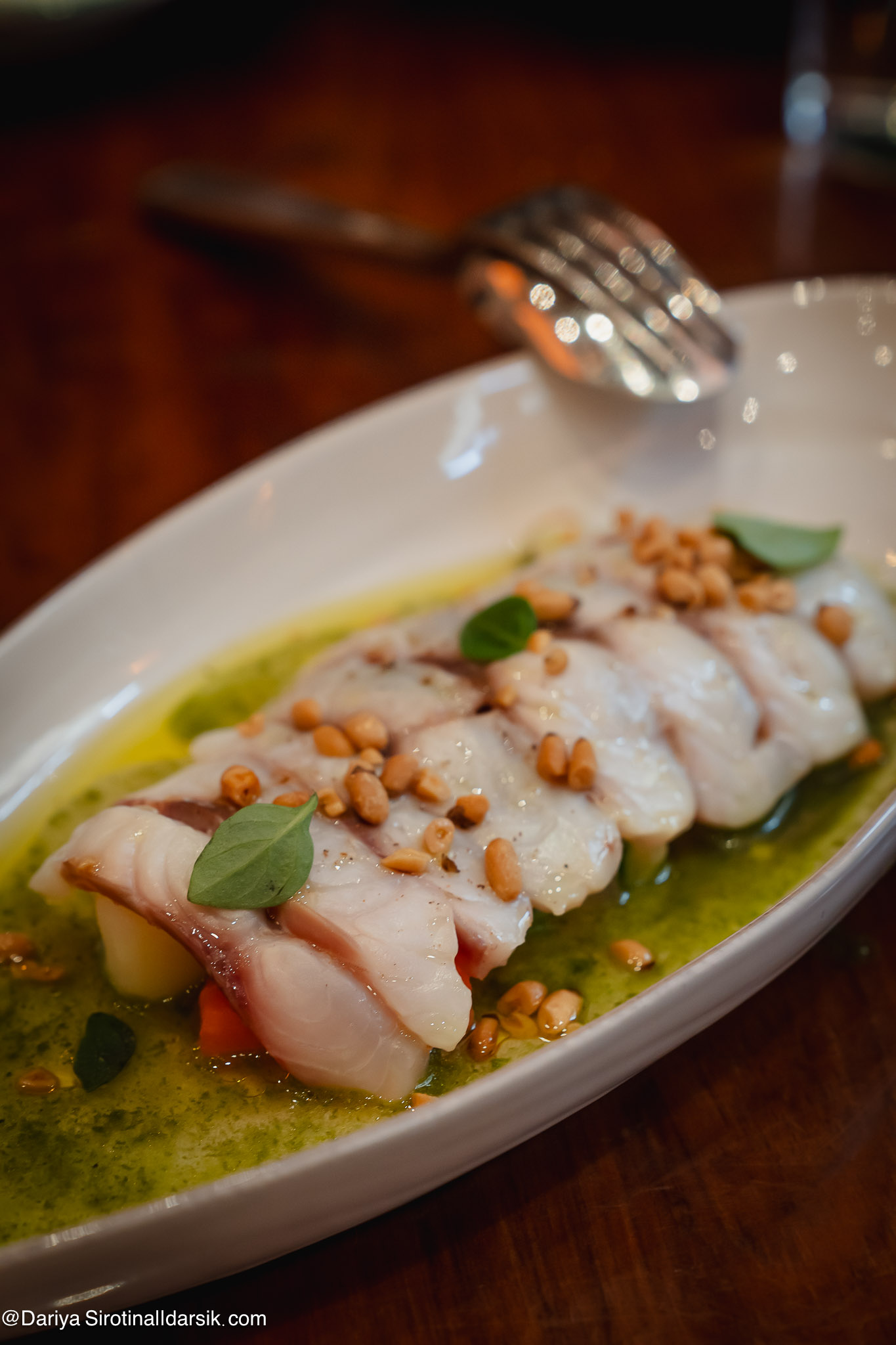По сравнению с предыдущими визитами стали заметны азиатские акценты, которыми Пьеж оживляет традиционную кухню французской ривьеры. Еда стала чуть острее и более пряной. Мои фавориты из текущего меню — сырой тунец, подмаринованный с лимоном, оливковым маслом и кориандром, и нежнейшее филе сибаса с овощным бульоном. Фаворит вневременной — яйца «Мимоза», к которым шеф добавляет боттаргу.